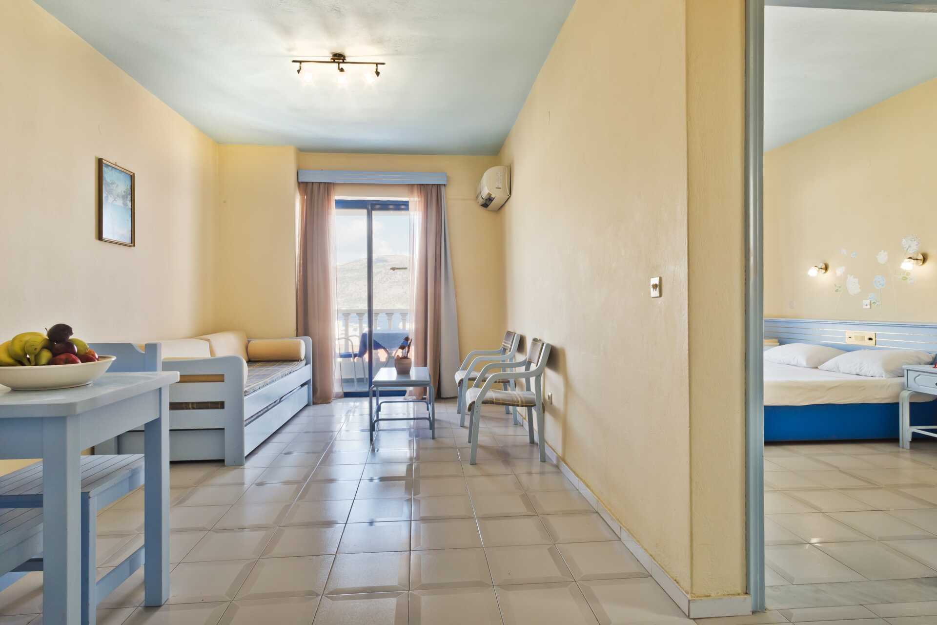 Kaksio parvekkeella, osasta merinäköala. Makuuhuone sekä yhdistetty olohuone ja minikeittiö. Parivuode tai kaksi yhden hengen sänkyä. Lisävuodemahdollisuus vuodesohvasta. Minikeittiössä on keittolevyt, jääkaappi ja yksinkertainen keittiövarustus. Maksuton wifi, ilmastointi ja tallelokero. Tv kansainvälisillä kanavilla. Hiustenkuivain. Kylpyhuoneessa suihku ja wc. Siivous 6 krt/viikko.