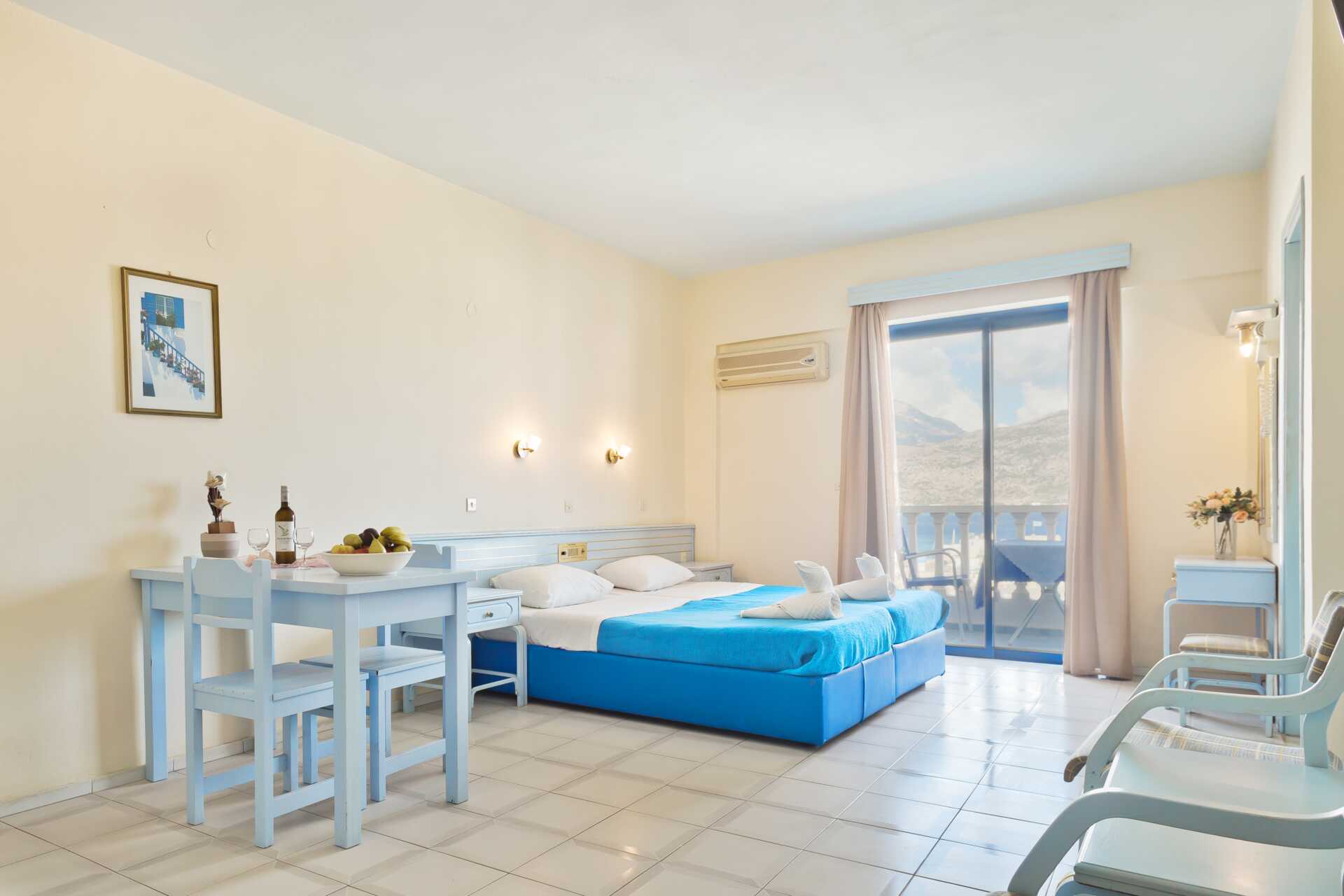 Yksiö parvekkeella ja näkymällä altaalle tai merinäköalalla. Yhdistetty makuuhuone ja minikeittiö. Parivuode tai kaksi yhden hengen sänkyä. Lisävuodemahdollisuus vuodesohvasta. Minikeittiö, jossa on keittolevyt, peruskeittiövälineet ja jääkaappi. Maksuton wifi, ilmastointi ja tallelokero. Tv kansainvälisillä kanavilla. Hiustenkuivain. Kylpyhuoneessa suihku ja wc. Siivous 6 krt/viikko.