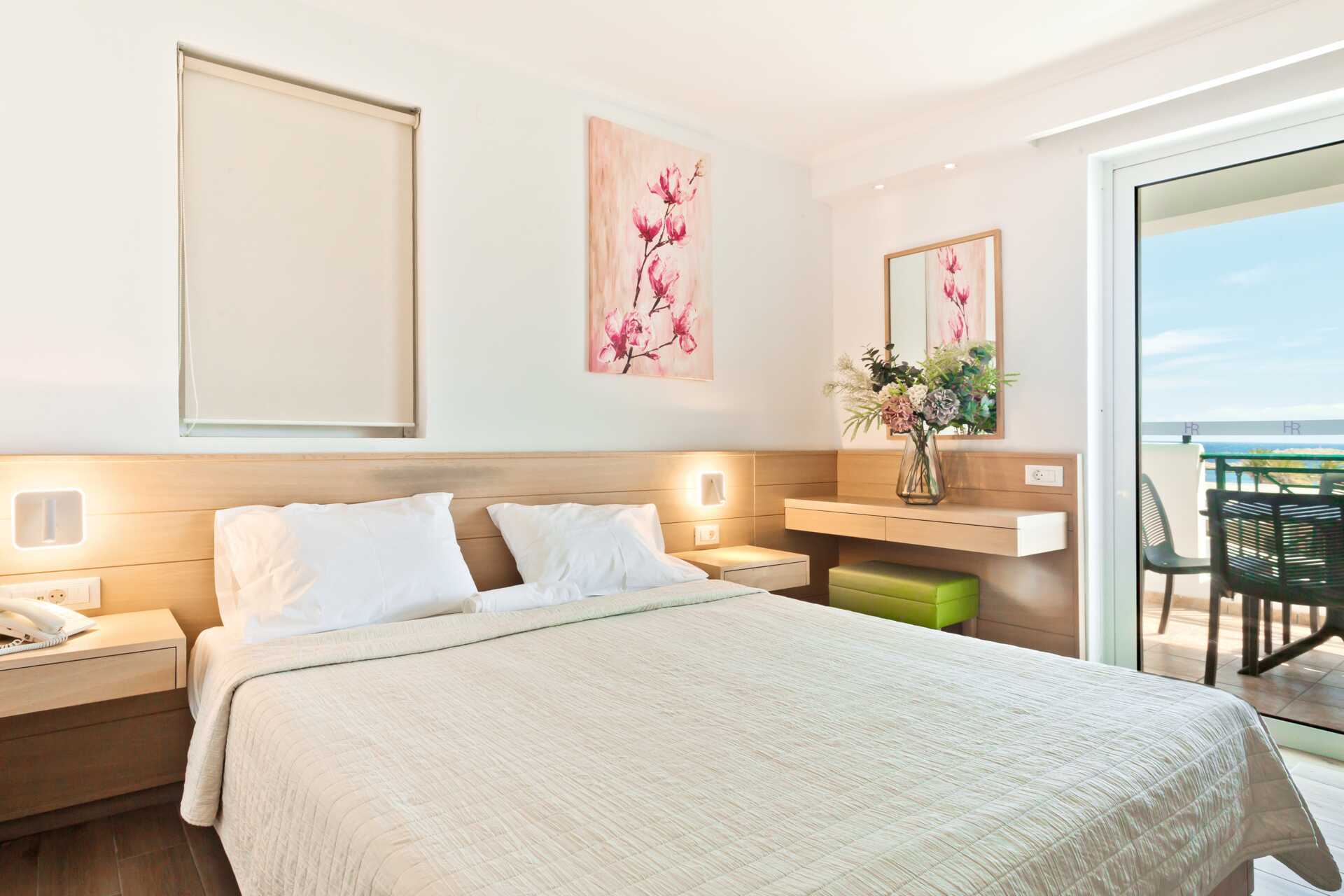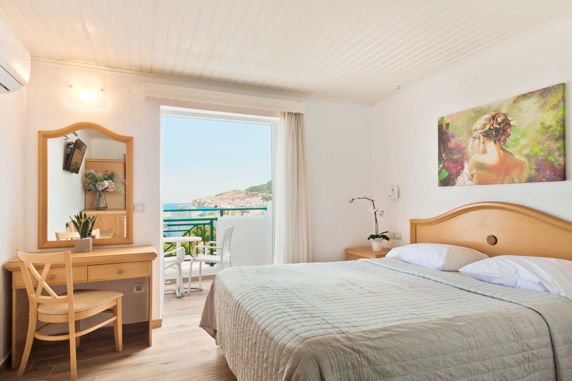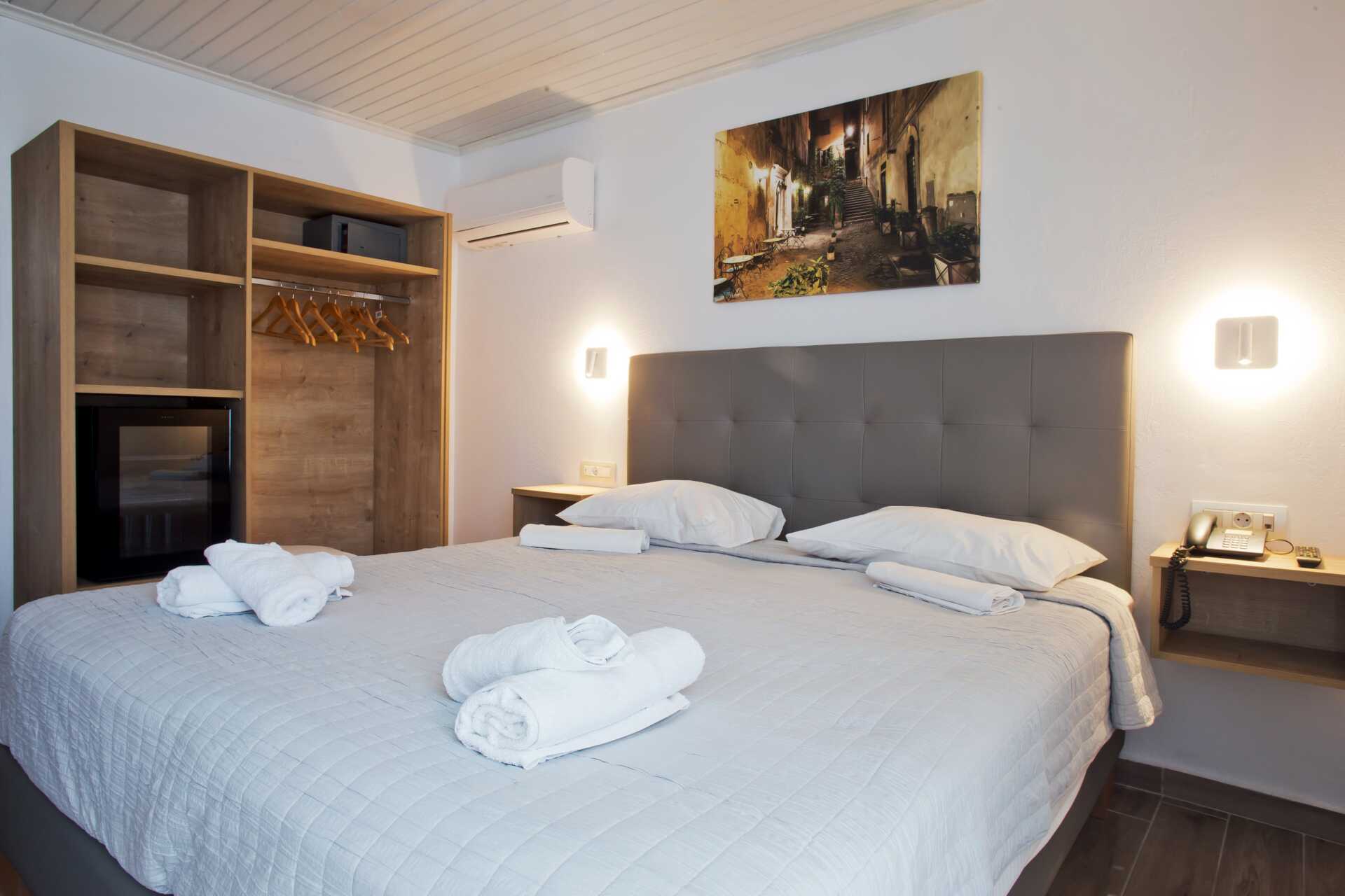 Suurempi kahden hengen huone pienellä parvekkeella. Kahden hengen huoneet sijaitsevat molemmissa rakennuksissa. Parivuode tai kaksi erillistä sänkyä. Lisävuodemahdollisuus vuodesohvaan. Maksuton wifi ja tallelokero. Ilmastointi lisämaksulla. Jääkaappi. Tv kansainvälisillä kanavilla. Kylpyhuoneessa suihku ja wc. Siivous 6 krt/viikko. Huone voi tuntua ahtaalta lisävuodetta käytettäessä.