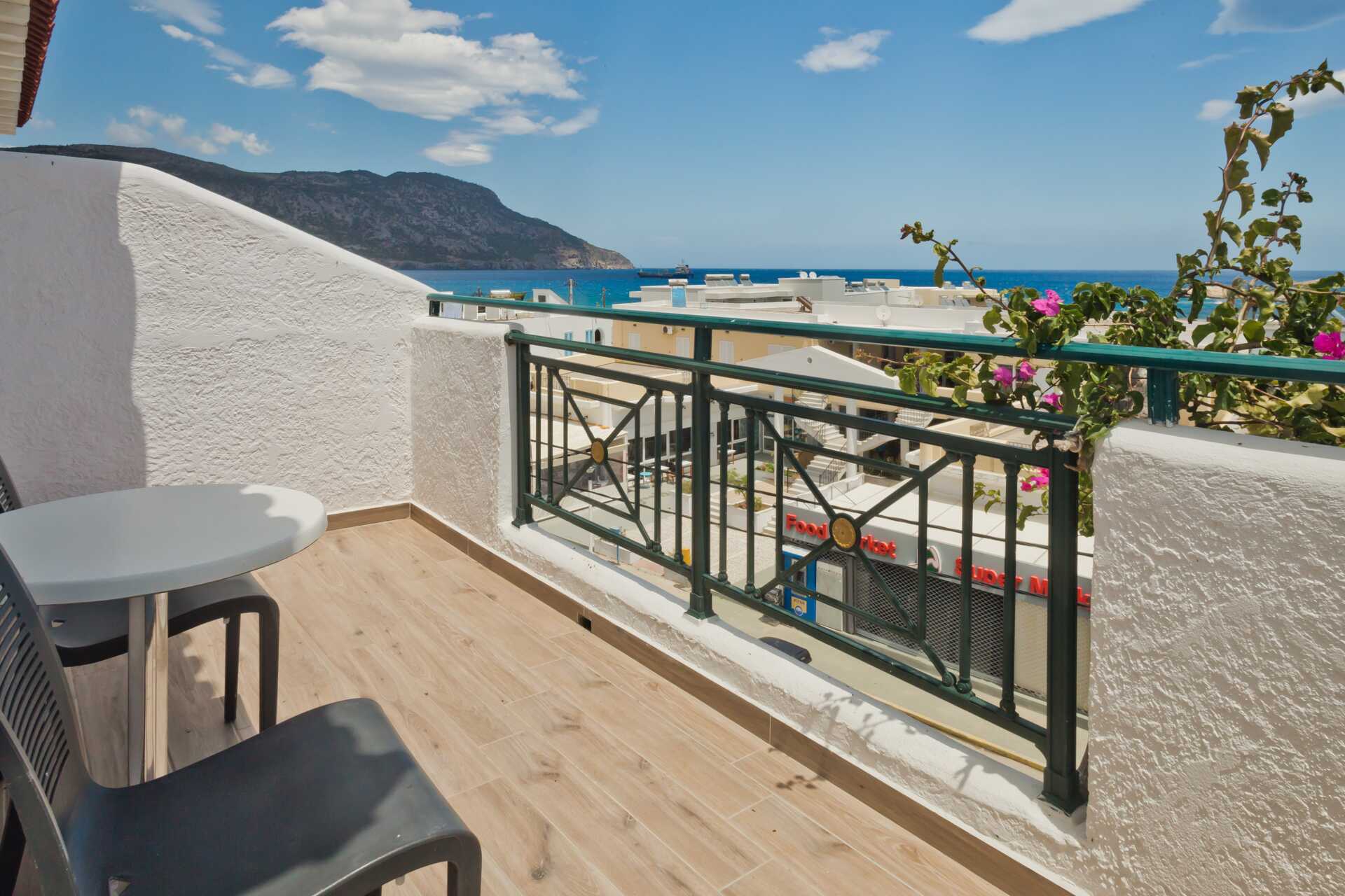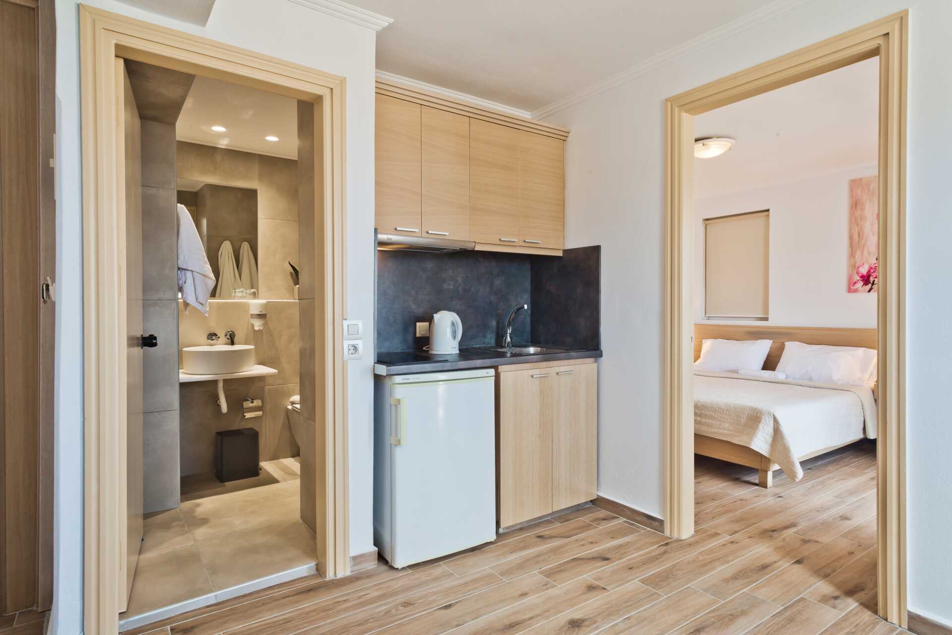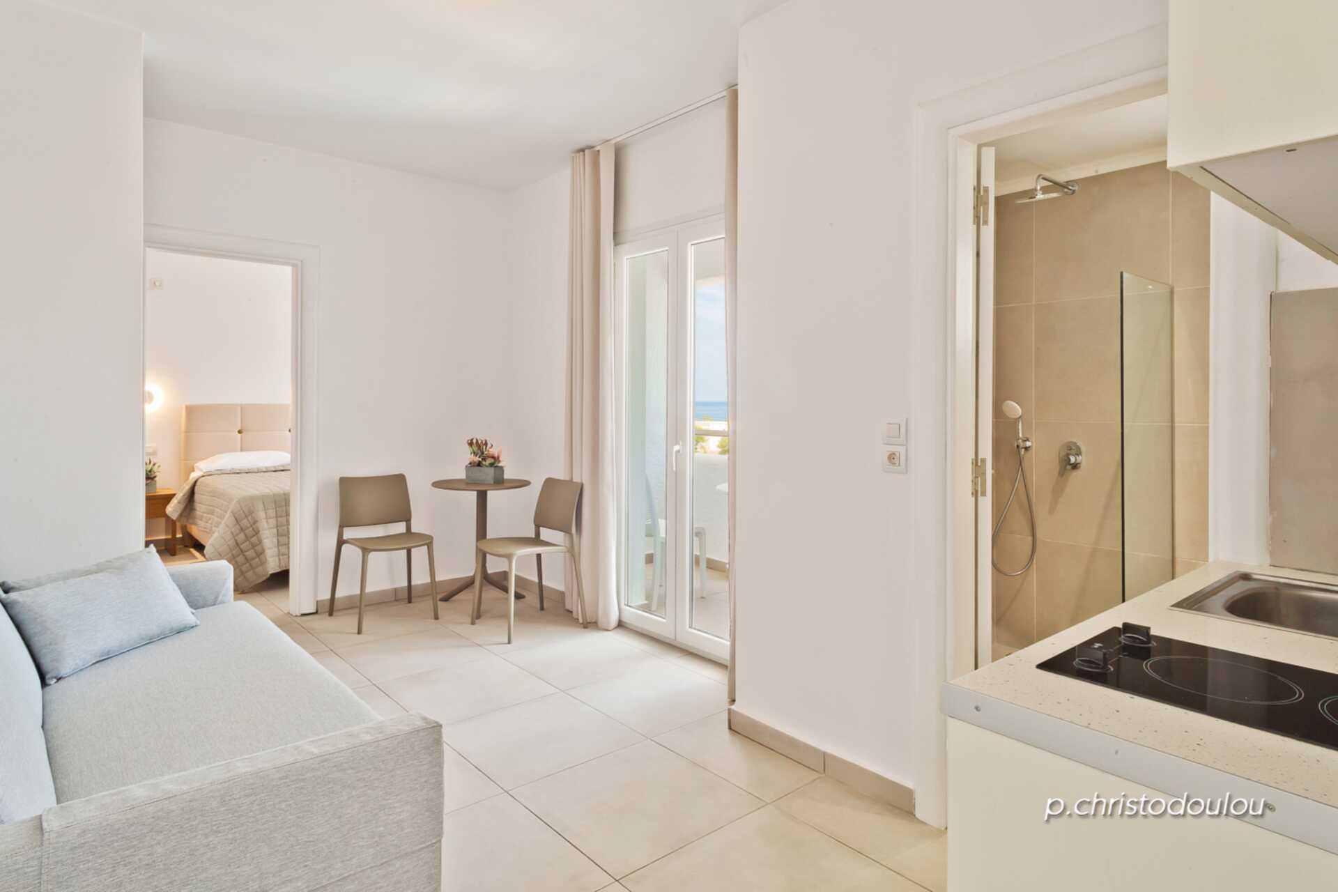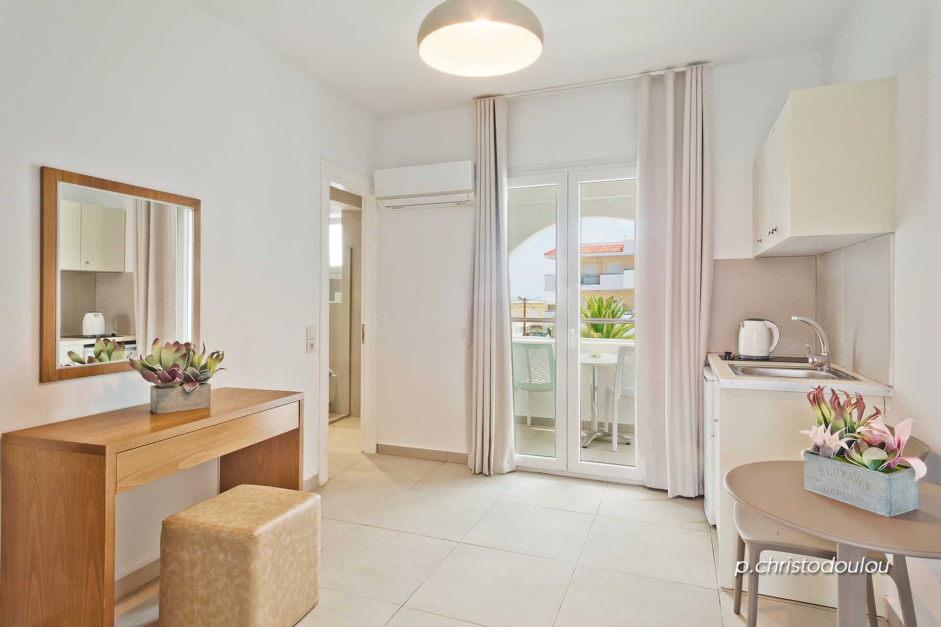 Vaihtelevan kokoisia yksiöitä. Parveke tai terassi. Yhdistetty makuuhuone ja minikeittiö. Osa huoneistoista on remontoitu ja osa on sisustettu perinteiseen tyyliin karpathoslaisin sängyin. Karpathoslainen sänky on korotettu sänky/makuualkovi, johon kuljetaan portaita pitkin. Parivuode tai kaksi yhden hengen vuodetta. Keittolevyt, jääkaappi, vedenkeitin ja yksinkertainen keittovarustus. Tv kansainvälisillä kanavilla. Maksuton wifi ja tallelokero. Ilmastointi lisämaksusta. Suihku ja wc. Siivous 6 krt/viikko.