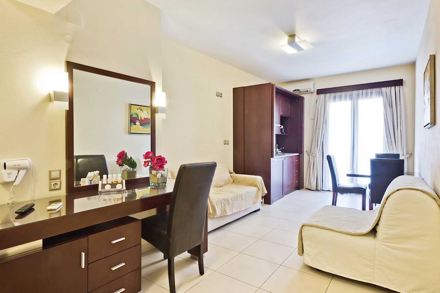 Yksiö parvekkeella. Yhdistetty makuuhuone ja minikeittiö. Parivuode tai kaksi yhden hengen sänkyä. Lisävuodemahdollisuus vuodesohvasta. Minikeittiössä keittolevyt, jääkaappi, voileipägrilli, kahvinkeitin, vedenkeitin ja yksinkertainen keittiövarustus.. Maksuton wifi, ilmastointi ja tallelokero. Tv kansainvälisillä kanavilla. Hiustenkuivaaja ja tossut. Kylpyhuoneessa kylpyamme tai suihku ja wc. Siivous 6 krt/viikko.
