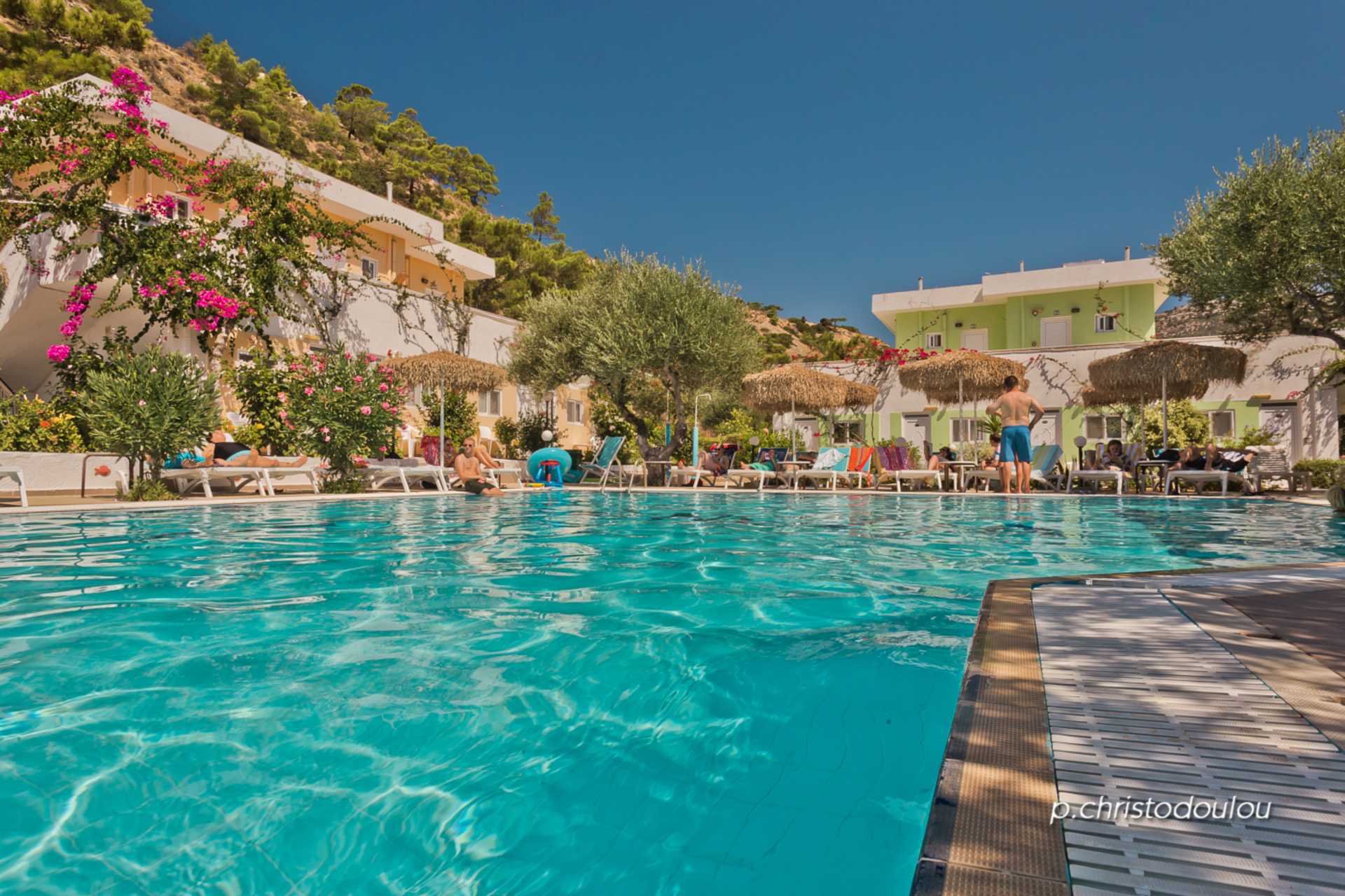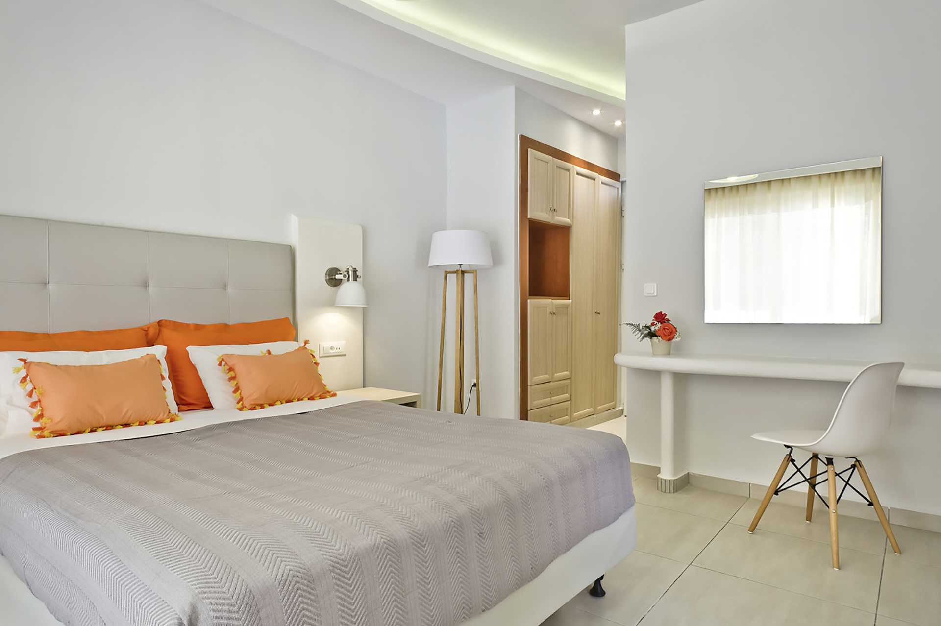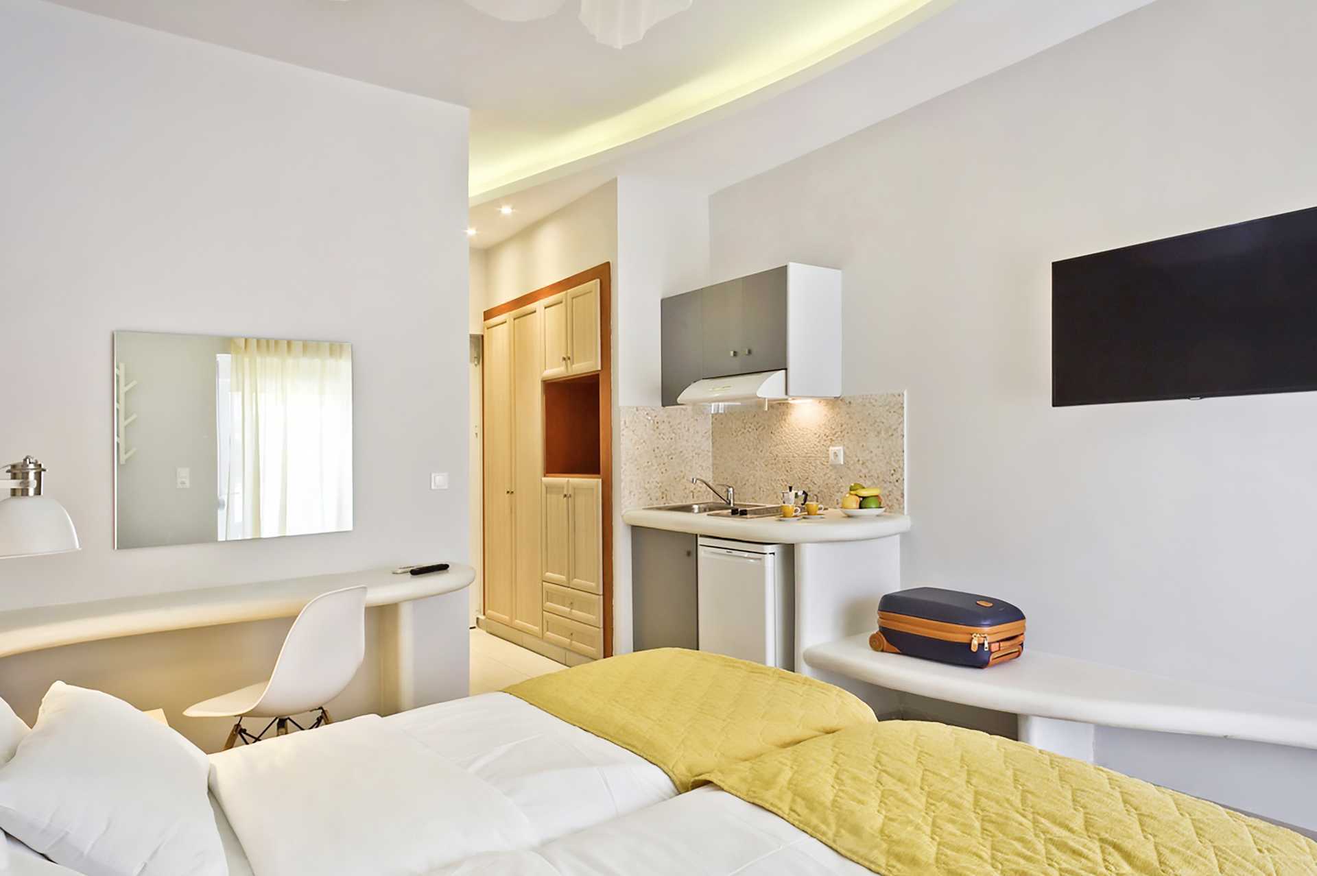 Yksiöitä, joissa on parveke tai maaterassi. Makuuhuoneessa minikeittiö. Yksi parivuode tai kaksi erillistä vuodetta. Lisävuodemahdollisuus vuodesohvasta. Minikeittiössä on keittolevyt, jääkaappi ja yksinkertainen keittiövarustus. Maksuton wifi ja tallelokero. Ilmastointi lisämaksusta. Tv kansainvälisillä kanavilla. Hiustenkuivain. Kylpyhuoneessa suihku ja wc. Siivous 6 krt/viikko. Alle 2-vuotiaat lapset lasketaan lisävuoteella majoittuviksi henkilöiksi.