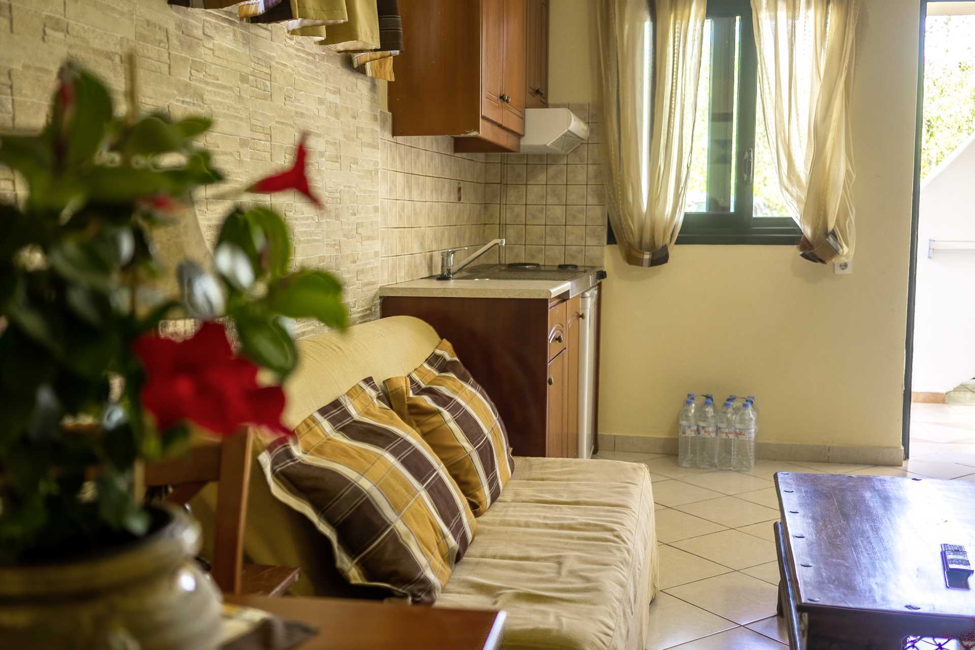 Yksiö alennetulla maatasolla ja maaterassilla. Huoneistot sijaitsevat päärakennusta vastapäätä olevassa rakennuksessa. Kaksi yhden hengen sänkyä. Muutamat huoneistot on sisustettu perinteisillä karpathoslaisilla sängyillä. Minikeittiössä keittolevyt, jääkaappi, vedenkeitin ja yksinkertainen keittiövarustus. Maksuton wifi ja tallelokero. Ilmastointi lisämaksusta. Tv kansainvälisillä kanavilla. Hiustenkuivain. Suihku ja wc. Siivous 6 krt/viikko.