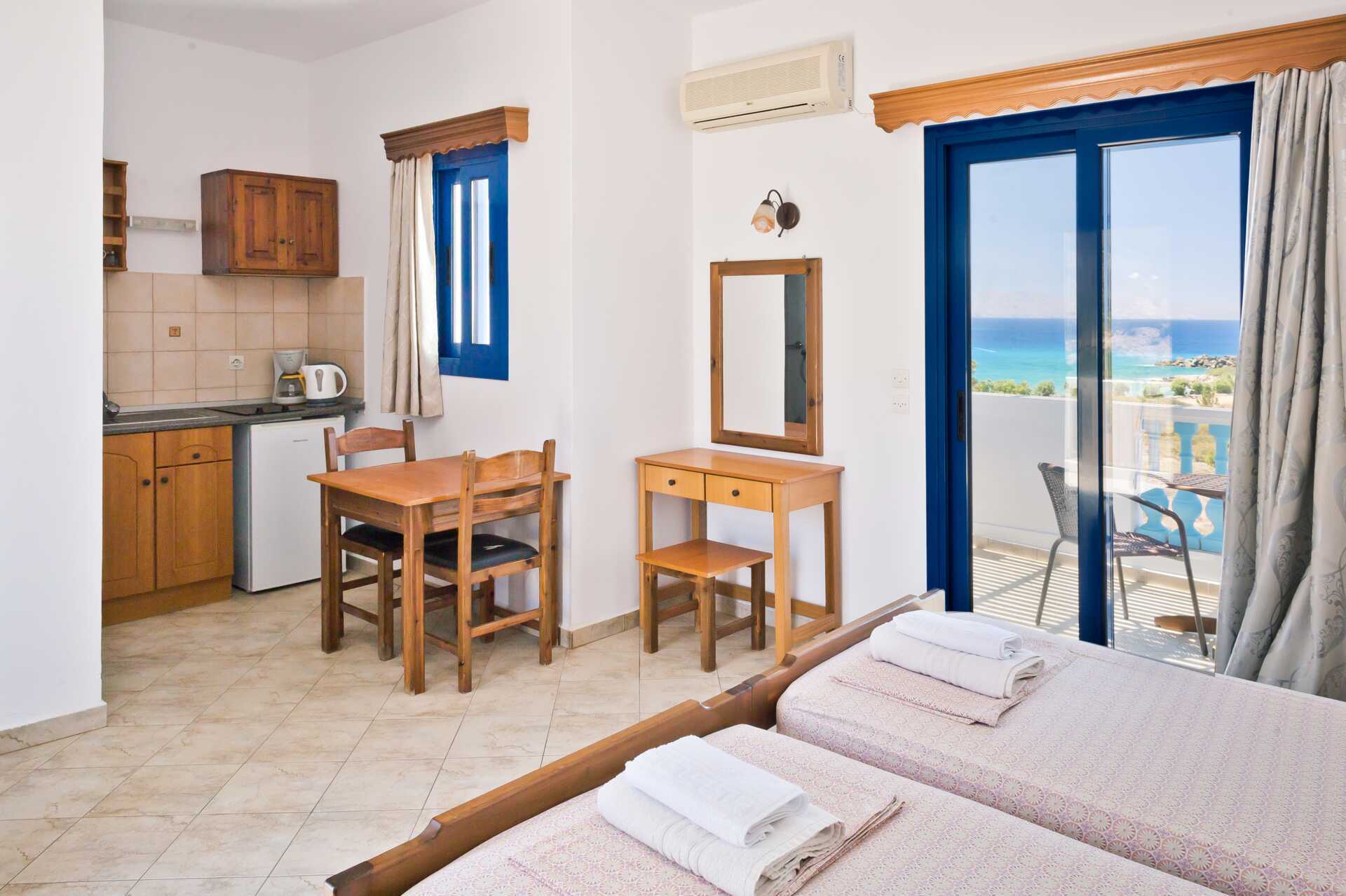 Huoneistohotelli on vain muutaman minuutin kävelymatkan päässä Potalin rannalta, joten kun kaipaat vilvoittelua, meri ei ole kaukana. Viihtyisän Lefkoksen keskustaan on hieman pidempi kävelymatka. Violetti kalastajakylä on täydellinen niille, jotka haluavat vain rentoutua, ottaa rennosti ja nauttia hiljaisuudesta. Hämärän laskeutuessa pöydät katetaan pieniin tavernoihin sataman ja rannan varrella, joissa voit nauttia aidoista kreikkalaisista ruoista ja erikoisuutena on tietenkin tuore kala. Maksuton wifi koko hotellialueella. Vastaanotto avoinna aamuisin.