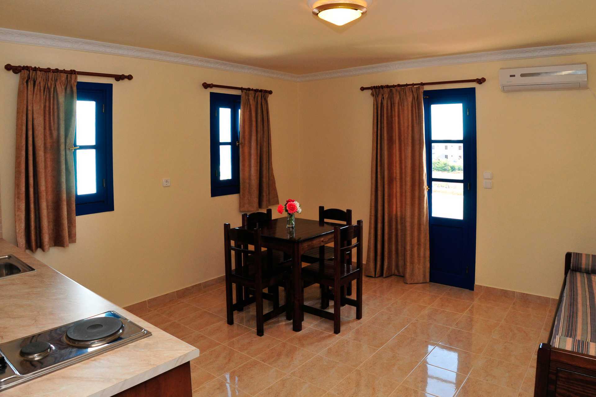 Yksiö, parvekkeella tai terassilla. Yhdistetty makuuhuone ja minikeittiö. Parivuode tai kaksi yhden hengen sänkyä. Lisävuodemahdollisuus vuodesohvasta. Minikeittiö, jossa jääkaappi, keittolevyt ja peruskeittiövälineet. Kahvinkeitin. Maksuton wifi. Ilmastointi ja tallelokero lisämaksusta. Tv kansainvälisillä kanavilla. Hiustenkuivain. Kylpyamme tai suihku ja wc. Siivous 6 krt/viikko.