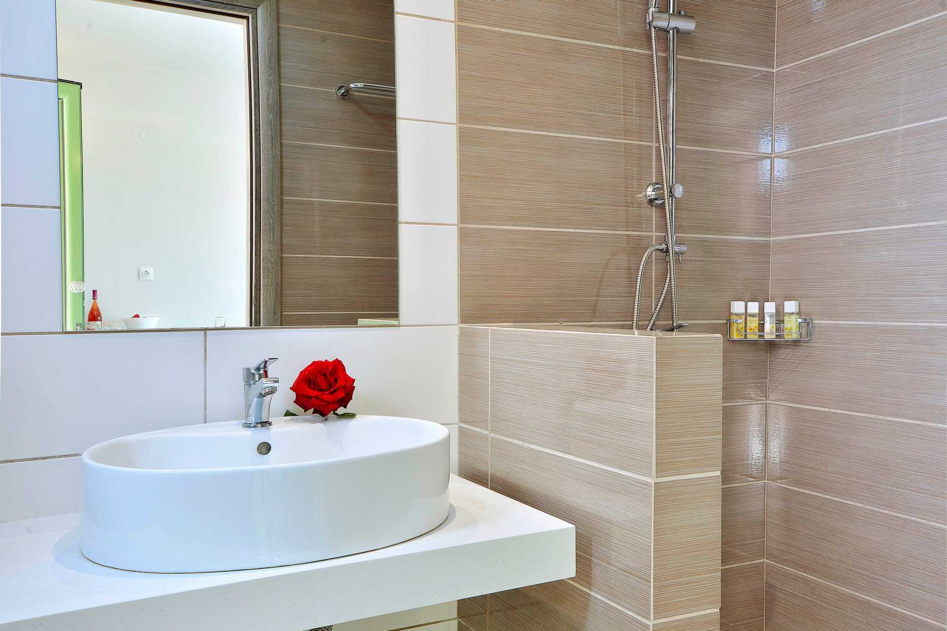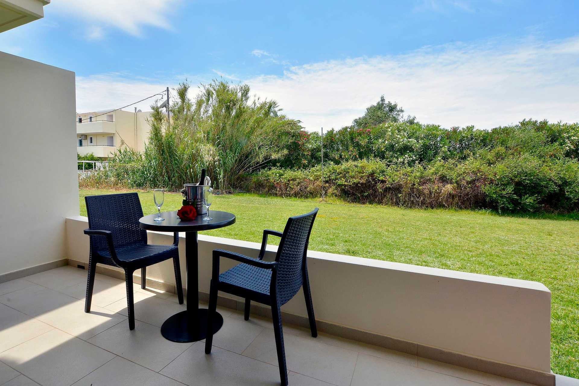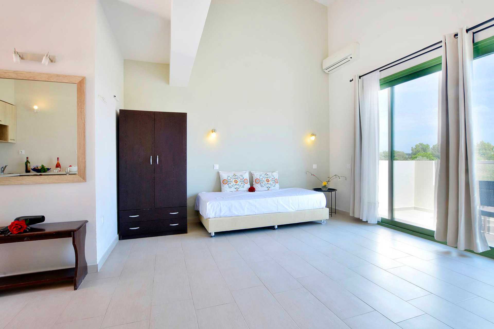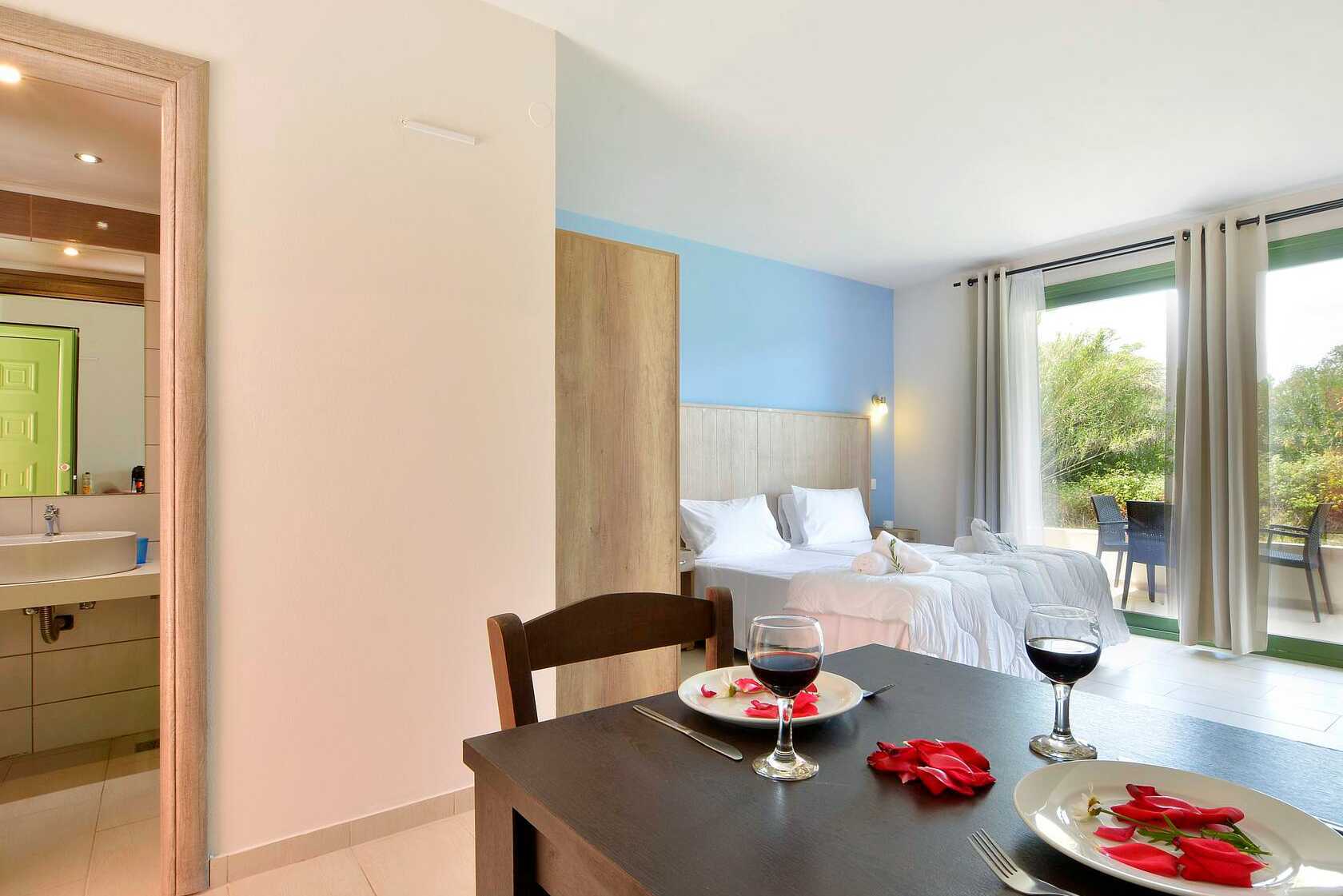 Kaksio jossa maaterassi Yhdistetty makuuhuone ja minikeittiö. Kaksi yhden hengen sänkyä. Lisävuodemahdollisuus vuodesohvasta. Minikeittiössä keittolevyt, jääkaappi, kahvinkeitin ja yksinkertainen keittiövarustus. Maksuton wifi. Ilmastointi ja tallelokero lisämaksusta. Tv kansainvälisillä kanavilla. Hiustenkuivain. Kylpyamme tai suihku ja wc. Siivous 6 krt/viikko.
