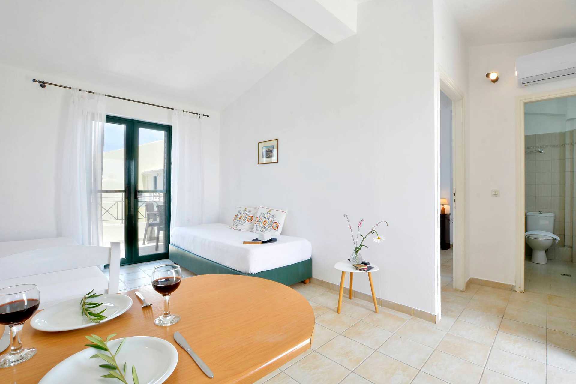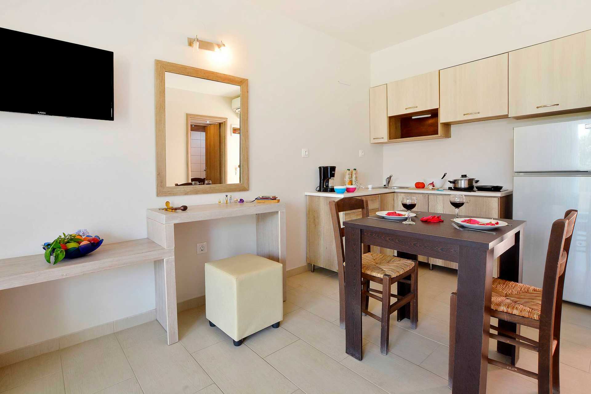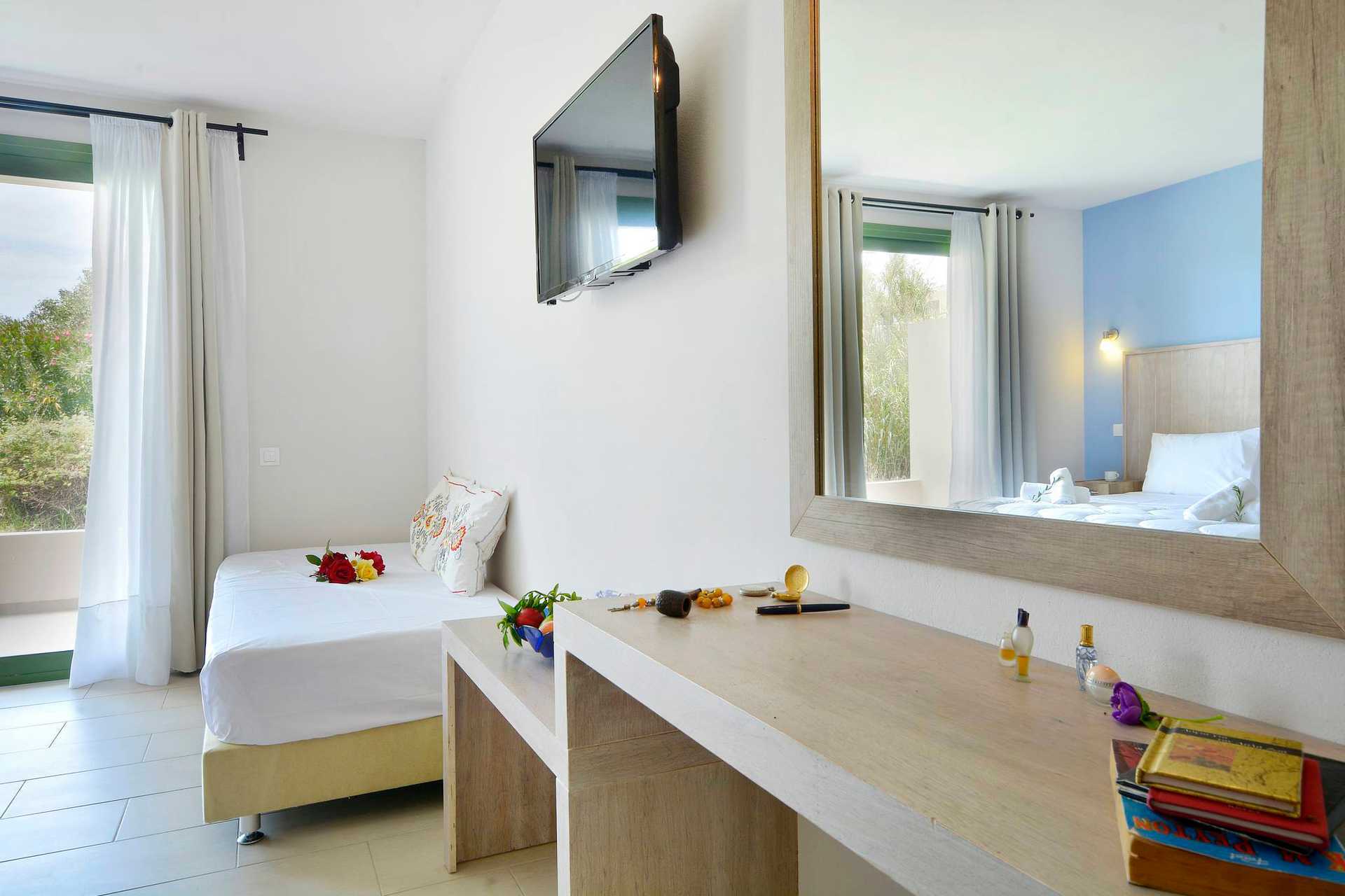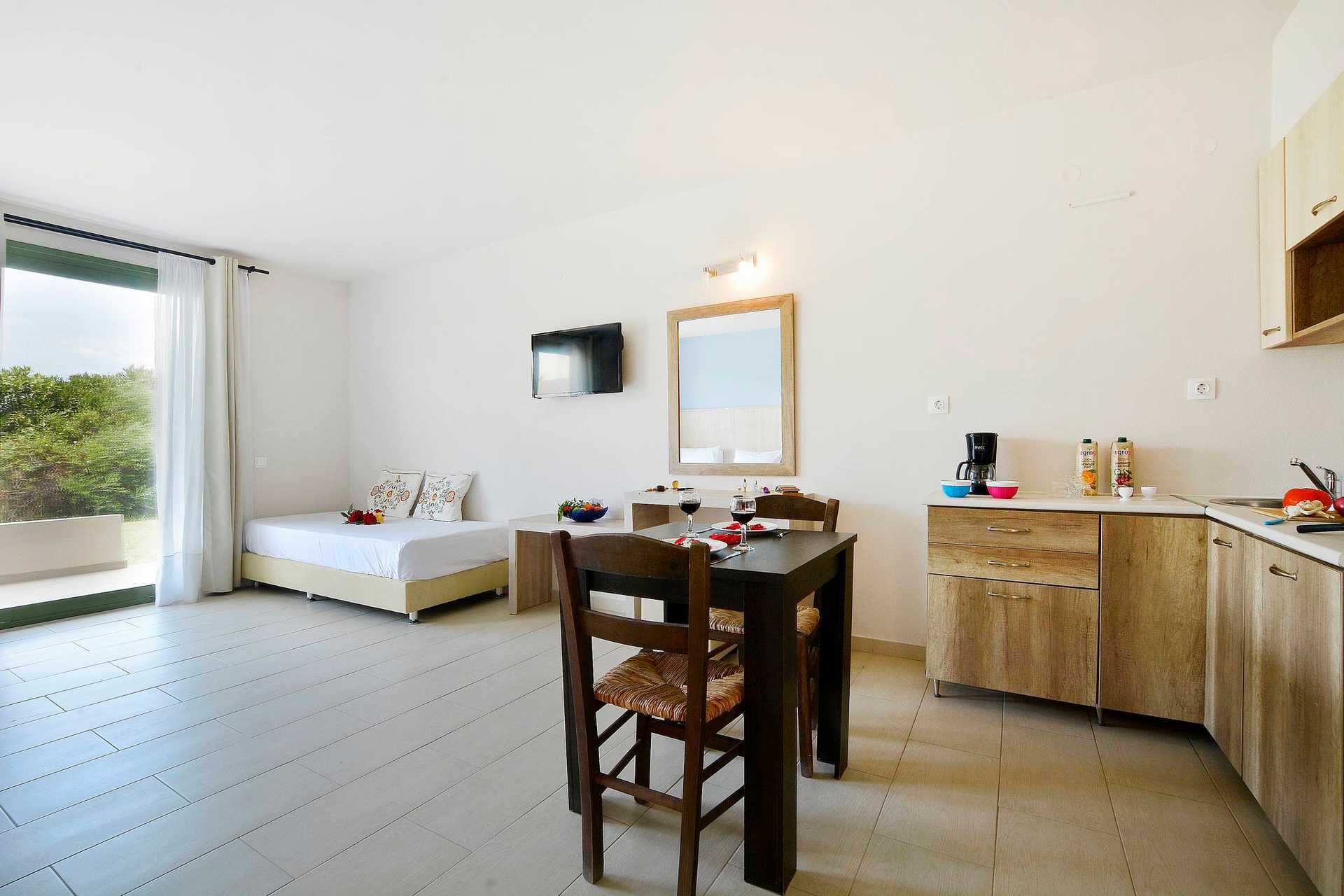 Kaksio parvekkeella tai maaparvekkeella. Makuuhuone ja yhdistetty olohuone ja minikeittiö. Kaksi yhden hengen sänkyä. Mahdollisuus lisävuoteisiin kahteen erilliseen sänkyyn tai vuodesohvaan. Minikeittiössä keittolevyt, jääkaappi, vedenkeitin, kahvinkeitin ja yksinkertainen keittiövarustus. Ruokailutila on ulkotilassa. Maksuton wifi. Ilmastointi ja tallelokero lisämaksusta. Tv kansainvälisillä kanavilla. Hiustenkuivain. Kylpyamme tai suihku ja wc. Siivous 6 krt/viikko.