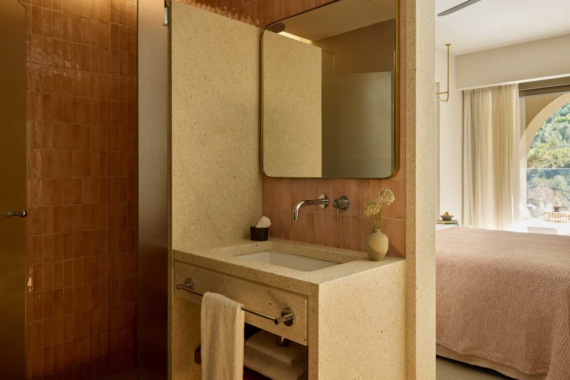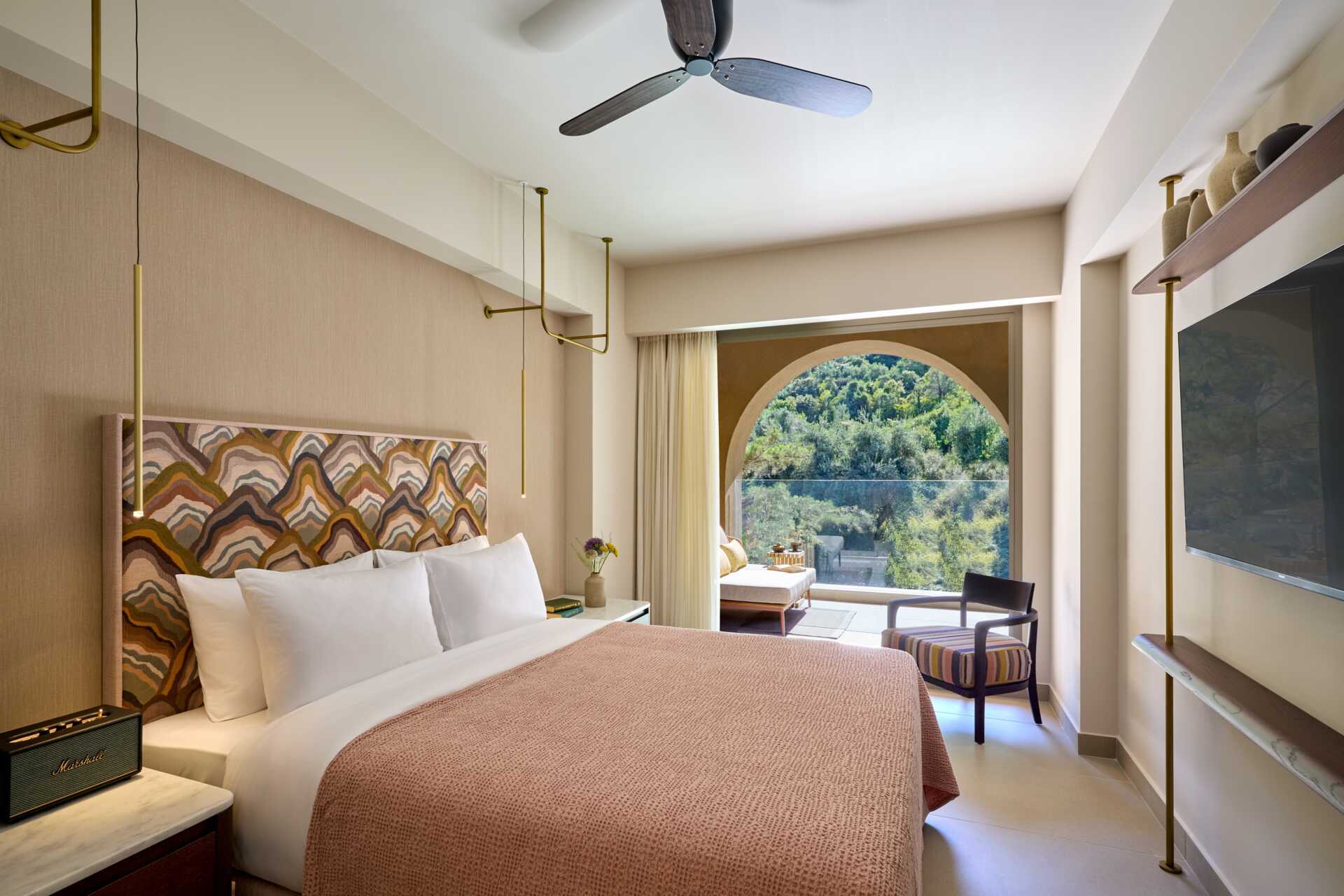 Kahden hengen huone maaterassilla, jossa on oma infinity-allas ja merinäköala. Portaat ylös altaalle. Parivuode tai kaksi yhden hengen sänkyä. Maksuton wifi, ilmastointi ja tallelokero. Minibaari lisämaksulla. Vedenkeitin, kahvia ja teetä. Nespresso-kahvinkeitin - kapselit sisältyvät hintaan. Tv kansainvälisillä kanavilla. Kylpytakit. Hiustenkuivain. Kylpyhuoneessa suihku ja wc. Siivous 7 krt/viikko.