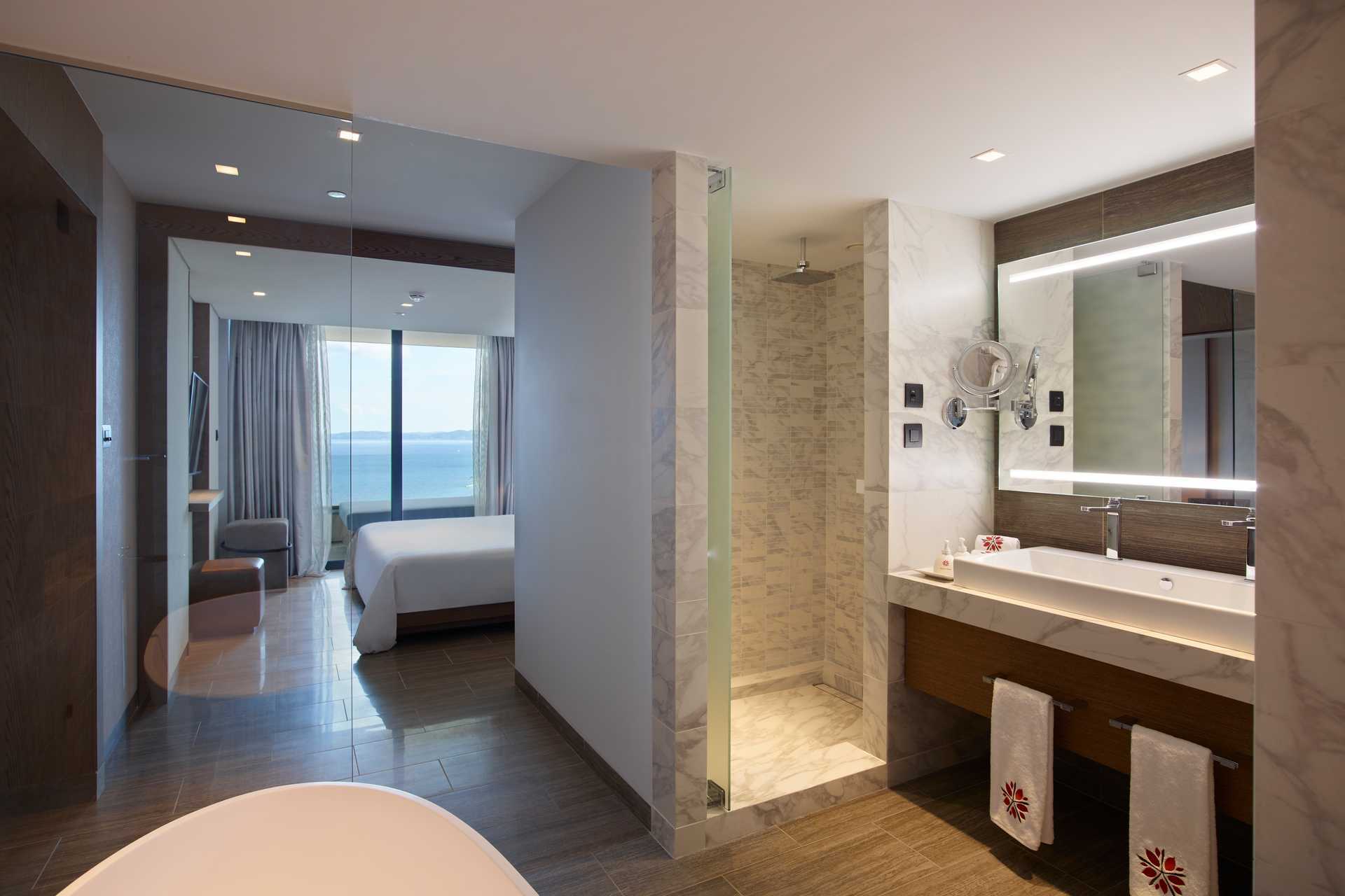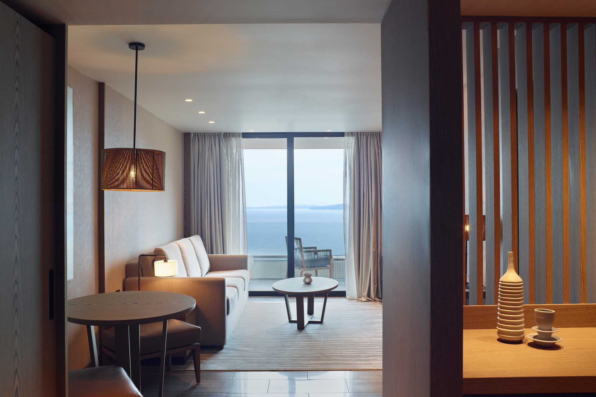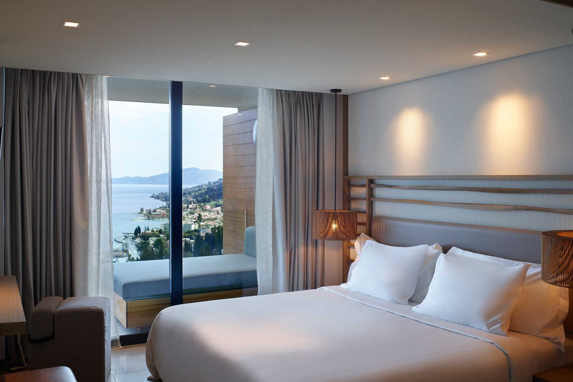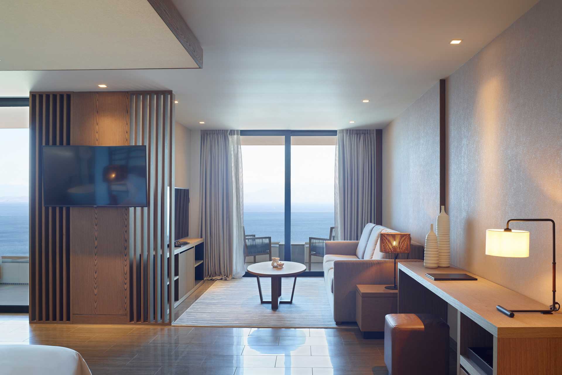 Perhehuone, parvekkeella merinäköalalla. Makuuhuone ja erillinen olohuone. Huoneiden välillä liukuovi. Parivuode. Lisävuodemahdollisuus vuodesohvasta. Maksuton ilmastointi, wifi ja tallelokero. Minibaari. Nespresso-kahvinkeitin - kuusi kapselia per päivä maksutta. Tv kansainvälisillä kanavilla. Kylpytakit ja tossut. Kylpytuotteita. Avoin kylpyhuoneen pohjaratkaisu, kylpyammeella ja pesualtaalla. Hiustenkuivain. Suihku ja wc. Siivous 7 krt/viikko. Alle 2-vuotiaat lapset lasketaan lisävuoteessa majoittuviksi henkilöiksi.