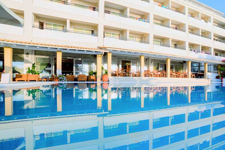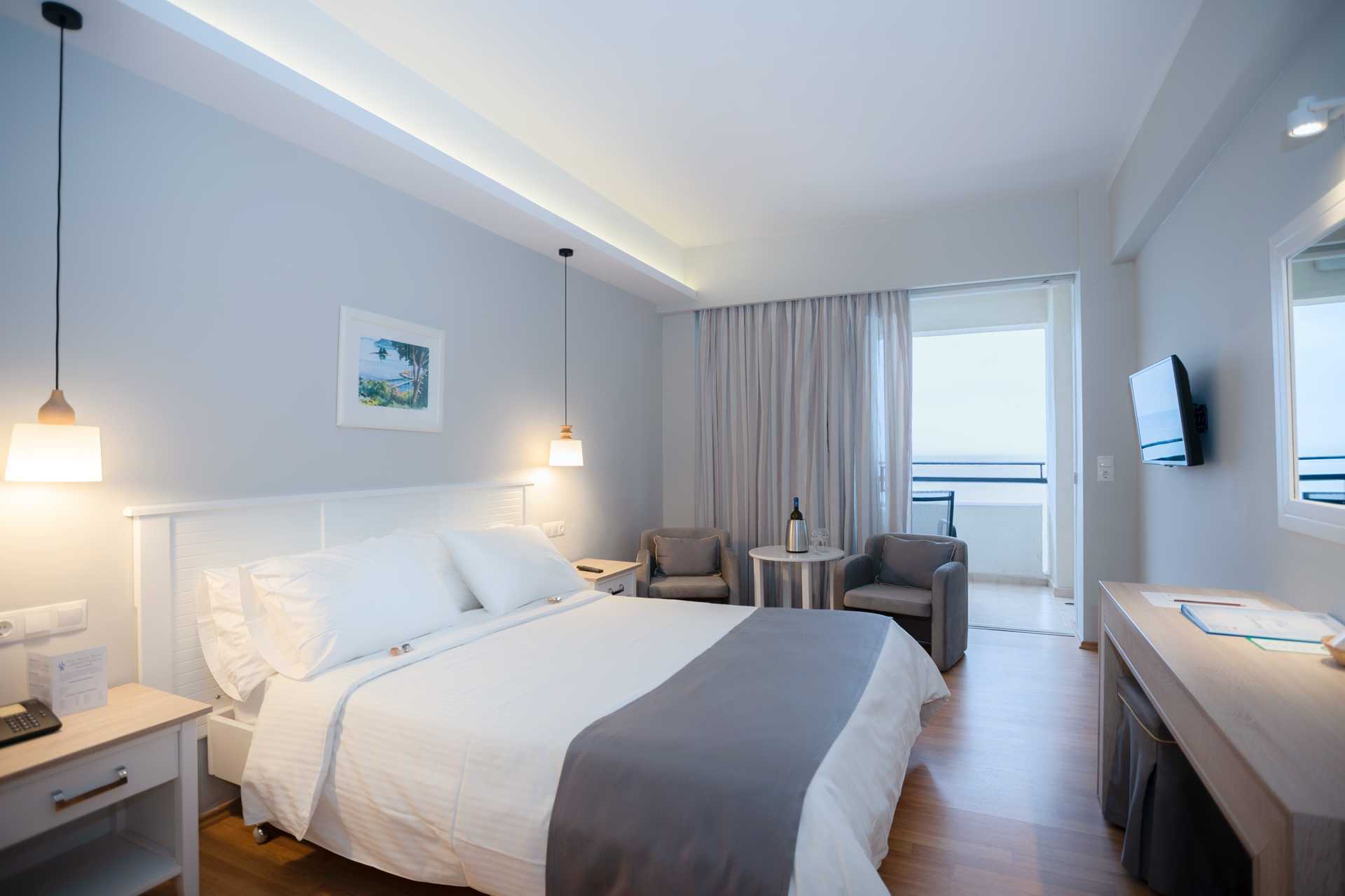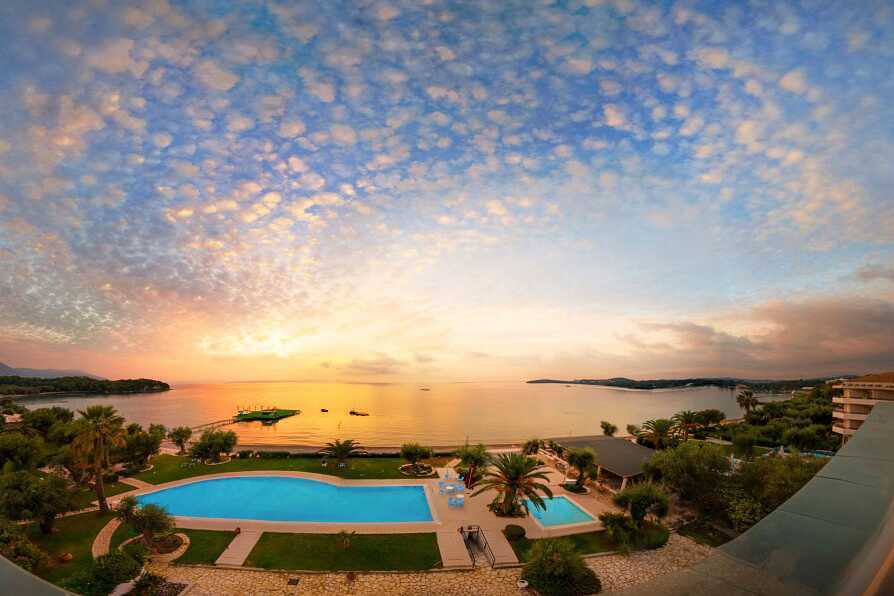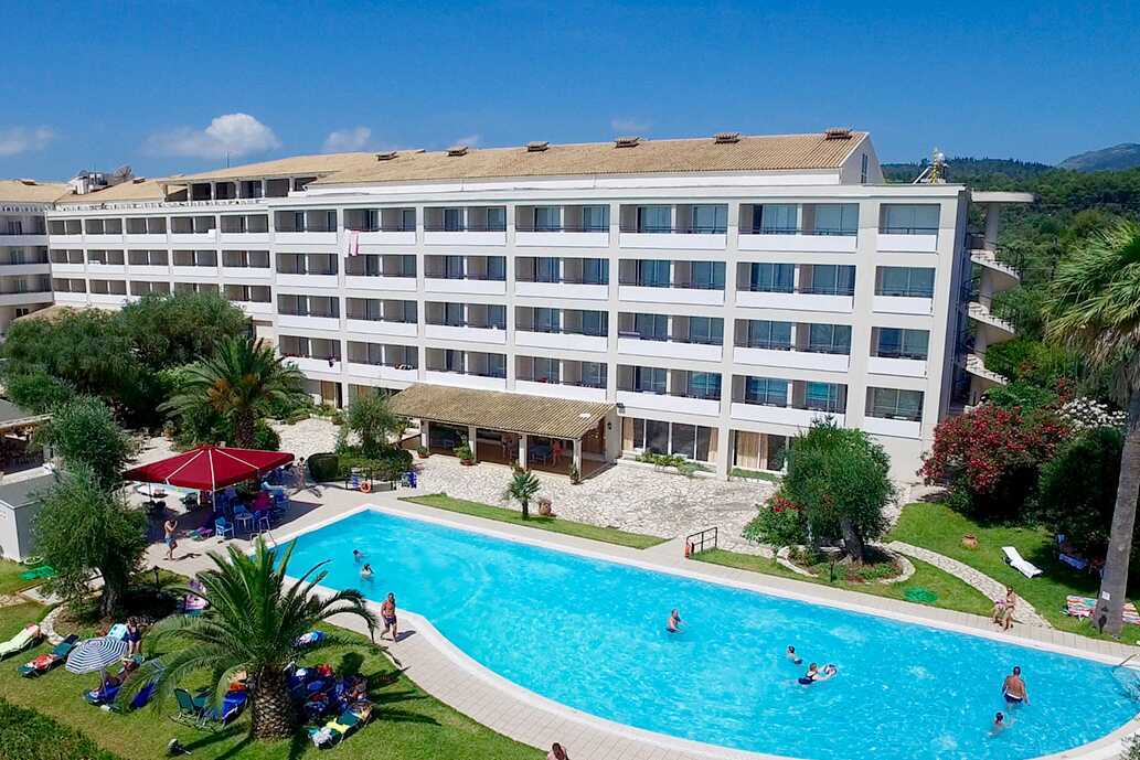 Meillä oli huone merinäköalalla ja se oli kyllä hieno. Hotelli on aivan rannassa, siellä on uima-altaat, aurinkotuoleja ja rantabaari. Hotelli on rauhallinen, ilta-ohjelma alkaa rantabaarissa yhdeksän aikoihin ja päättyy ennen yhtätoista. Se kuuluu huoneeseen, mutta ei häirinnyt ainakaan itseäni. Aamupala oli etelän hotelliksi oikein hyvä ja yllättävän monipuolinen, muita aterioita emme syöneet hotellilla. Rannassa on aktiviteetteja ja jos auringonotto kyllästyttää, niin Korfun kaupunkiin pääsee bussilla.