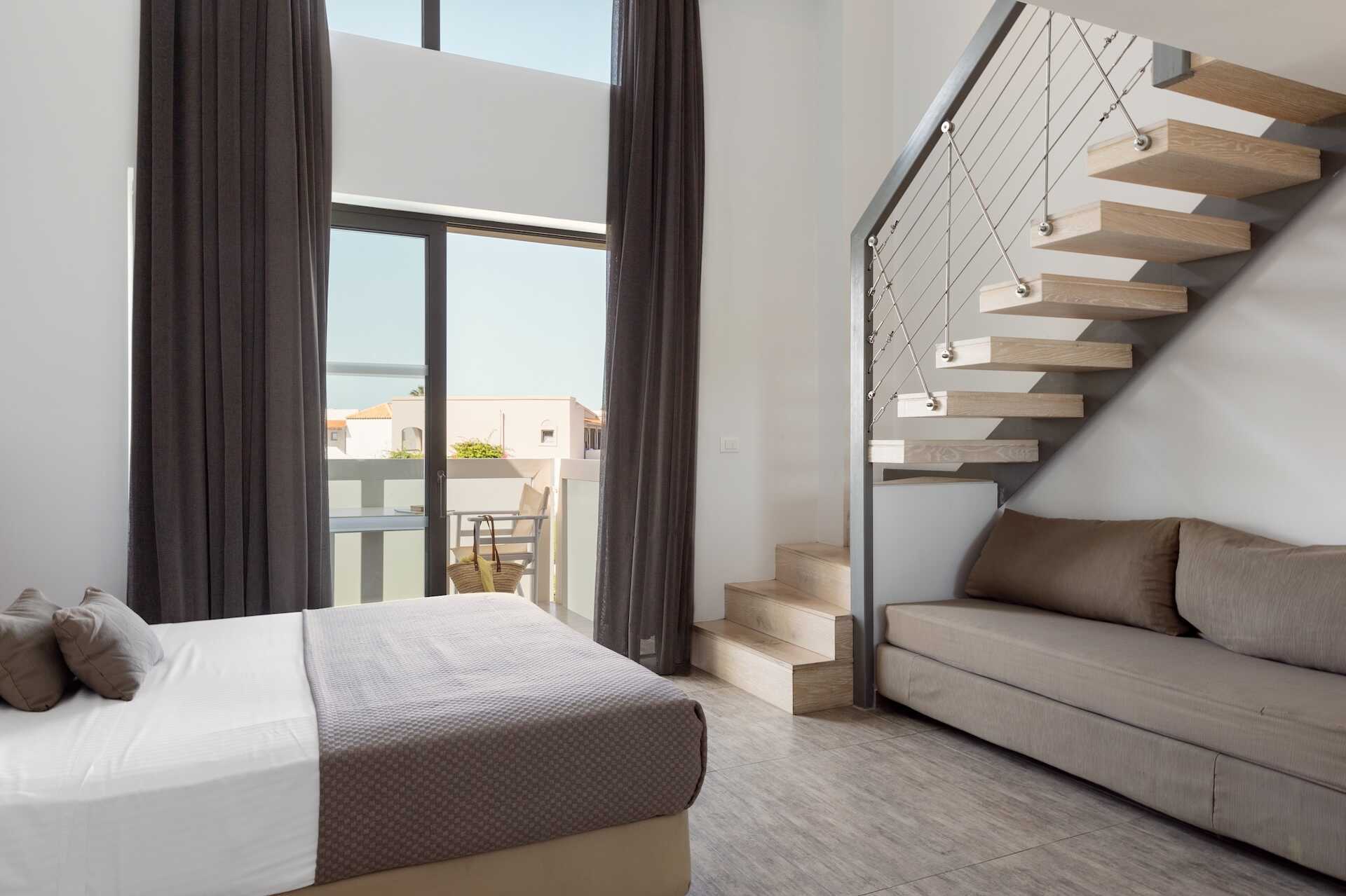 Kaksikerroksisia perhehuoneita, joissa parveke tai terassi ja osassa merinäköala. Alemmassa kerroksessa on parivuode ja lisävuodemahdollisuus vuodesohvasta sekä kylpyhuone, jossa hiustenkuivain, amme ja suihku tai pelkkä suihku ja wc. Yläkerrassa on makuuhuone, jossa kaksi erillistä vuodetta sekä kylpyhuone, jossa hiustenkuivain, suihku ja wc. Kerrosten välissä on ovi. Vedenkeitin sekä kahvin ja teen keittomahdollisuus. Maksuton minibaari päivittäisellä täytöllä: vettä, viiniä, mehua, olutta ja virvoitusjuomia. Maksuton wifi, ilmastointi ja tallelokero. Tv satelliittikanavilla. Siivous 7 krt/viikko. Tässä huonetyypissä alle 2-vuotiaat lapset sisältyvät huoneessa majoittuvien henkilöiden enimmäismäärään.