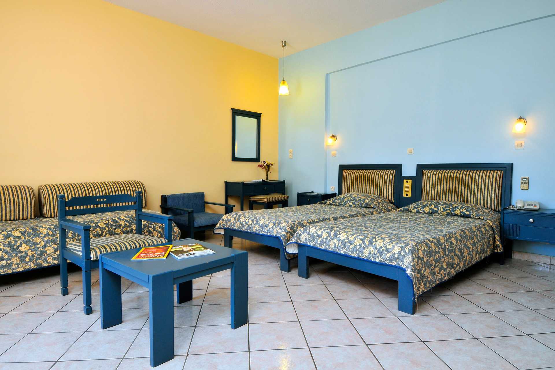 Perhehuone parvekkeella. Kaksi yhden hengen sänkyä. Lisävuodemahdollisuus vuodesohvasta. Maksuton wifi. Ilmastointi lisämaksusta. Tallelokero vastaanotossa maksua vastaan. Jääkaappi. Joissakin huoneissa on kokolattiamatto. Tv kansainvälisillä kanavilla. Hiustenkuivain. Kylpyamme tai suihku ja wc. Siivous 6 krt/viikko.
