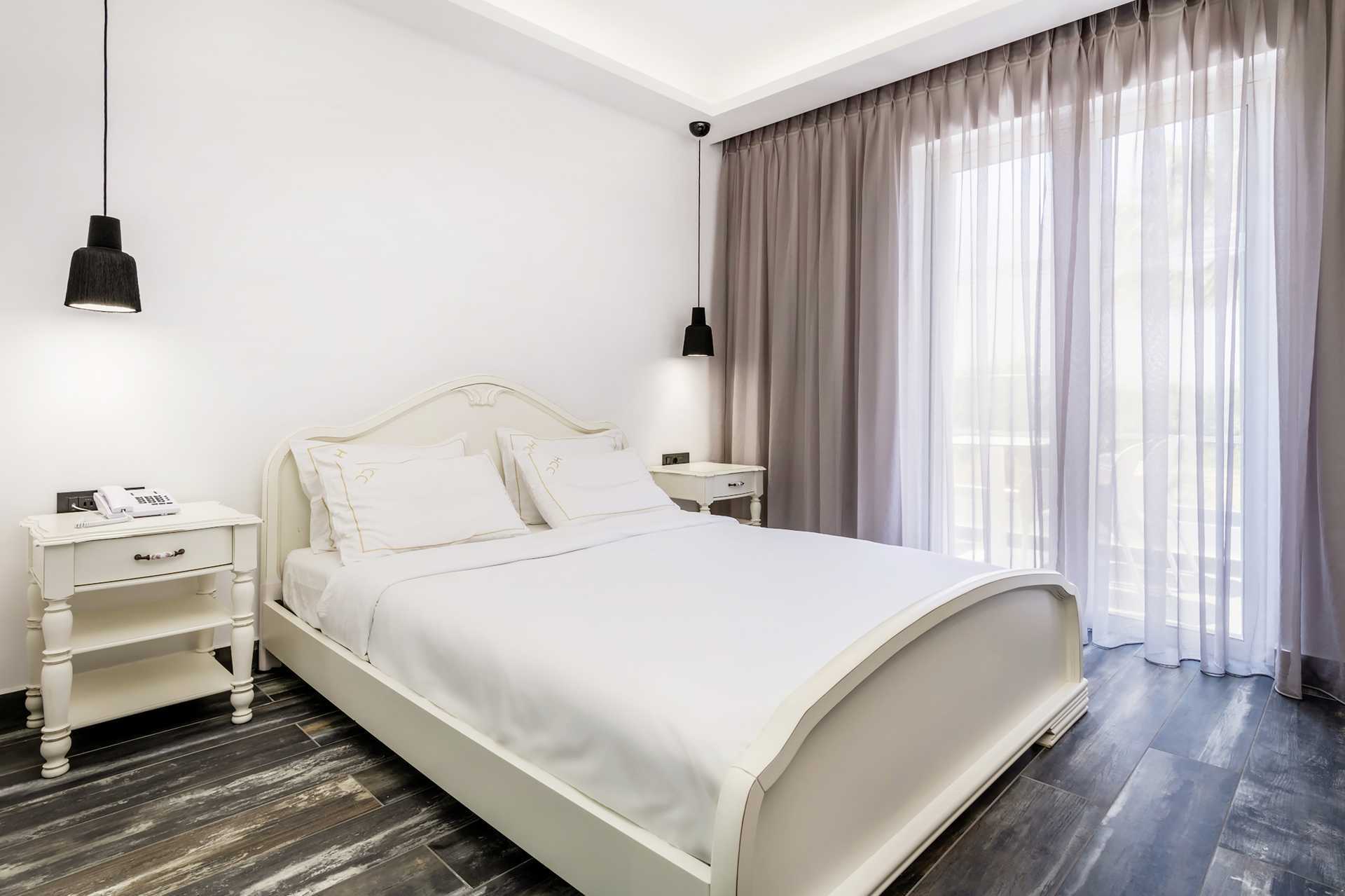 Kahden hengen huone parvekkeella tai terassilla. Parivuode. Maksuton wifi, tallelokero ja ilmastointi. Jääkaappi. Vedenkeitin, kahvia ja teetä. Tv kansainvälisillä kanavilla. Kylpytakit ja tossut. Hiustenkuivain. Kylpyhuoneessa suihku ja wc. Siivous 7 krt/viikko.