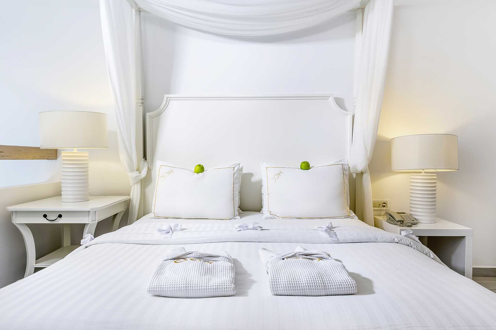 Kahden hengen huone parvekkeella tai terassilla tai maaterassilla ja allasnäköalalla. Parivuode. Maksuton wifi, ilmastointi ja tallelokero. Minibaari. Vedenkeitin, kahvia ja teetä. Nespresso kahvikone. Vesi, viini ja hedelmät ovat huoneessa saavuttaessa. Tv kansainvälisillä kanavilla. Kylpytakit ja tossut. Hiustenkuivain. Amme ja wc. Siivous 7 krt/viikko.