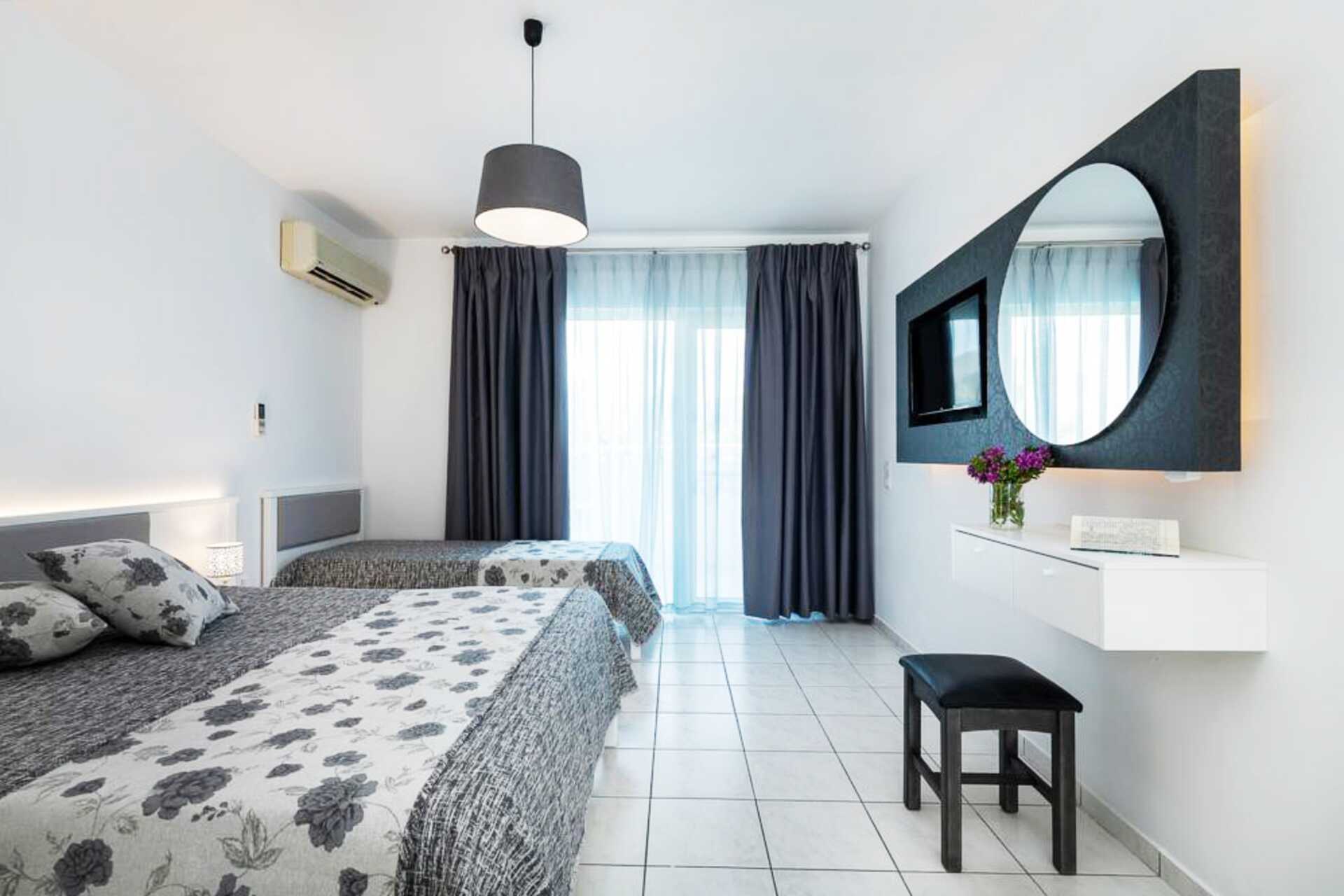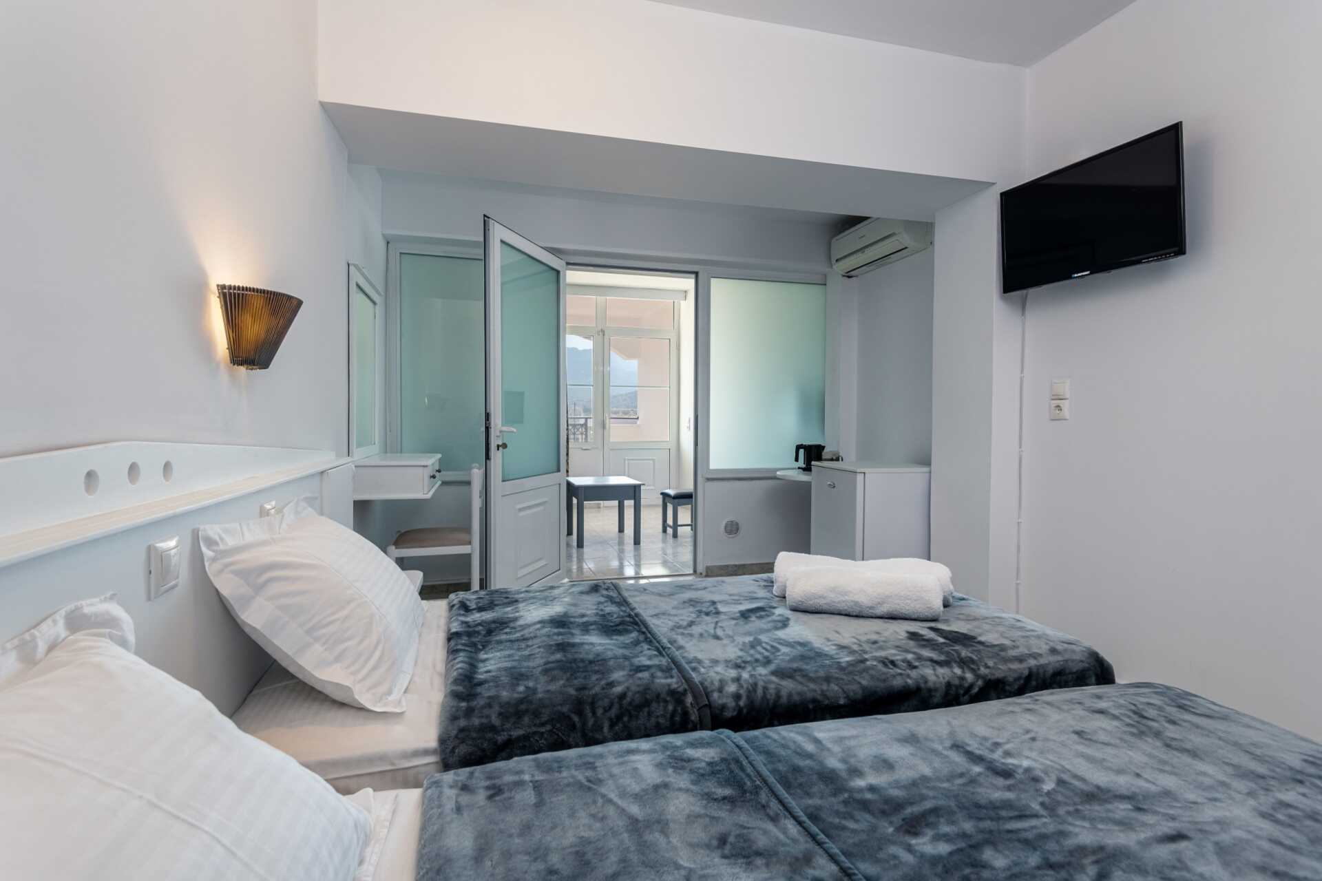 Kahden hengen huone parvekkeella tai terassilla. Parivuode tai kaksi yhden hengen sänkyä. Maksuton wifi ja ilmastointi. Tallelokero lisämaksusta. Jääkaappi. Vedenkeitin, kahvia ja teetä. Tv kansainvälisillä kanavilla. Hiustenkuivain. Kylpyhuoneessa kylpyamme tai suihku ja wc. Siivous 5 krt/viikko.