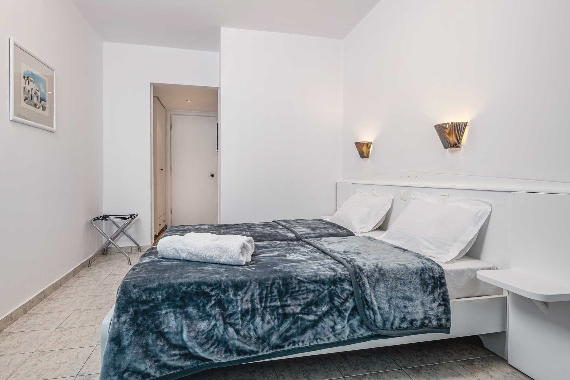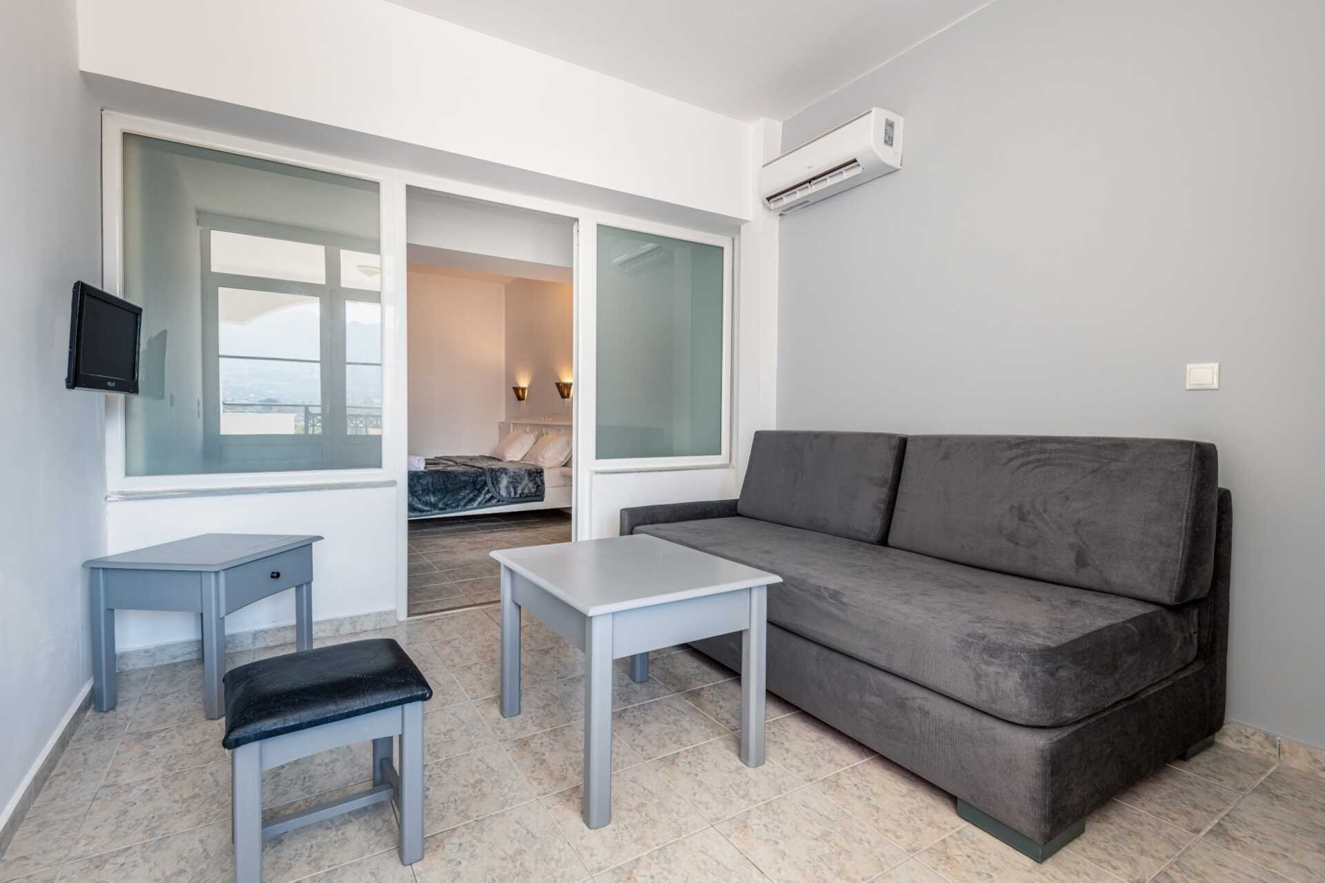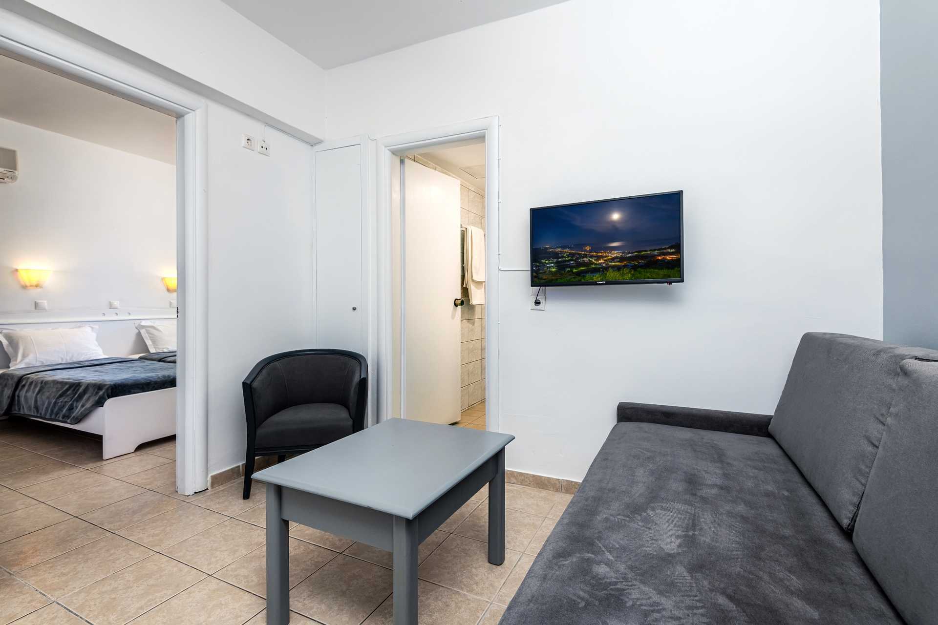 Perhehuone parvekkeella tai terassilla. Perhehuone koostuu makuuhuoneesta ja olohuoneesta. Parivuode tai kaksi yhden hengen sänkyä. Lisävuodemahdollisuus yhden hengen sängystä. Maksuton wifi ja ilmastointi. Tallelokero lisämaksusta. Jääkaappi. Vedenkeitin, kahvia ja teetä. Tv kansainvälisillä kanavilla. Hiustenkuivain. Kylpyamme tai suihku ja wc. Siivous 5 krt/viikko.