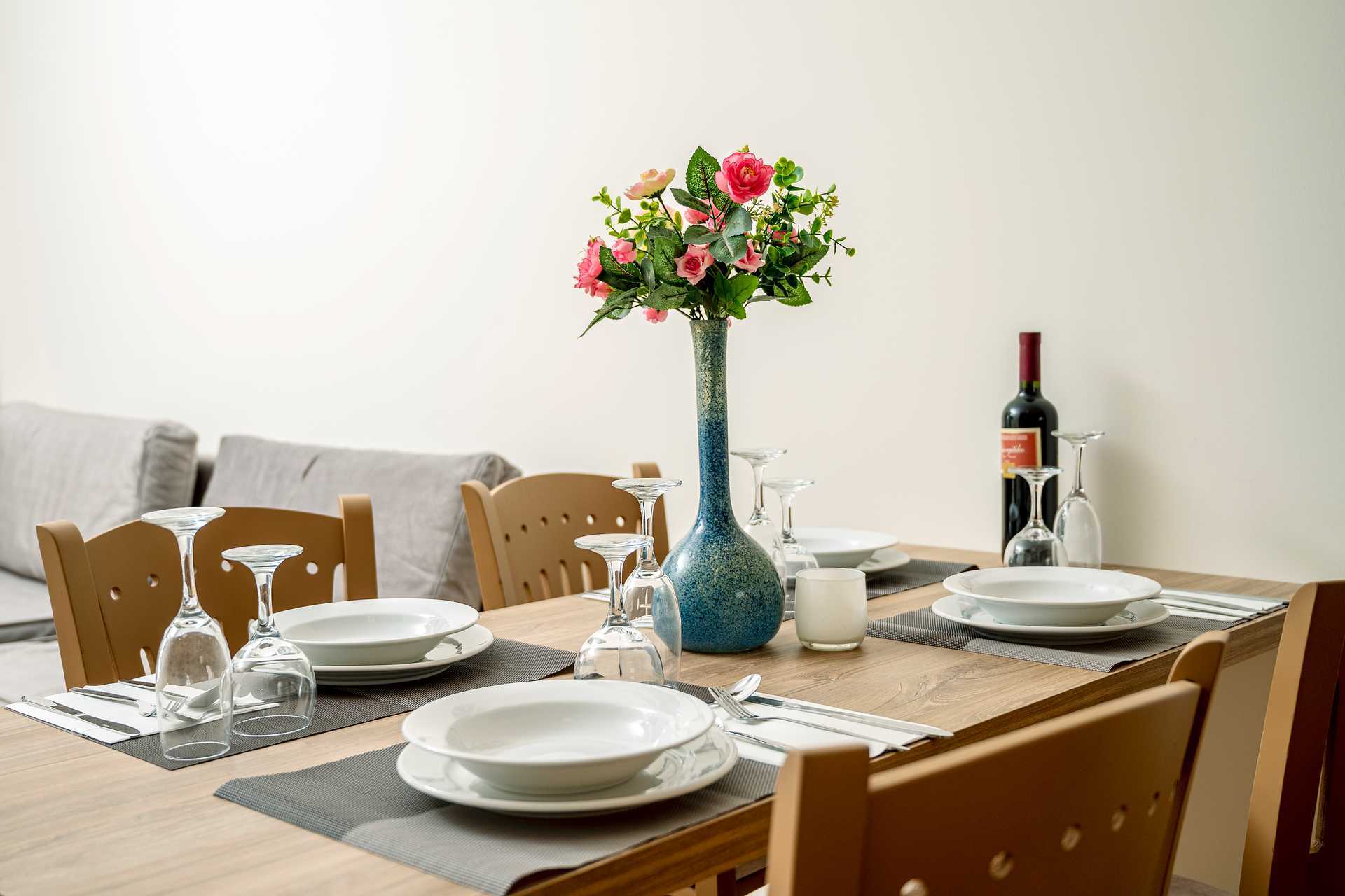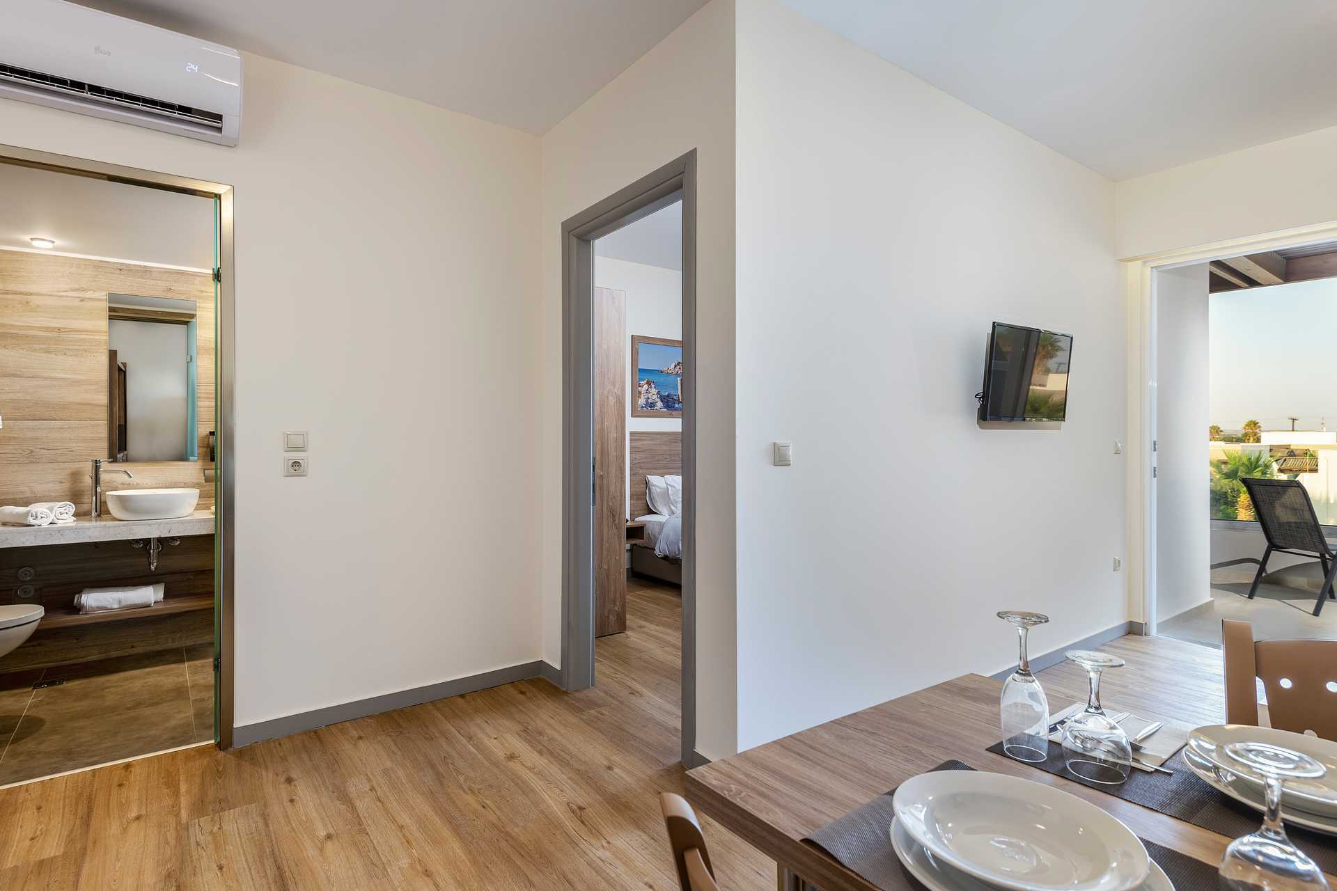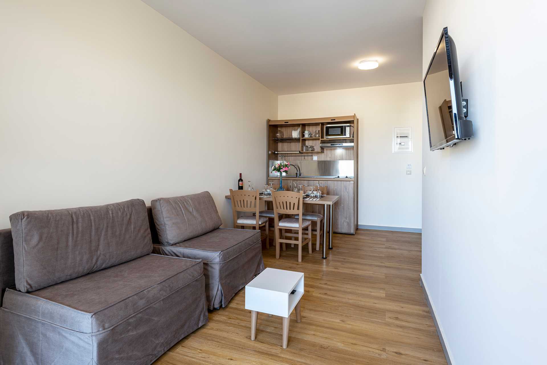 Kaksio alennetulla maatasolla, maaparveke ja näkymä uima-altaalle. Makuuhuone ja yhdistetty olohuone ja minikeittiö. Parivuode tai kaksi yhden hengen sänkyä. Lisävuodemahdollisuus kahteen vuodesohvaan. Minikeittiö, jossa jääkaappi, keittolevyt, kahvinkeitin, mikroaaltouuni ja peruskeittiövälineet. Maksuton wifi, ilmastointi ja tallelokero. Hiustenkuivain. Suihku ja wc. Siivous 6 krt/viikko.