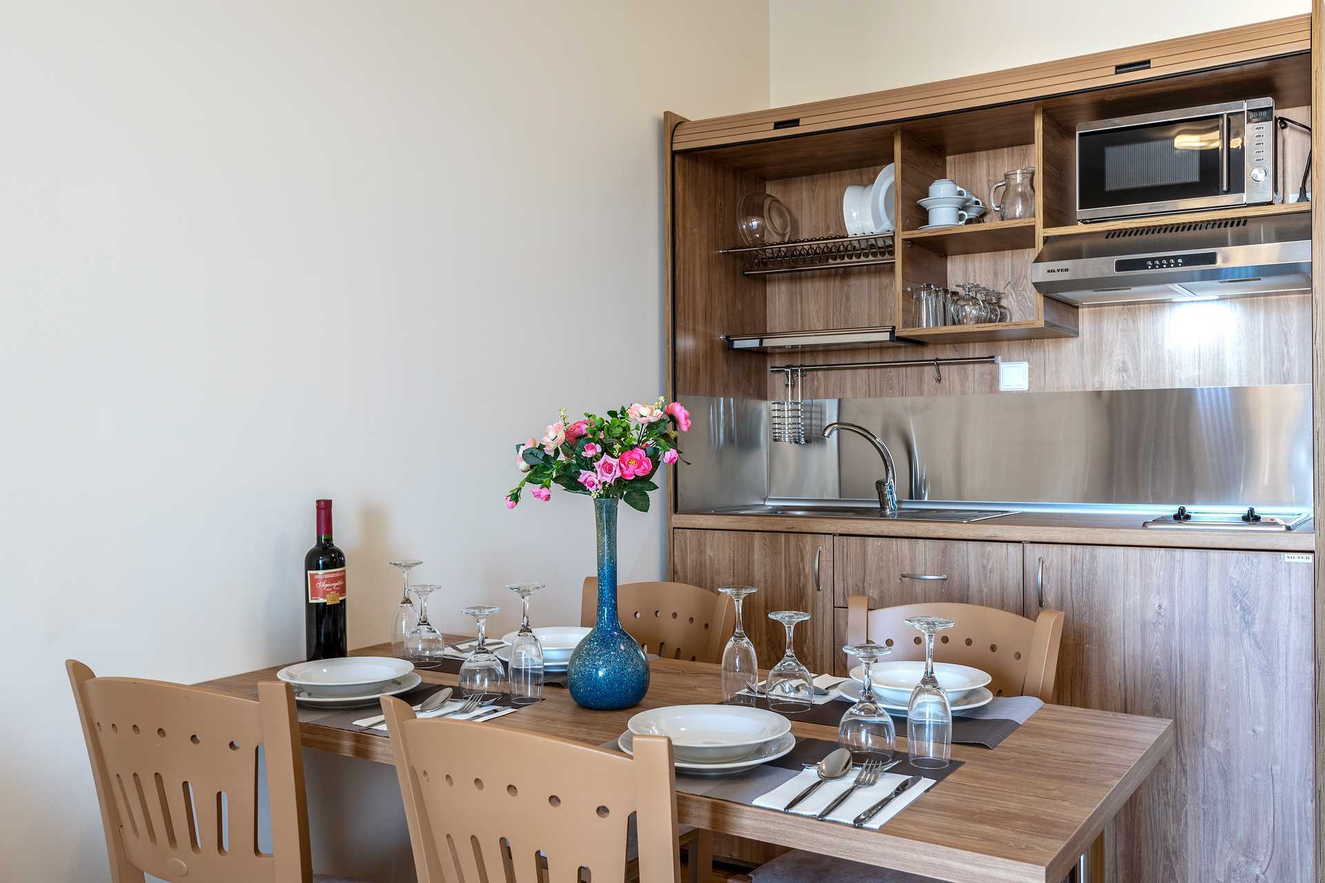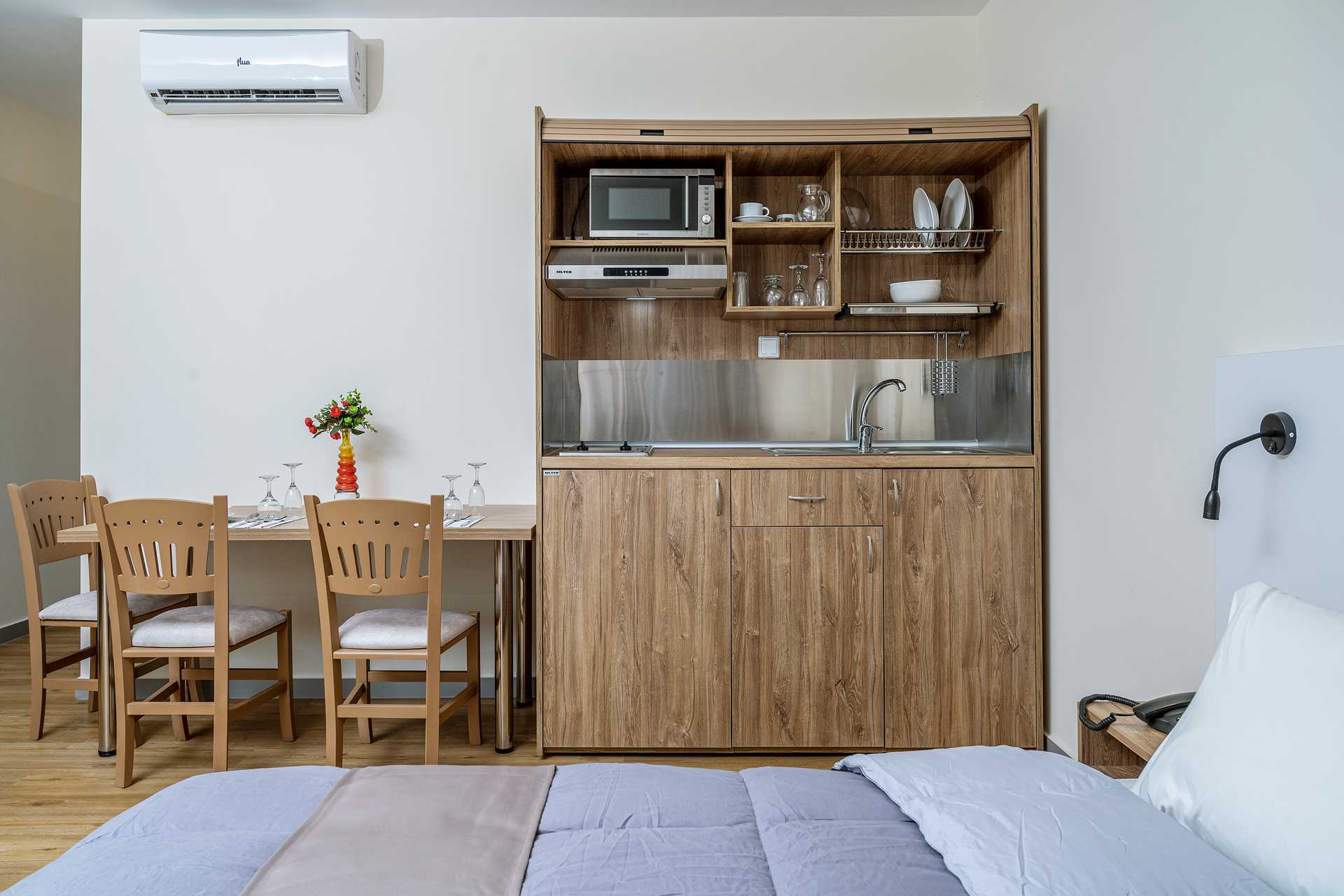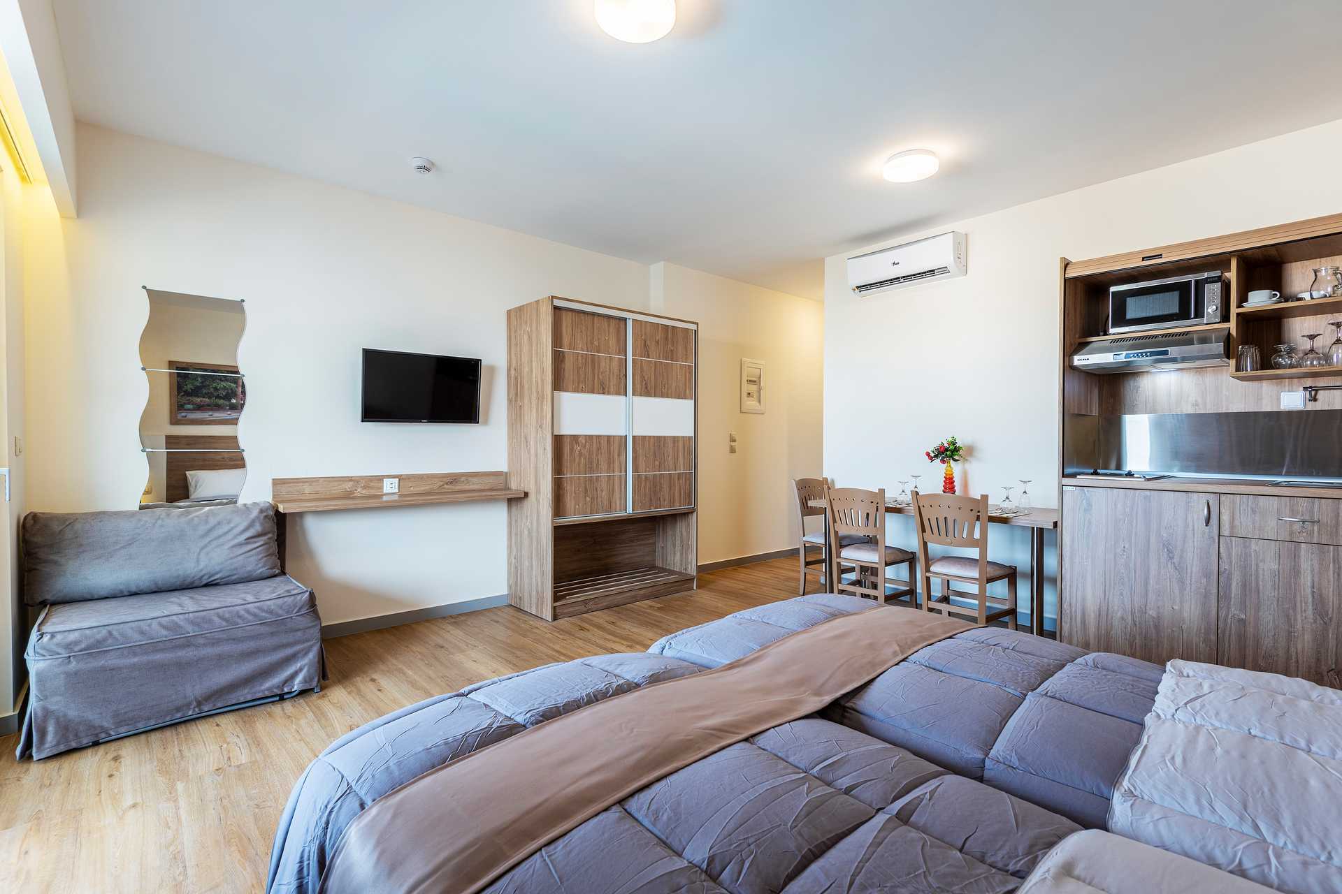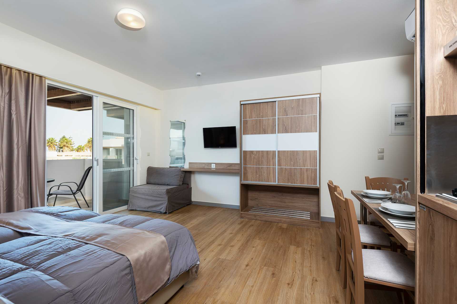 Yksiössä on parveke, osasta on näkymät uima-altaalle. Yhdistetty makuuhuone ja minikeittiö. Parivuode tai kaksi yhden hengen sänkyä. Lisävuodemahdollisuus kokoontaitettavasta nojatuolista. Minikeittiö, jossa jääkaappi, keittolevyt, mikroaaltouuni, kahvinkeitin ja peruskeittiövälineet. Maksuton wifi, ilmastointi ja tallelokero. Hiustenkuivain. Suihku ja wc. Siivous 6 krt/viikko.