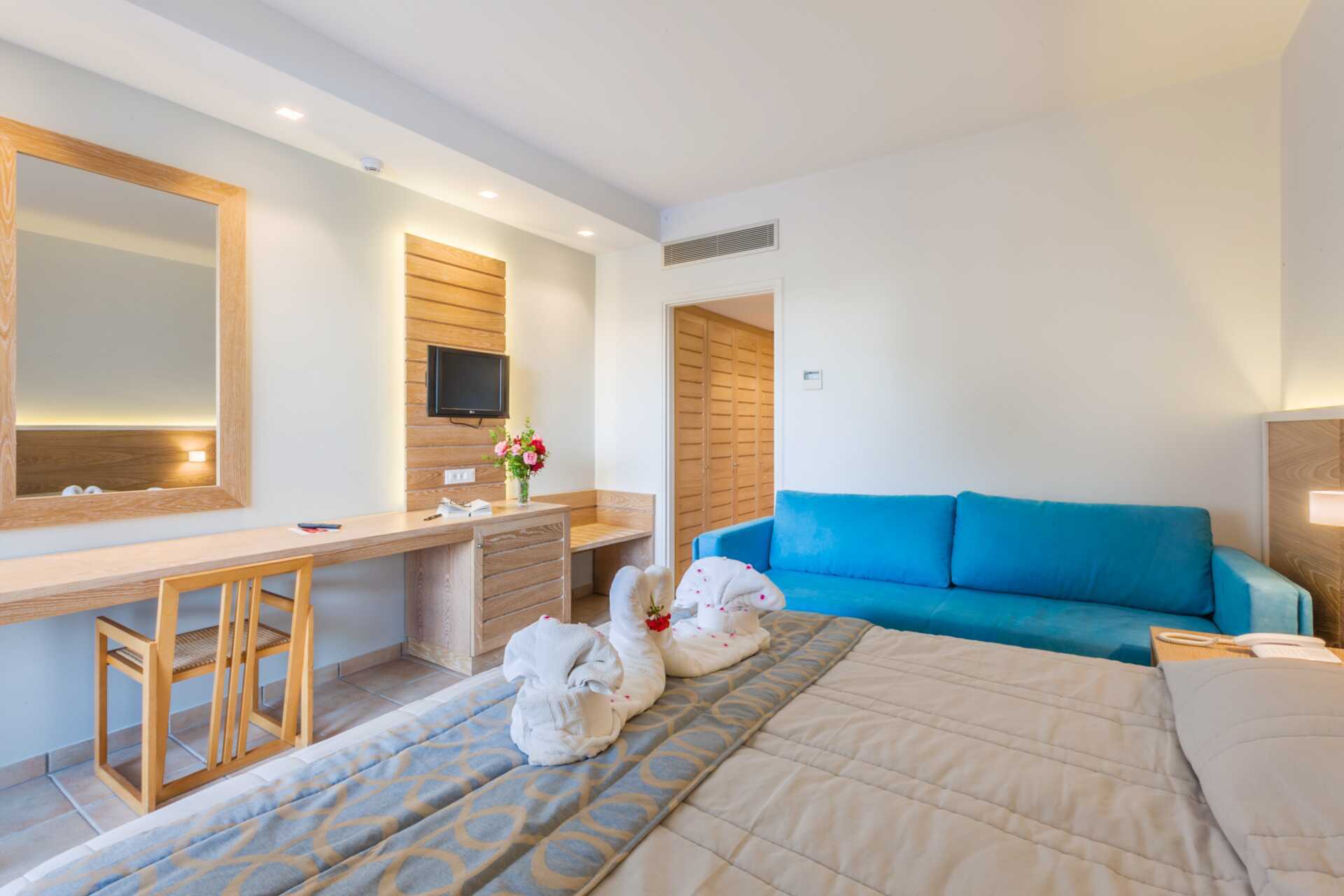 Kahden hengen huoneita, joissa on parveke tai terassi, osassa merinäköala. Huoneet sijaitsevat päärakennuksessa. Parivuode tai kaksi yhden hengen vuodetta. Lisävuodemahdollisuus kokoontaitettavasta nojatuolista tai yhden hengen vuoteesta. Neljän hengen huoneissa on kerrossänky. Tv kansainvälisillä kanavilla. Maksuton wifi ja ilmastointi. Tallelokero lisämaksulla. Jääkaappi. Hiustenkuivain. Suihku ja wc. Siivous 6 krt/vk.
