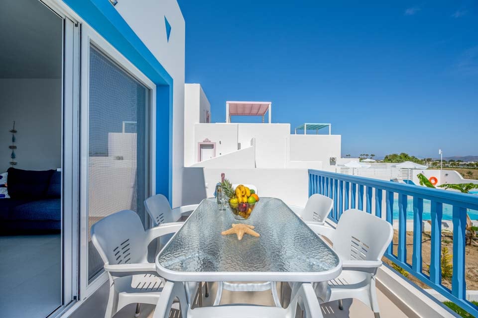 Pitkän rantapäivän jälkeen voit potkaista kengät jalasta tilavassa olohuoneessa, joka on täynnä modernia eleganssia ja ajatonta charmia. Tyylikkään yksinkertaiset kalusteet yhdistyvät autenttisiin yksityiskohtiin, ja valkoiseksi kalkitut julkisivut henkivät Kreikan rikasta perintöä. Suuret ikkunat kylpevät sisätiloissa luonnonvalossa, ja rauhoittavat valkoisen ja sinisen sävyt luovat kutsuvan tunnelman. Jos voit irrottautua olostasi, Tigakin laajat valkoiset hiekkarannat ovat vain kävelymatkan päässä, ja niitä reunustavat aurinkotuolit ja viehättävät rannikkopolut. Illat täällä kuluvat hitaammin, ja alueella on runsaasti perheomisteisia kreikkalaisia tavernoja ja livemusiikkibaareja. Jos kaipaat pientä sykettä, Kosin kaupunki on kahdenkymmenen minuutin päässä, ja sen satama pursuaa elämää tyylikkäine baareineen ja klubeineen.