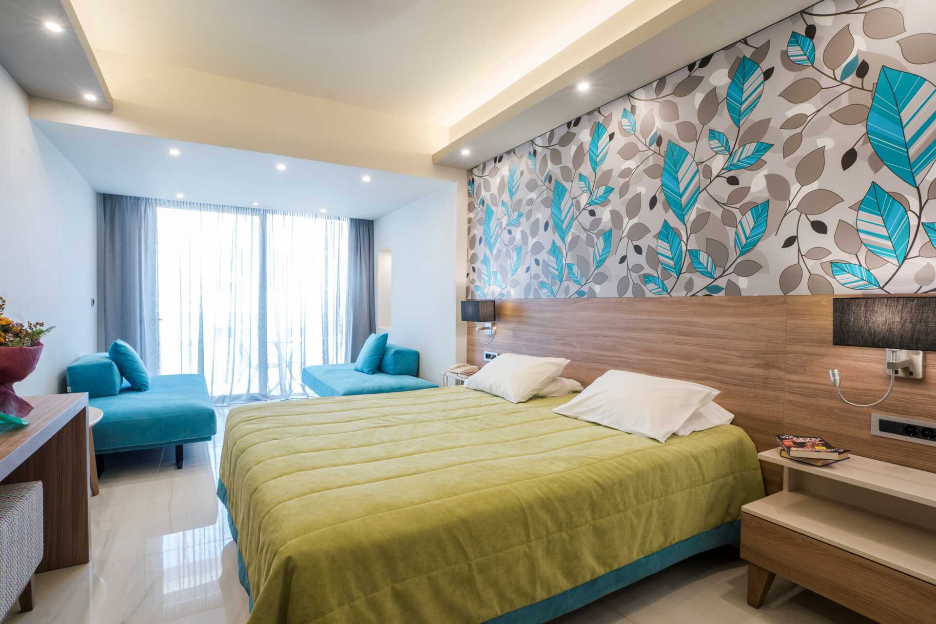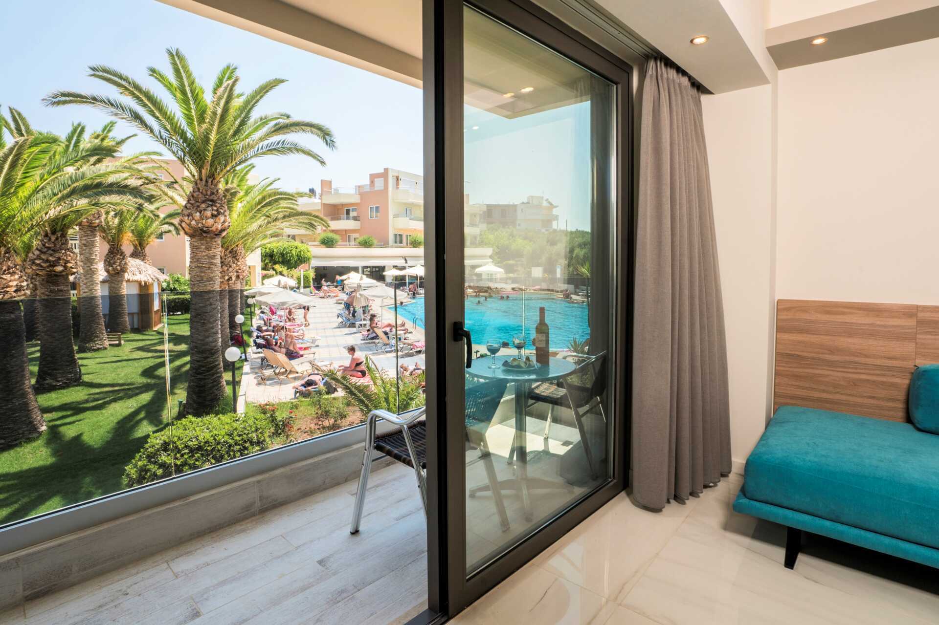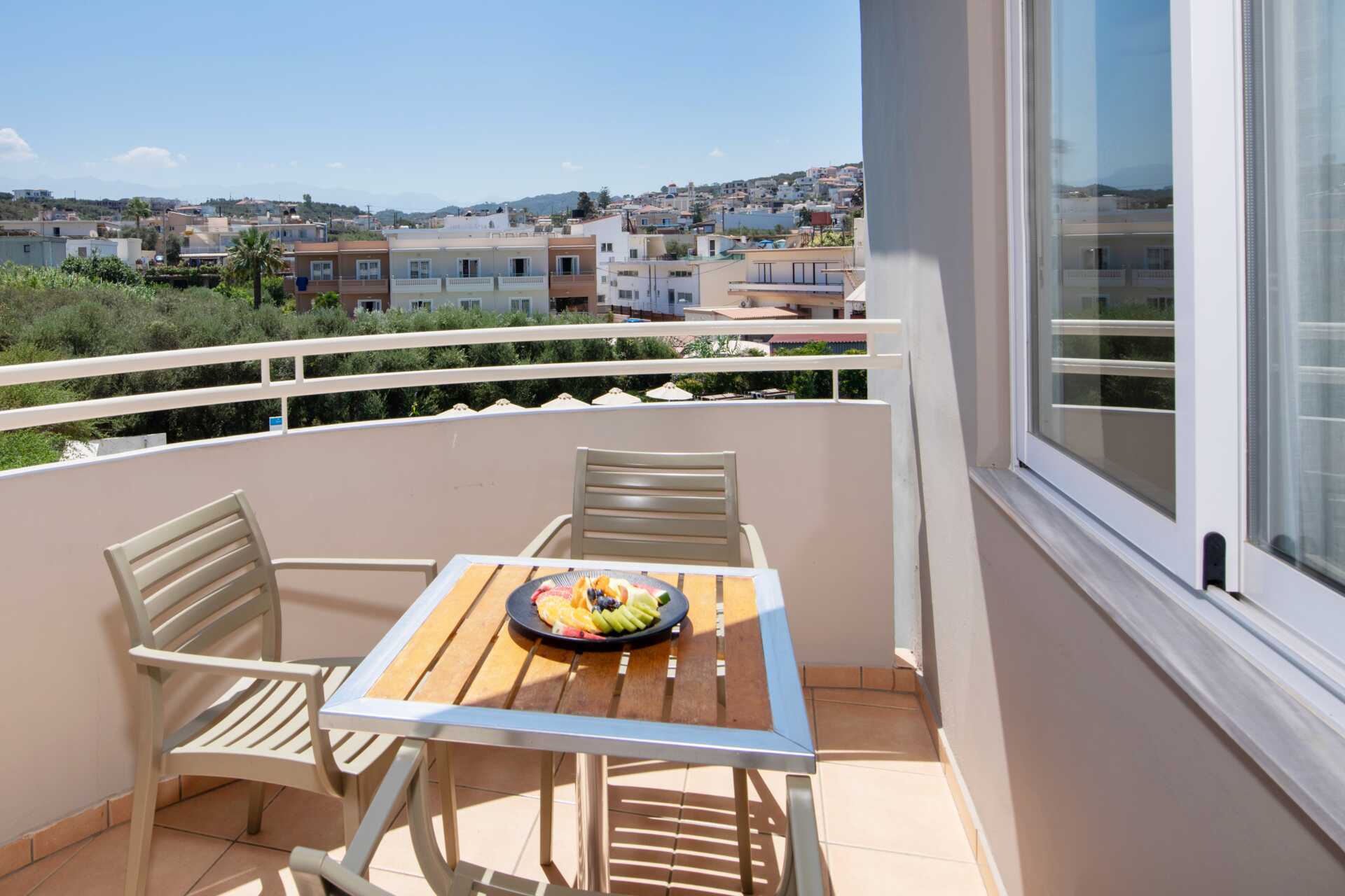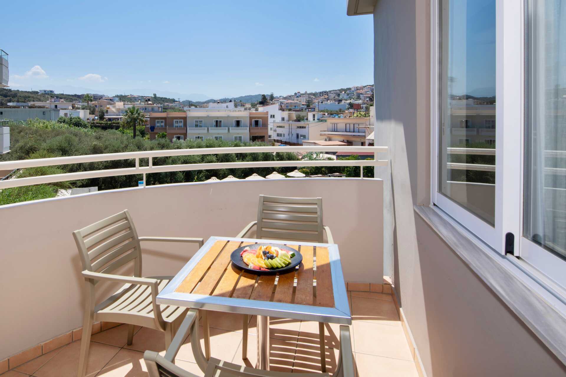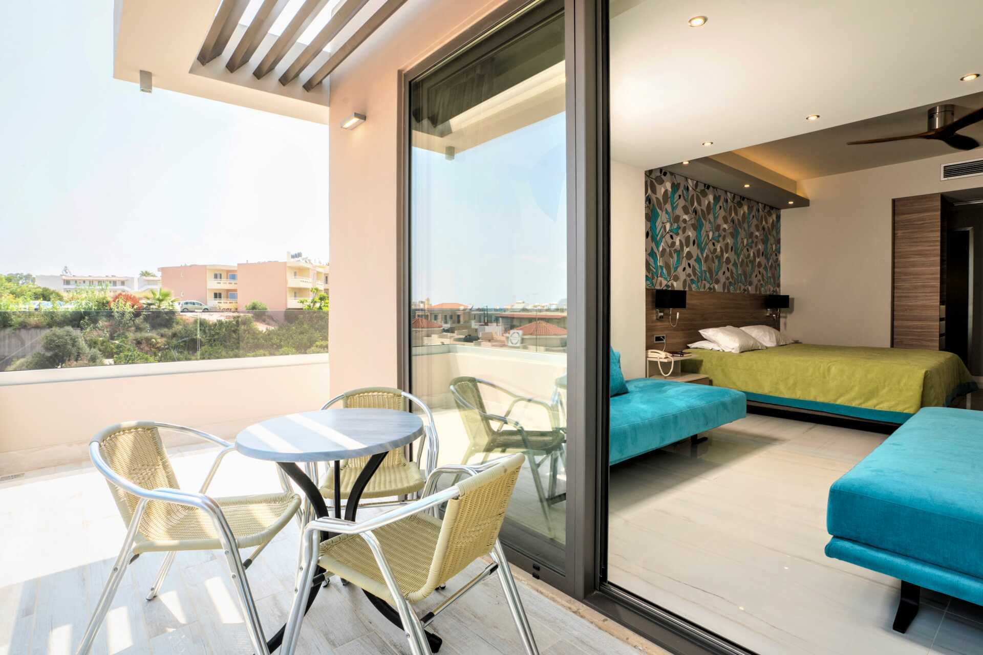 Superior-huone parvekkeella tai terassilla. Parivuode. Lisävuodemahdollisuus vuodesohvasta. Maksuton wifi, ilmastointi ja tallelokero. Jääkaappi. Nespresso-kahvikone, kapselit maksutta ja täydennetään viikon aikana. Tv kansainvälisillä kanavilla. Tohvelit. Hiustenkuivain. Suihku ja wc. Siivous 6 krt/viikko.