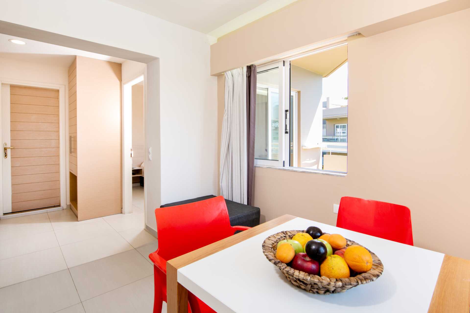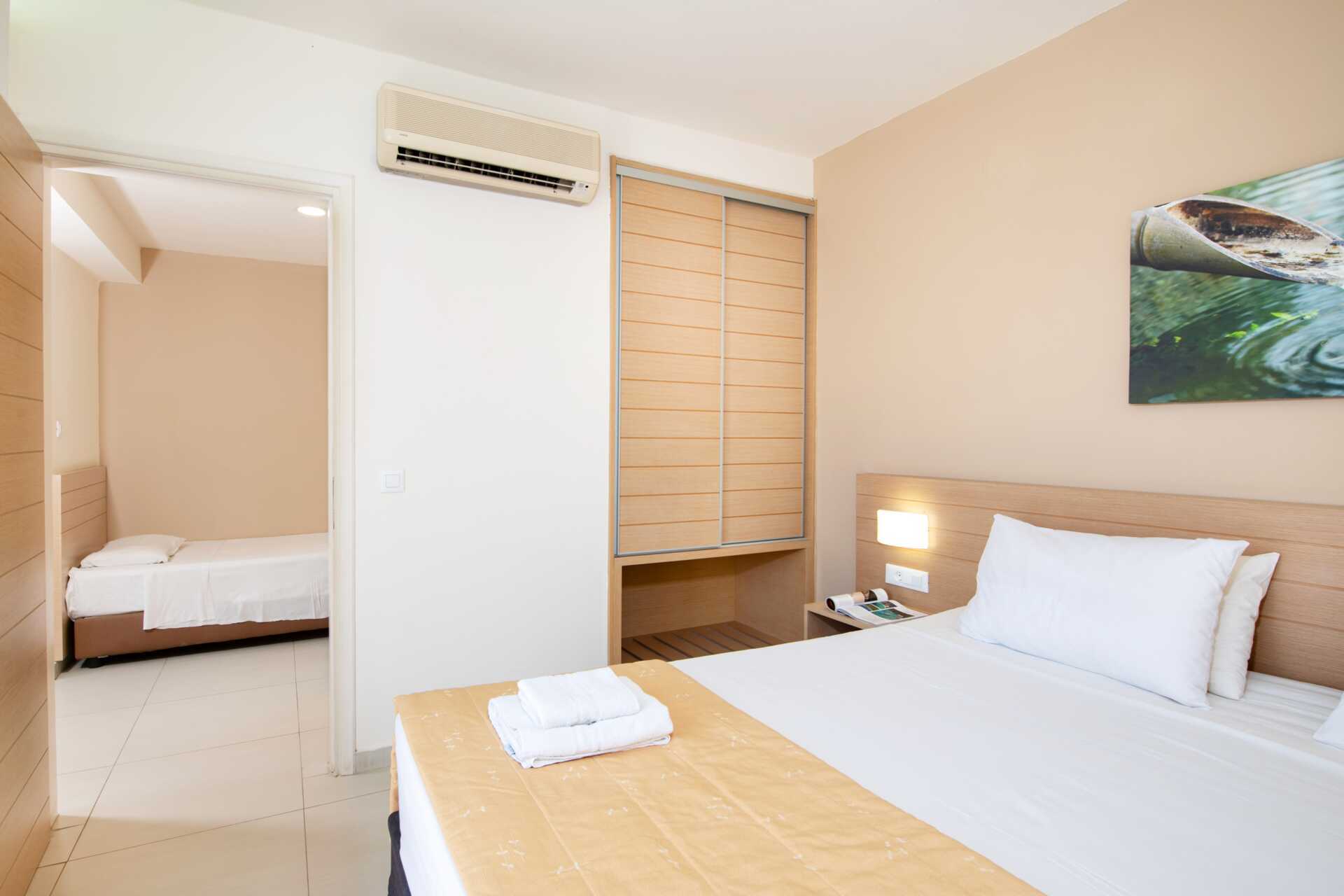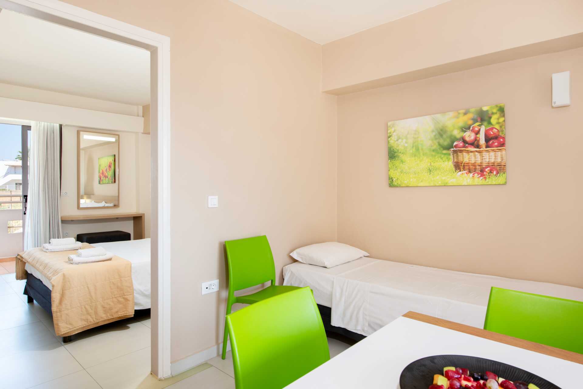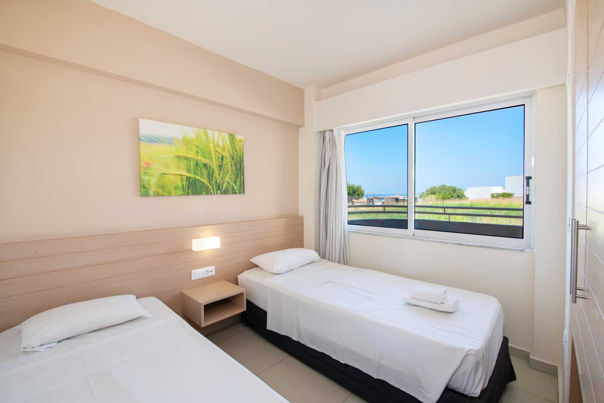 Kolmio alennetulla maatasolla Osassa asunnoista ei ole ulkotilaa, osassa on maaterassi. Kaksi makuuhuonetta ja yhdistetty olohuone ja minikeittiö. Parivuode tai kaksi yhden hengen sänkyä. Lisävuodemahdollisuus kahteen yhden hengen sänkyyn, joista toinen on sijoitettu toiseen makuuhuoneeseen. Minikeittiössä keittolevyt, vedenkeitin, mikro, jääkaappi, kahvinkeitin ja yksinkertainen keittiävarustus. Maksuton wifi, ilmastointi ja tallelokero. Tv kansainvälisillä kanavilla. Hiustenkuivain. Kylpyhuoneessa suihku ja wc. Siivous 6 krt/viikko.