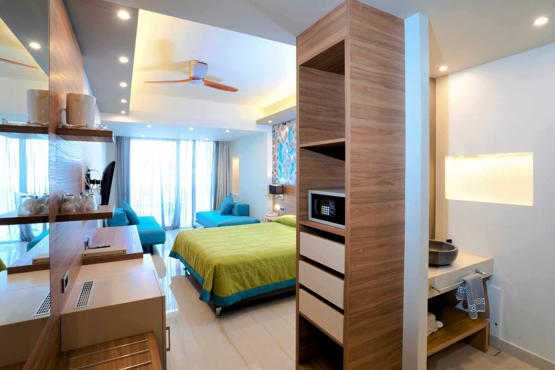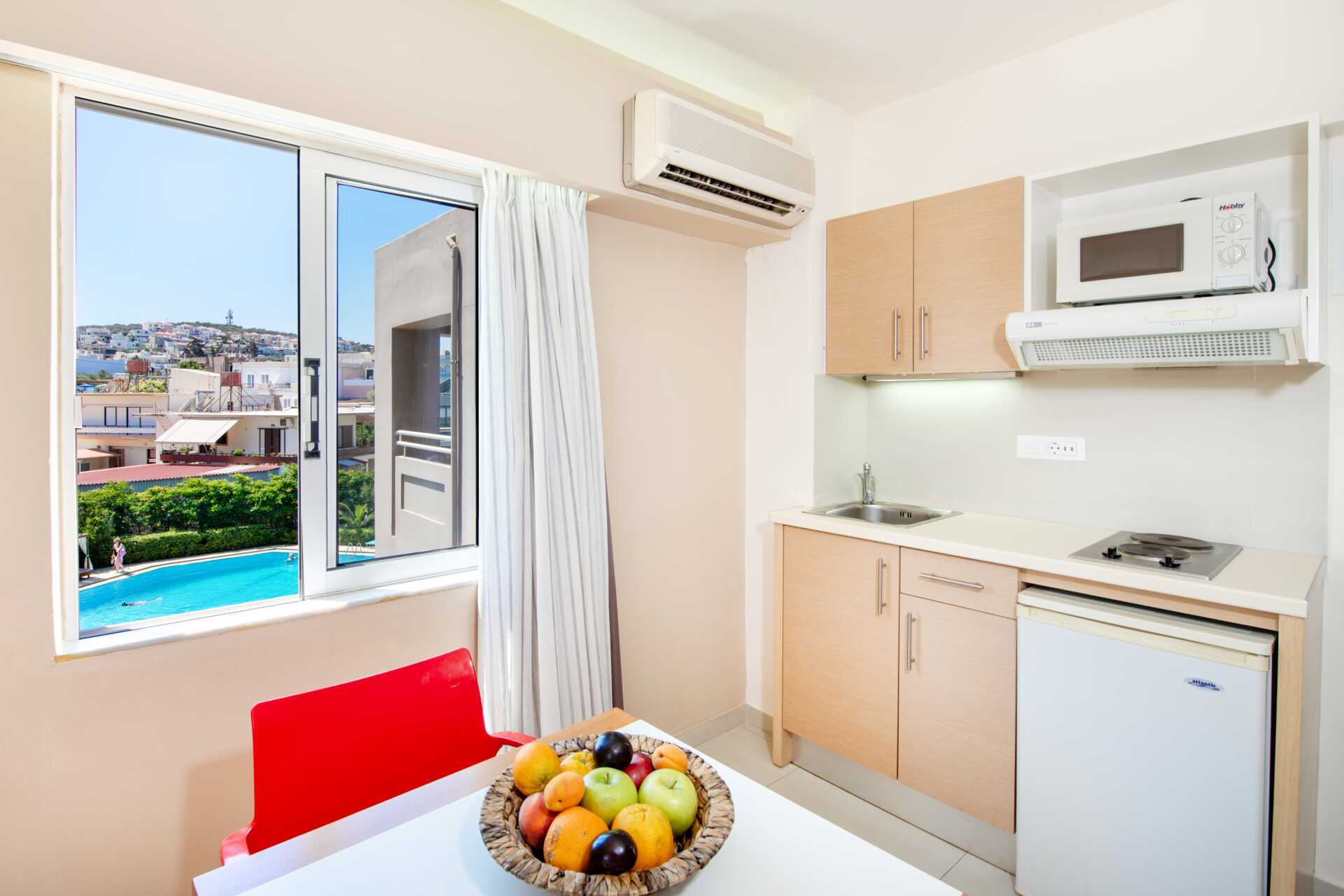 Kaksio parvekkeella tai maaparvekkeella, osassa näköala altaalle. Makuuhuone sekä yhdistetty olohuone ja minikeittiö. Parivuode tai kaksi yhden hengen sänkyä. Lisävuodemahdollisuus vuodesohvaan tai yhden hengen vuoteeseen. Minikeittiössä keittolevyt, mikro, vedenkeitin, kahvinkeitin, jääkaappi ja yksinkertainen keittiövarustus. Maksuton wifi, ilmastointi ja tallelokero. Tv kansainvälisillä kanavilla. Hiustenkuivain. Suihku ja wc. Siivous 6 krt/viikko.