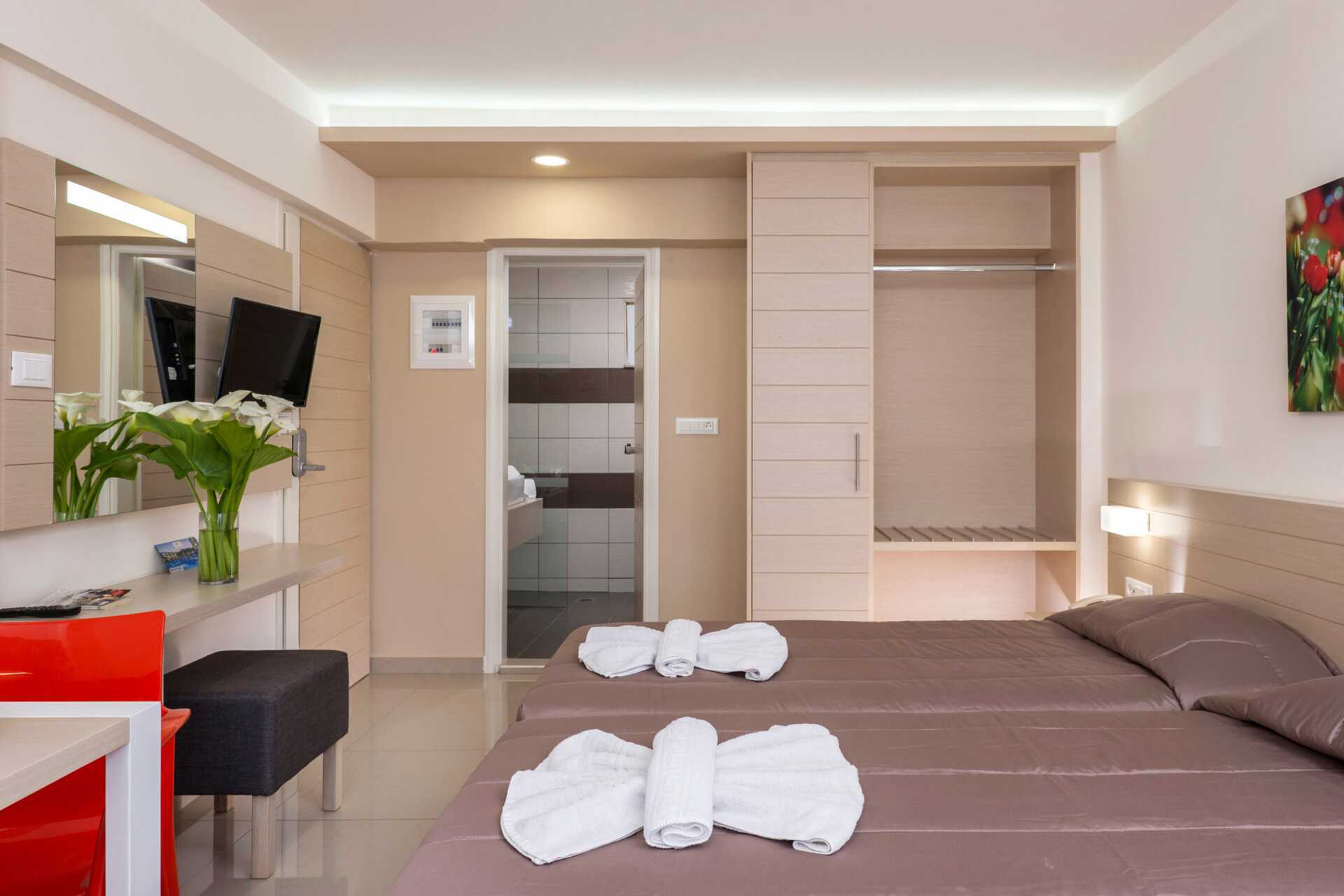 Kolmio parvekkeella tai maaparvekkeella, osa parvekkeista allasnäköalalla. Kaksi makuuhuonetta sekä yhdistetty olohuone ja minikeittiö. Joissakin kolmiossa yksi makuuhuone on pieni. Parivuode tai kaksi erillistä vuodetta molemmissa makuuhuoneissa. Mahdollisuus saada lisävuoteita vuodesohviin tai yhden hengen vuoteisiin. Jos kaikki lisävuoteet ovat käytössä, huoneistosta tulee ahdas. Minikeittiössä keittolevyt, jääkaappi, mikro, vedenkeitin, kahvinkeitin ja yksinkertainen keittiövarustus. Maksuton wifi, ilmastointi ja tallelokero. Tv kansainvälisillä kanavilla. Hiustenkuivain. Kylpyhuoneessa suihku ja wc. Siivous 6 krt/viikko.