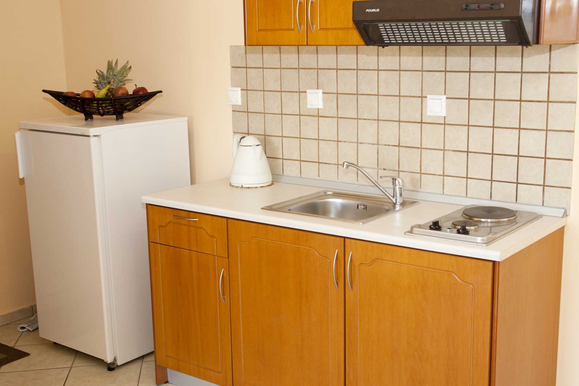 Yksiössä on parveke tai maaterassi. Makuuhuone yhdistetty minikeittiöön. Parivuode tai kaksi erillistä sänkyä. Minikeittiössä keittolevyt, jääkaappi ja pakastin, pressopannu, vedenkeitin ja yksinkertainen keittiövarustus. Maksuton wifi ja ilmastointi. Tallelokero lisämaksulla. Hiustenkuivain. Kylpyhuoneessa suihku ja wc. Siivous 6 krt/viikko.
