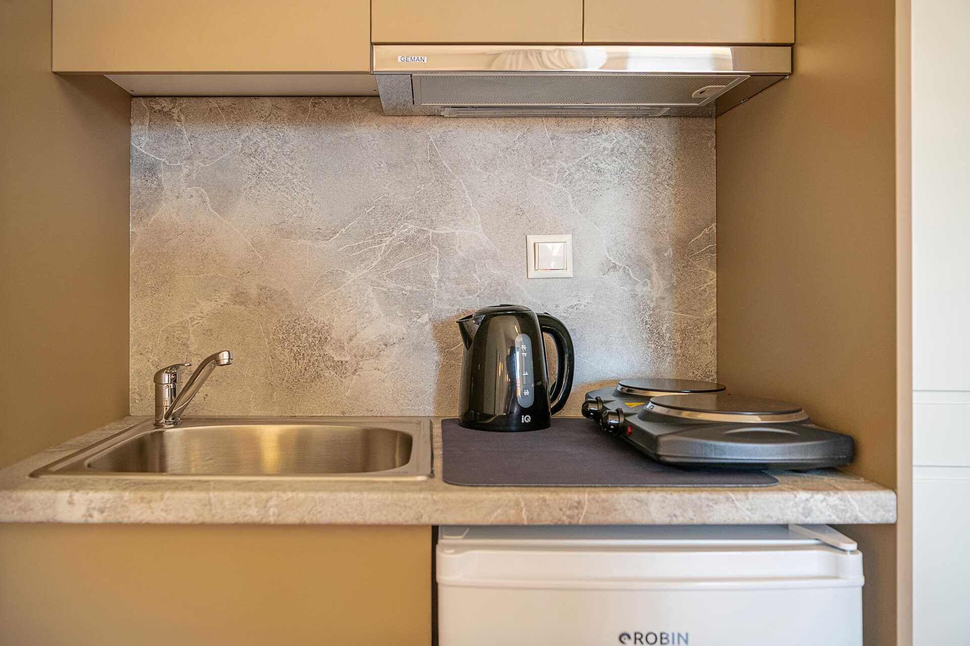 Yhden huoneen huoneisto parvekkeella, maaparvekkeella tai jaetulla ulkotilalla. Jaettu ulkotila voi olla joko pohjakerroksessa jaetulla maaparvekkeella tai ylemmässä kerroksessa jaetulla parvekkeella. Joiltakin parvekkeilta ja jaetuilta patioilta on näkymät uima-altaalle. Makuuhuone on yhdistettynä olohuoneeseen ja minikeittiöön. Kaksi yhden hengen vuodetta. Lisävuodemahdollisuutena vuodesohva. Minikeittiössä on keittolevyt, jääkaappi, vedenkeitin ja peruskeittiövälineet. Wifi (signaali ja nopeus vaihtelevat), tallelokero ja ilmastointi sisältyvät. Tv kansainvälisillä kanavilla. Hiustenkuivain. Kylpyhuone, jossa on amme ja wc. Siivous 6 krt/viikko.