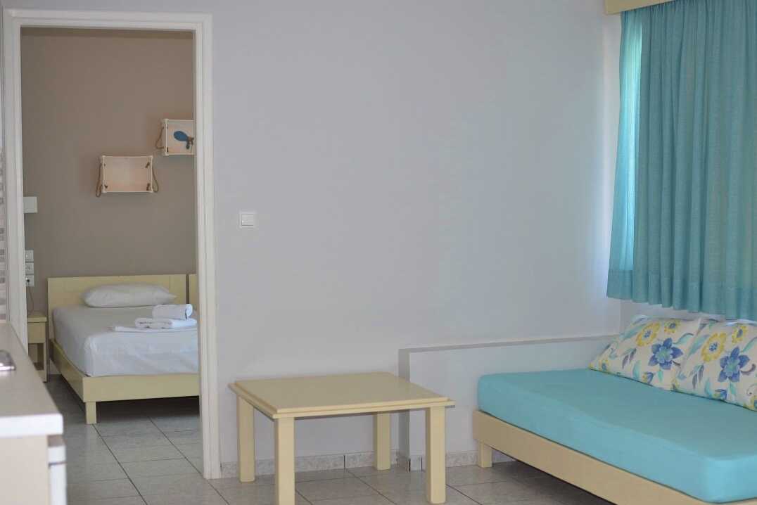Kaksio parvekkeella, jotkut maaparvekkeella vaihtoehtoisesti parveke tai terassi. Joissakin huoneistoissa on parveke ja näkymä uima-altaalle Makuuhuone sekä yhdistetty olohuone ja minikeittiö. Kaksi yhden hengen sänkyä. Mahdollisuus lisävuoteeseen nojatuolissa tai kokoontaitettavassa sängyssä. Minikeittiö, jossa keittolevyt, kahvinkeitin, leivänpaahdin, jääkaappi ja yksinkertainen keittiövarustus. Maksuton wifi, ilmastointi ja tallelokero. Tv paikallisilla kanavilla. Hiustenkuivain. Kylpyhuoneessa suihku ja wc. Siivous 6 krt/viikko.