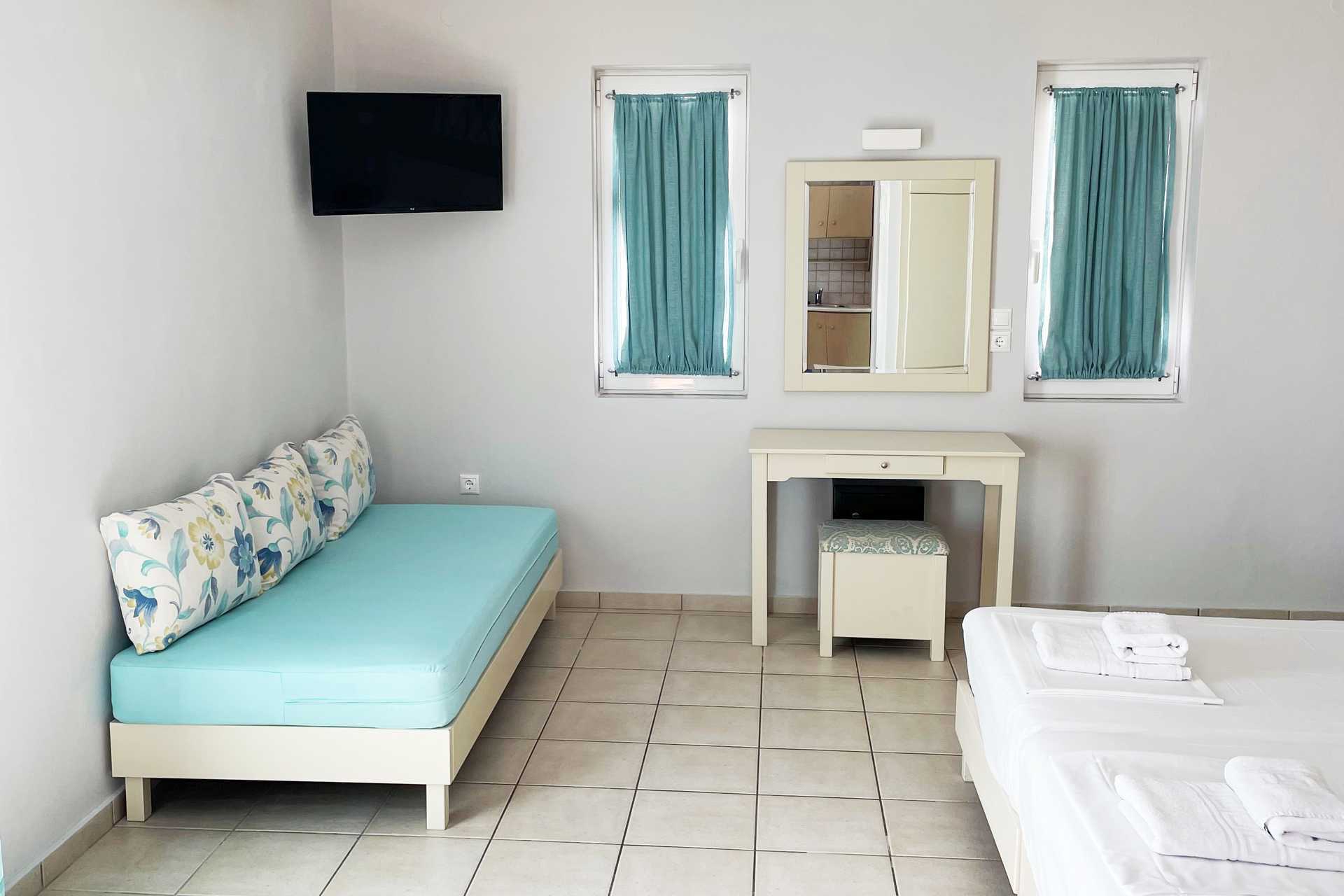 Yksiö parvekkeella, joissakin maaparvekkeella vaihtoehtoisesti parveke tai terassi. Yhdistetty makuuhuone ja minikeittiö. Kaksi yhden hengen sänkyä. Mahdollisuus lisävuoteeseen nojatuolissa tai kokoontaitettavassa sängyssä. Minikeittiö, jossa keittolevyt, kahvinkeitin, leivänpaahdin, jääkaappi ja yksinkertainen keittiövarustus. Maksuton wifi, ilmastointi ja tallelokero. Tv paikallisilla kanavilla. Hiustenkuivain. Kylpyhuoneessa suihku ja wc. Siivous 6 krt/viikko.