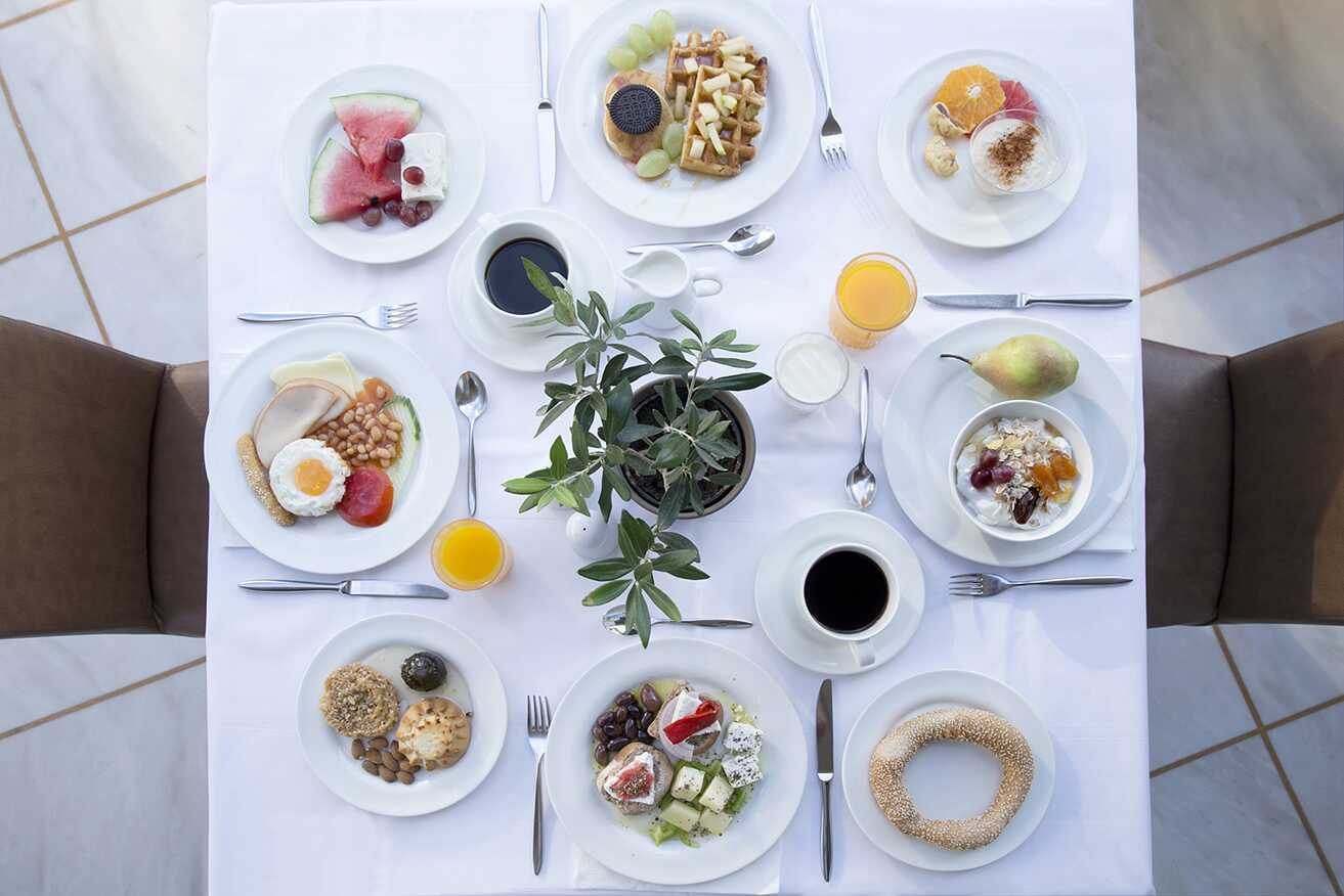 Hotellin aamiaishuoneessa tarjoillaan joka aamu herkullinen aamiainen, jonka jälkeen voit nauttia lounasta ja kreikkalaisia pikkuruokia tai vain jotain hyvää juotavaa Ousakin rantaravintolassa, josta on kaunis näköala Thodoroun saarelle. À la carte -ravintola Elaionissa tarjoillaan illan aikana herkullisia Välimeren keittiöiden ruokia, jotka valmistetaan suurelta osin paikallisesti tuotetuista luomutuotteista.