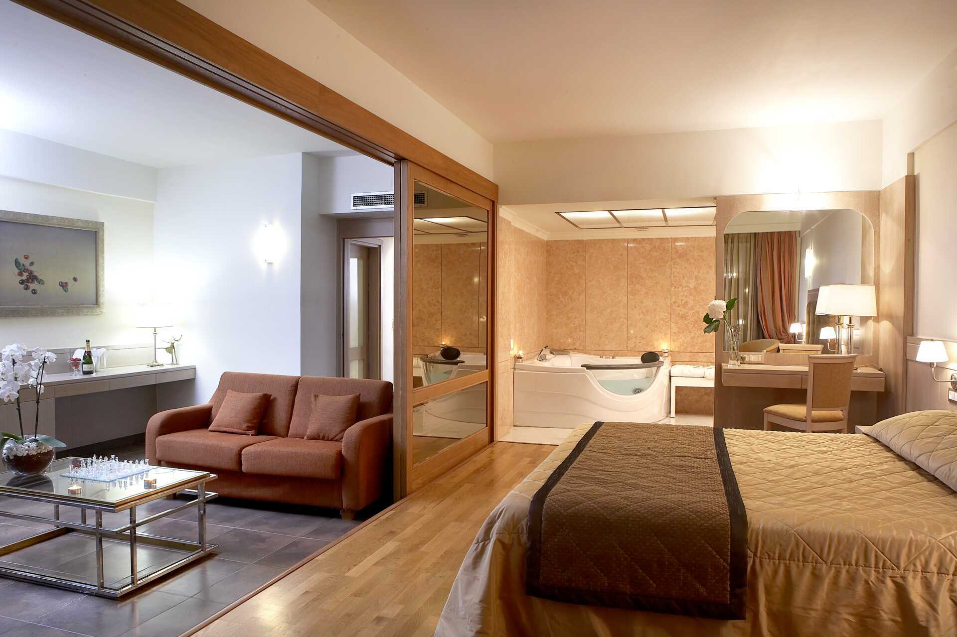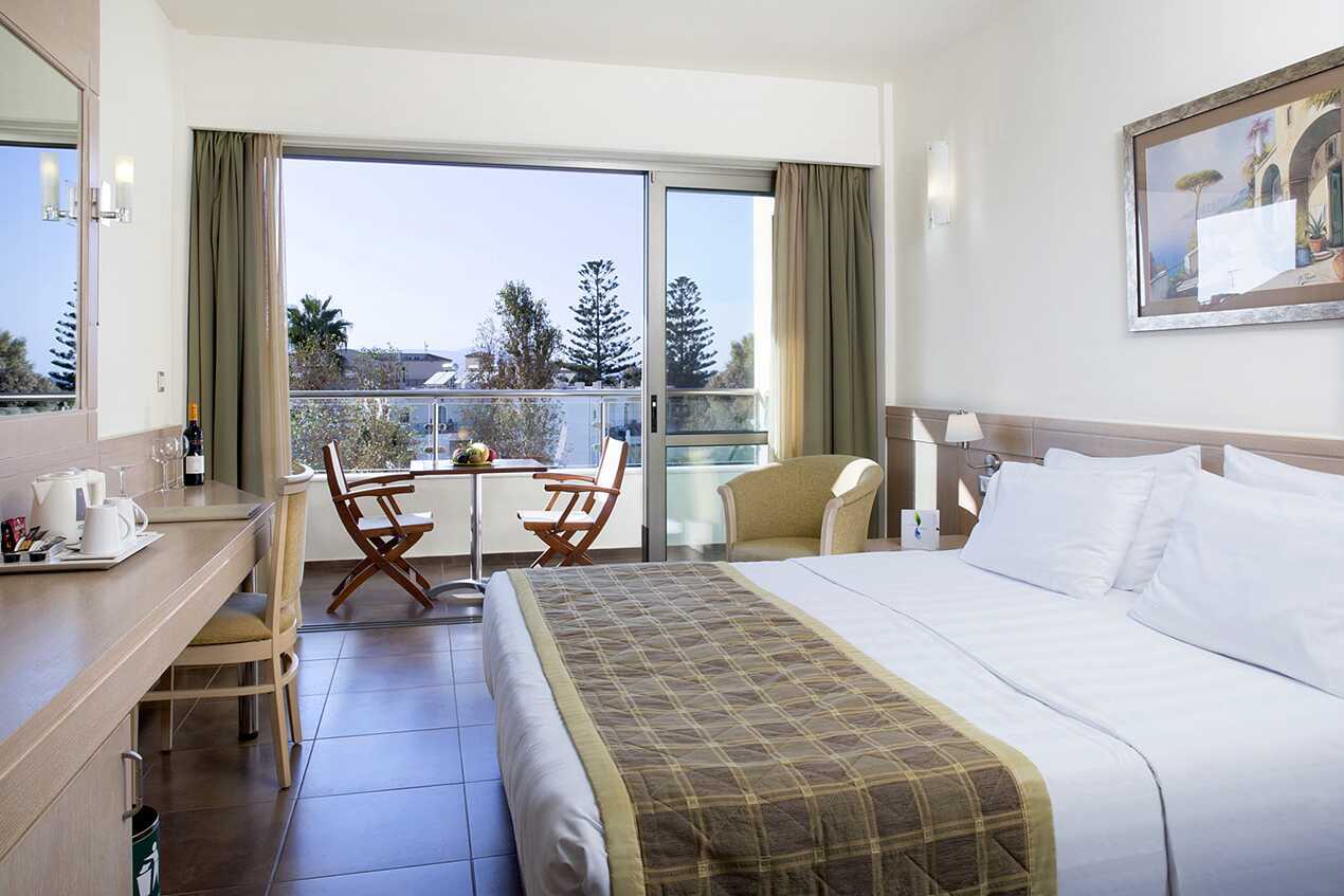 Kahden hengen huone, jossa parveke tai terassi, osassa merinäköala. Yksi parivuode tai kaksi erillistä vuodetta. Lisävuodemahdollisuus vuodesohvaan. Maksuton wifi, ilmastointi ja tallelokero. Jääkaappi. Vedenkeitin, kahvia ja teetä. Tv kansainvälisillä kanavilla. Kylpytakit ja tossut Hiustenkuivain. Kylpyhuoneessa suihku ja wc. Siivous 7 krt/viikko.