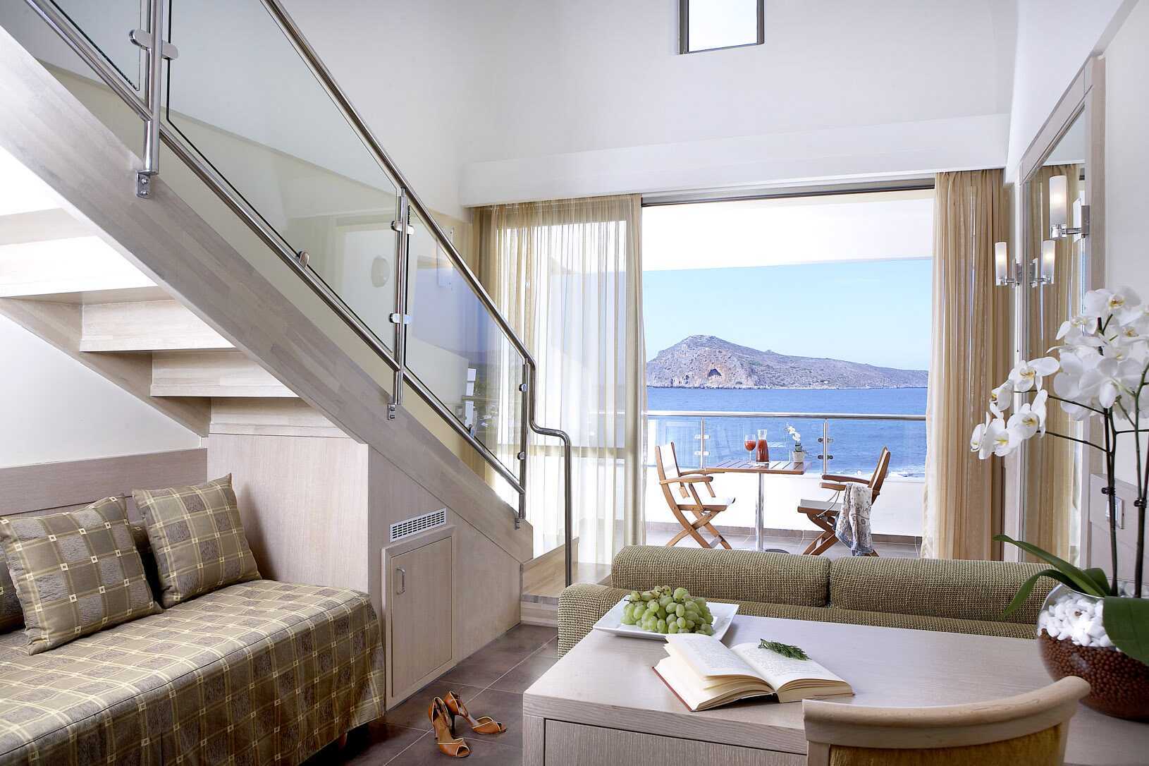 Juniorsviittejä parvekkeella tai terassilla ja merinäköalalla. Sisääntulokerroksessa on olohuone, jossa on mahdollisuus lisävuoteisiin vuodesohvasta, kylpyhuone suihkulla ja wc:llä sekä terassi. Yläkerrassa on makuuparvi, jossa on yhden hengen sänky. Makuuparvella on kalteva katto ja siksi hieman matalampi kattokorkeus. Maksuton wifi, ilmastointi ja tallelokero. Jääkaappi. Vedenkeitin, kahvia ja teetä. Tv kansainvälisillä kanavilla. Kylpytakit ja tossut. Hiustenkuivain. Siivous 7 krt/viikko.