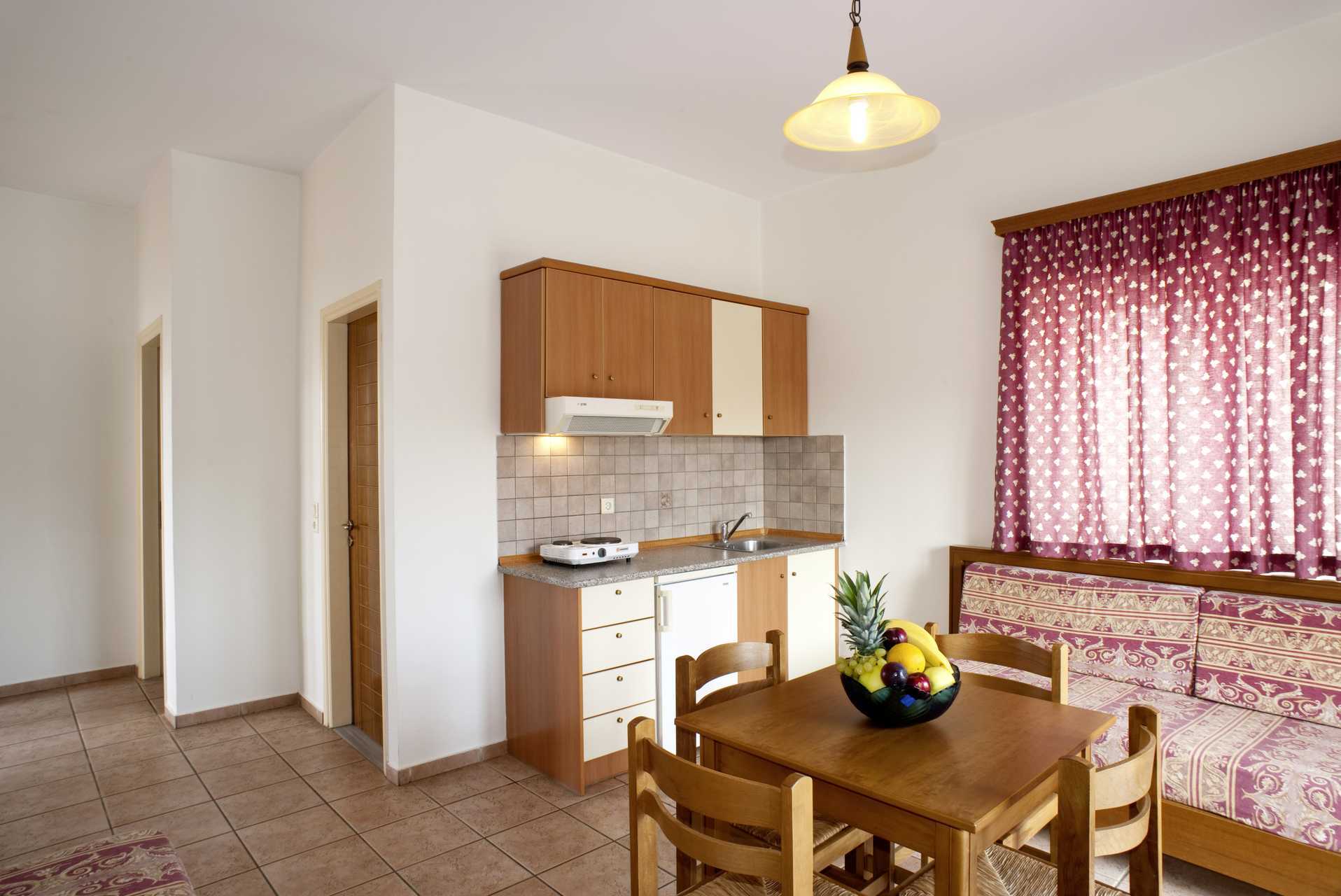 Yksiöitä parvekkeella tai terassilla. Yhdistetty makuuhuone ja minikeittiö. Kaksi yhden hengen sänkyä. Lisävuodemahdollisuus vuodesohvasta. Wifi maksutta. Ilmastointi ja tallelokero lisämaksusta. Minikeittiö, jossa keittolevyt, jääkaappi, kahvinkeitin, vedenkeitin ja yksinkertainen keittiövarustus. Tv kansainvälisillä kanavilla. Suihku ja wc. Siivous 6 krt/viikko.