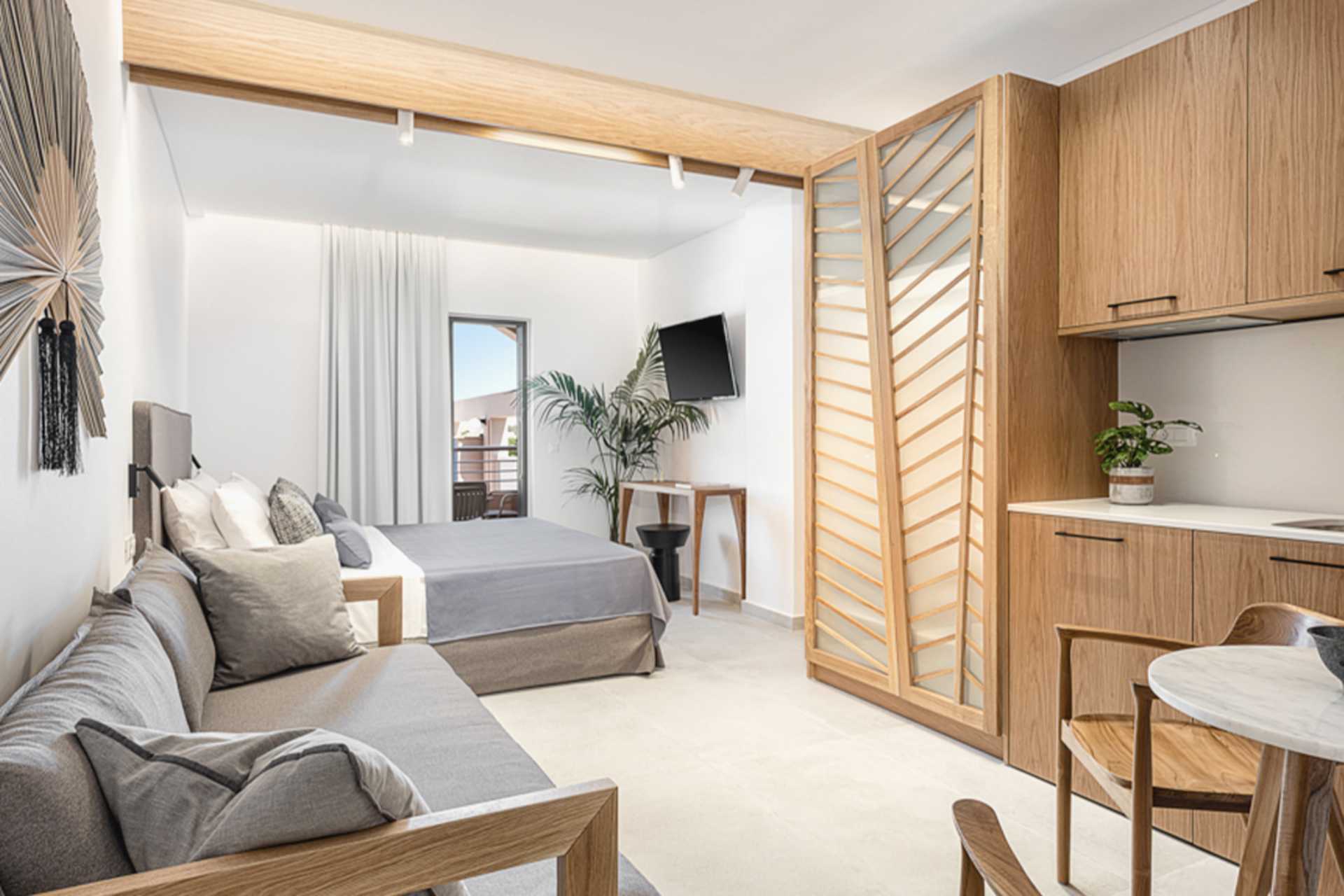 Superior-yksiö, jossa on parveke tai terassi. Yhdistetty makuuhuone ja minikeittiö. Parivuode tai kaksi yhden hengen sänkyä. Lisävuodemahdollisuus vuodesohvasta. Minikeittiössä keittolevyt, jääkaappi, vedenkeitin ja yksinkertainen keittiövarustus. Maksuton wifi. Ilmastointi ja tallelokero lisämaksusta. Tv kansainvälisillä kanavilla. Kylpyhuoneessa suihku ja wc. Siivous 6 krt/viikko.