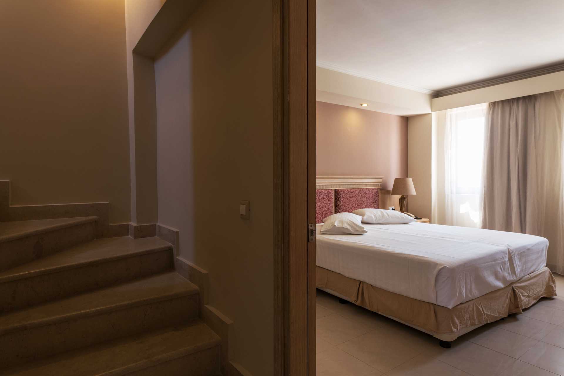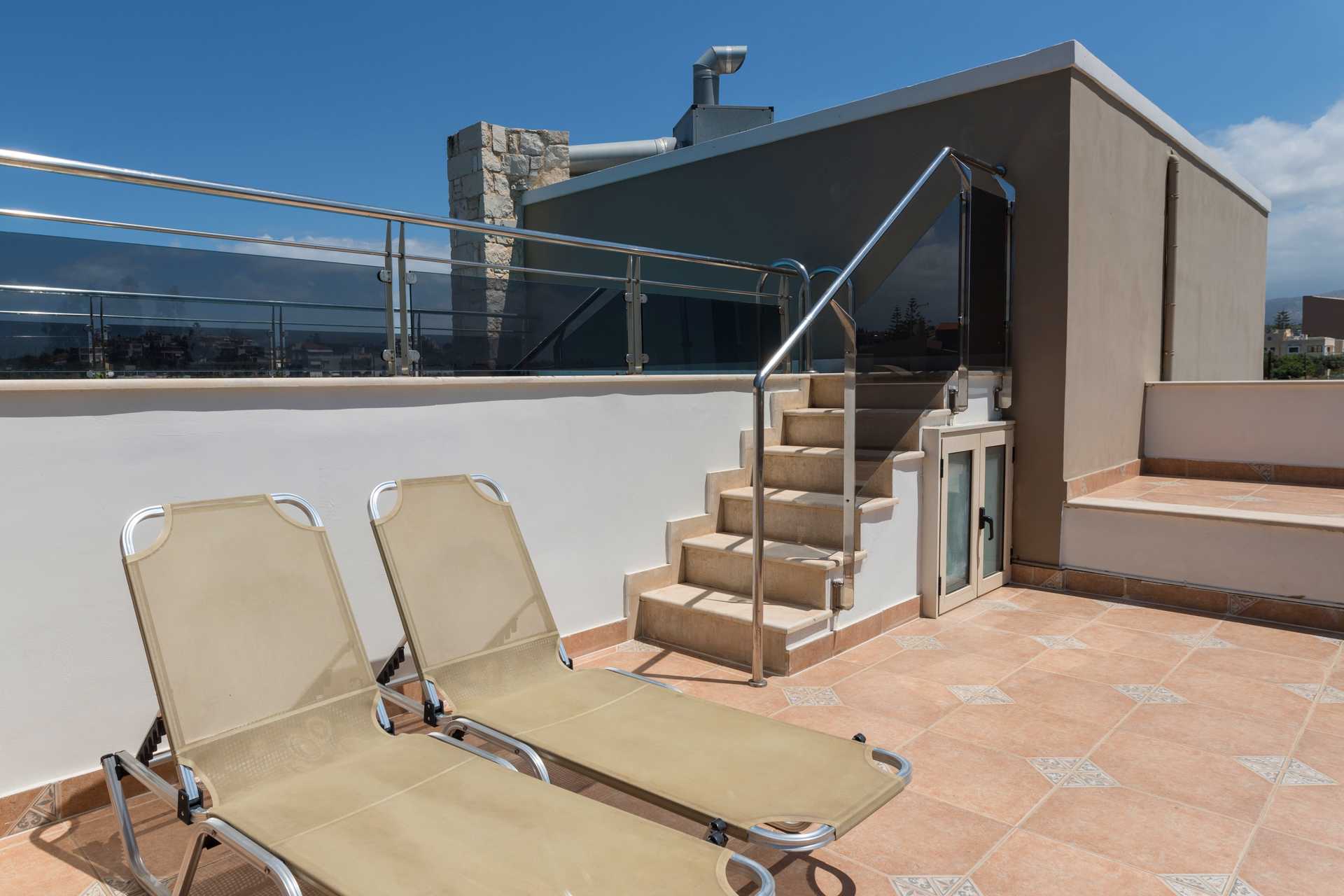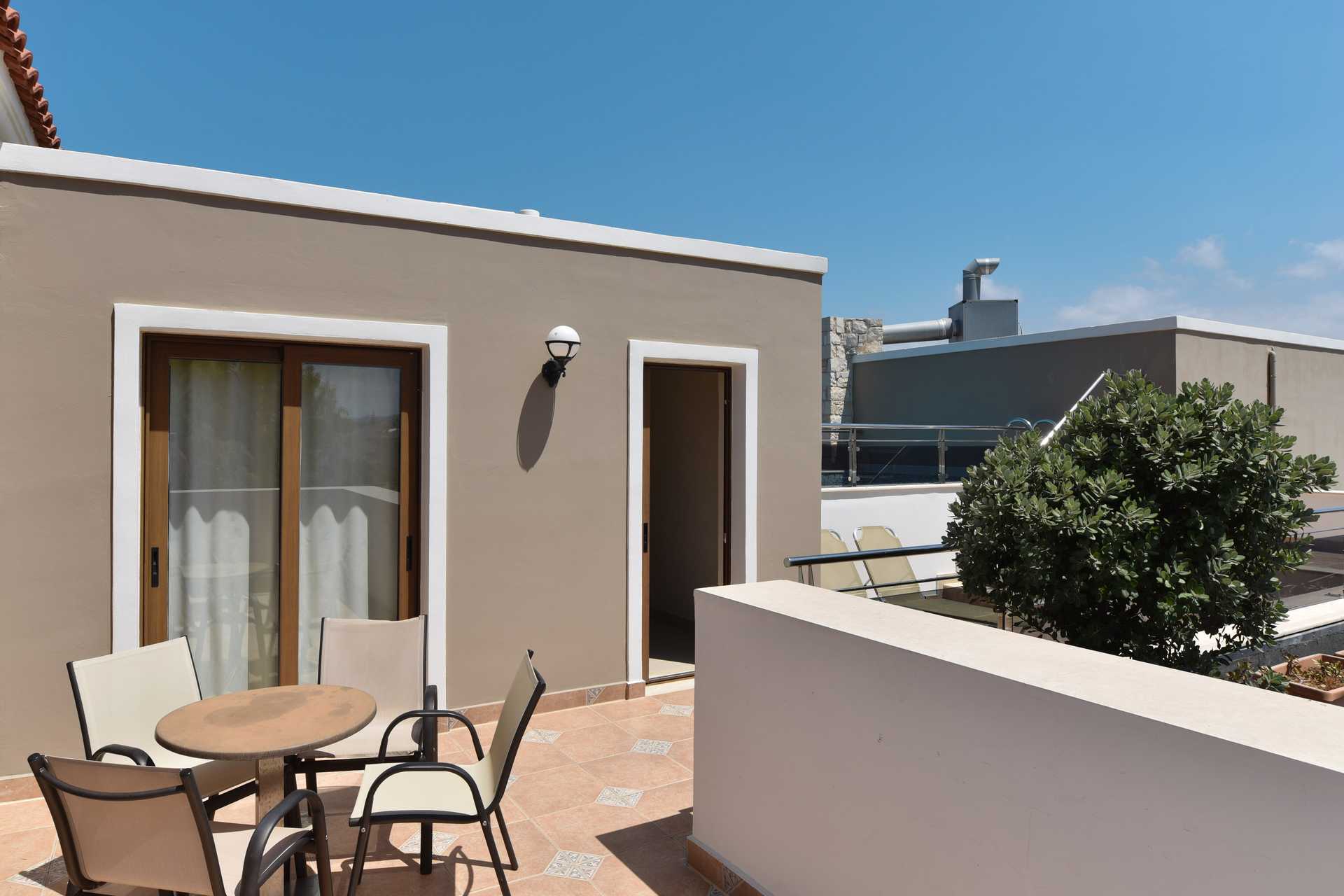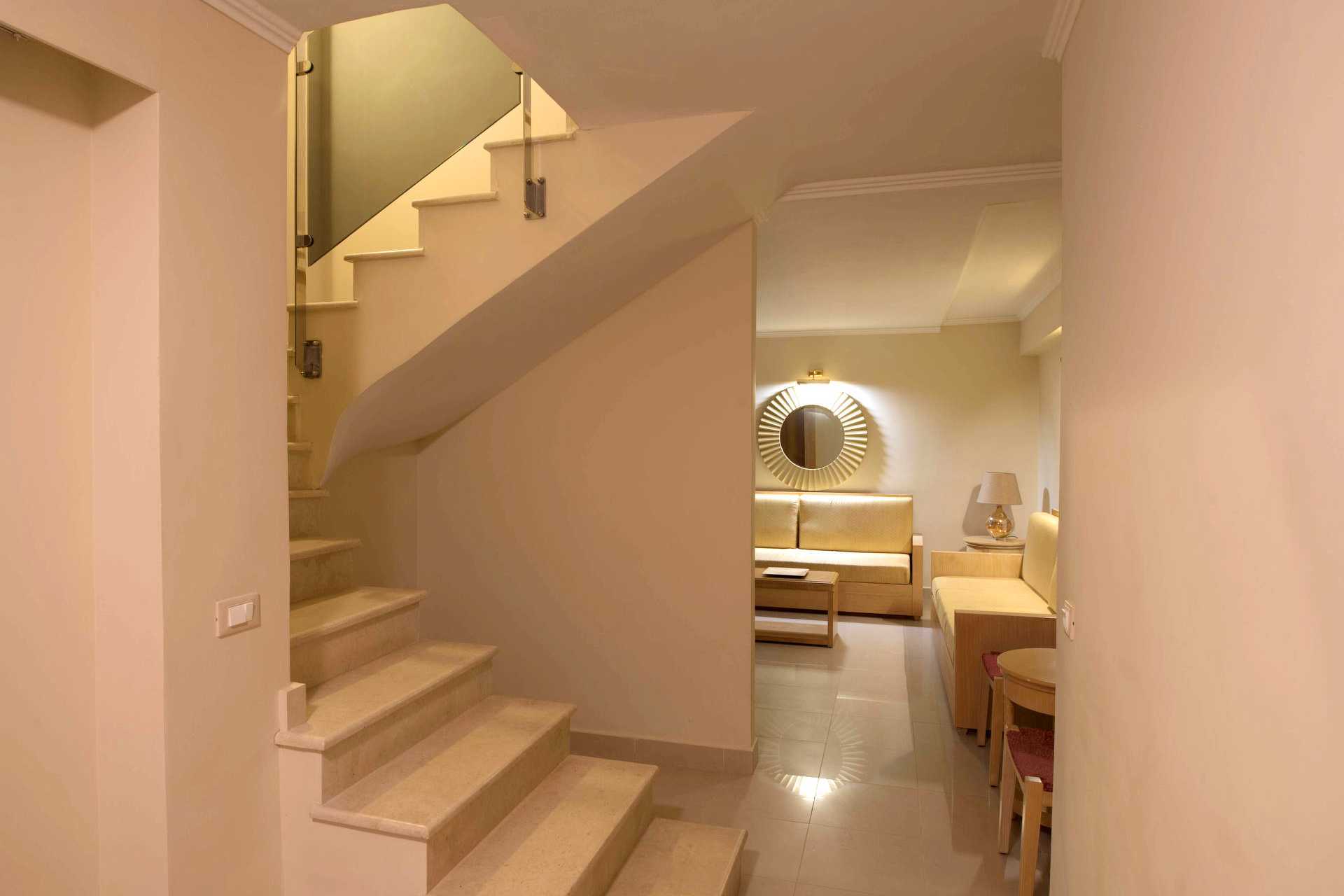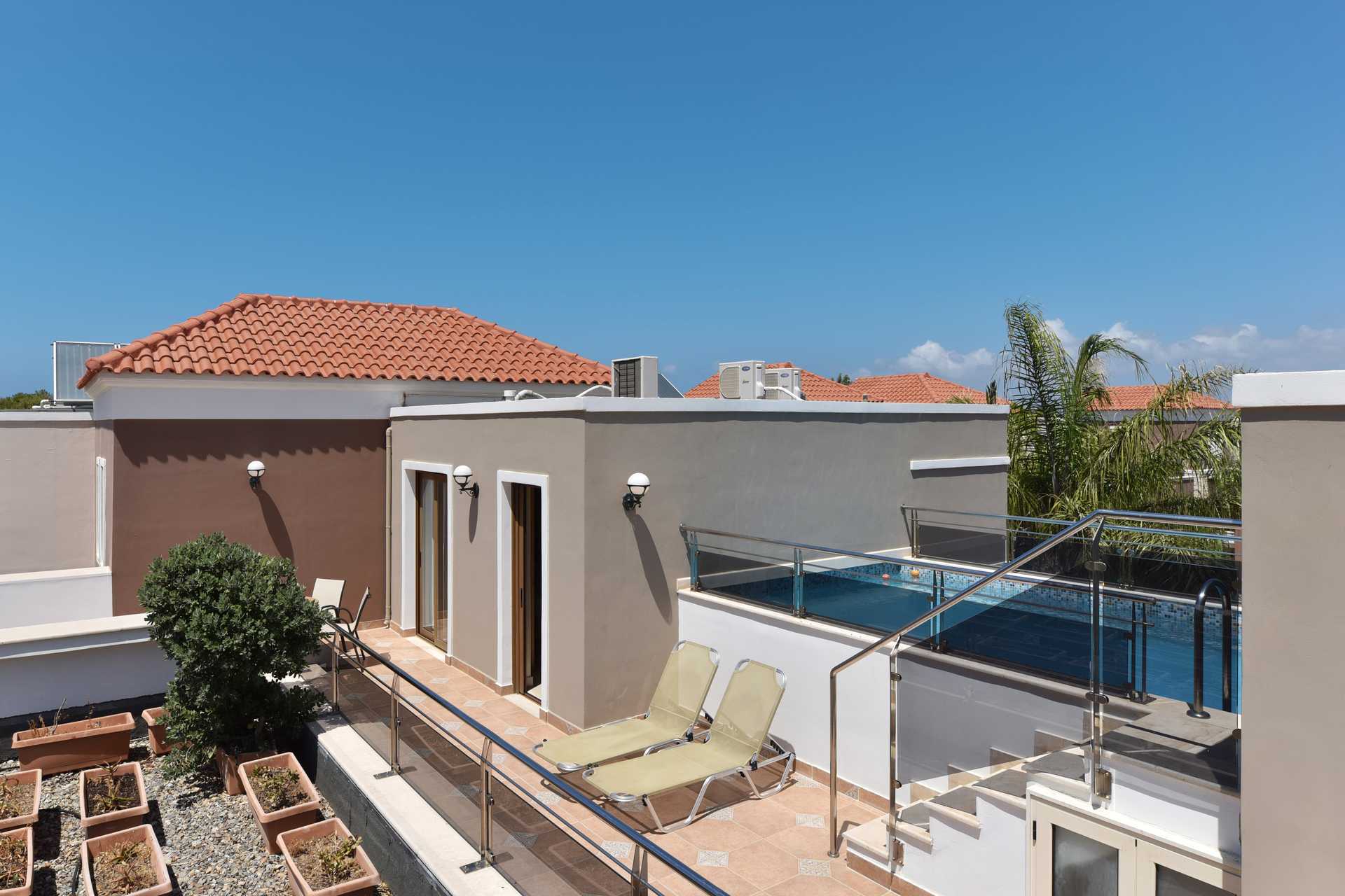 Kaksikerroksinen kolmio, jossa oma uima-allas, sijaitsevat toisessa ja kolmannessa kerroksessa. Parveke, koko ja muoto vaihtelee. Omalle uima-altaalle pääsee parvekkeelta portaita pitkin. Sisääntulokerroksessa on yhdistetty olohuone ja keittokomero sekä makuuhuone, jossa kaksi erillistä vuodetta tai parivuode ja kylpyhuone. Yläkerrassa on makuuhuone, jossa kaksi erillistä vuodetta tai parivuode ja kylpyhuone. Lisävuodemahdollisuus vuodesohvasta. Minikeittiö, jossa jääkaappi, keittolevyt, mikroaaltouuni, vedenkeitin, kahvinkeitin, leivänpaahdin ja yksinkertaiset keittiövälineet. Maksuton wifi ja ilmastointi. Tallelokero lisämaksusta. Tv kansainvälisillä kanavilla. Hiustenkuivain. Kylpyhuoneessa suihku ja wc. Siivous 6 krt/viikko.