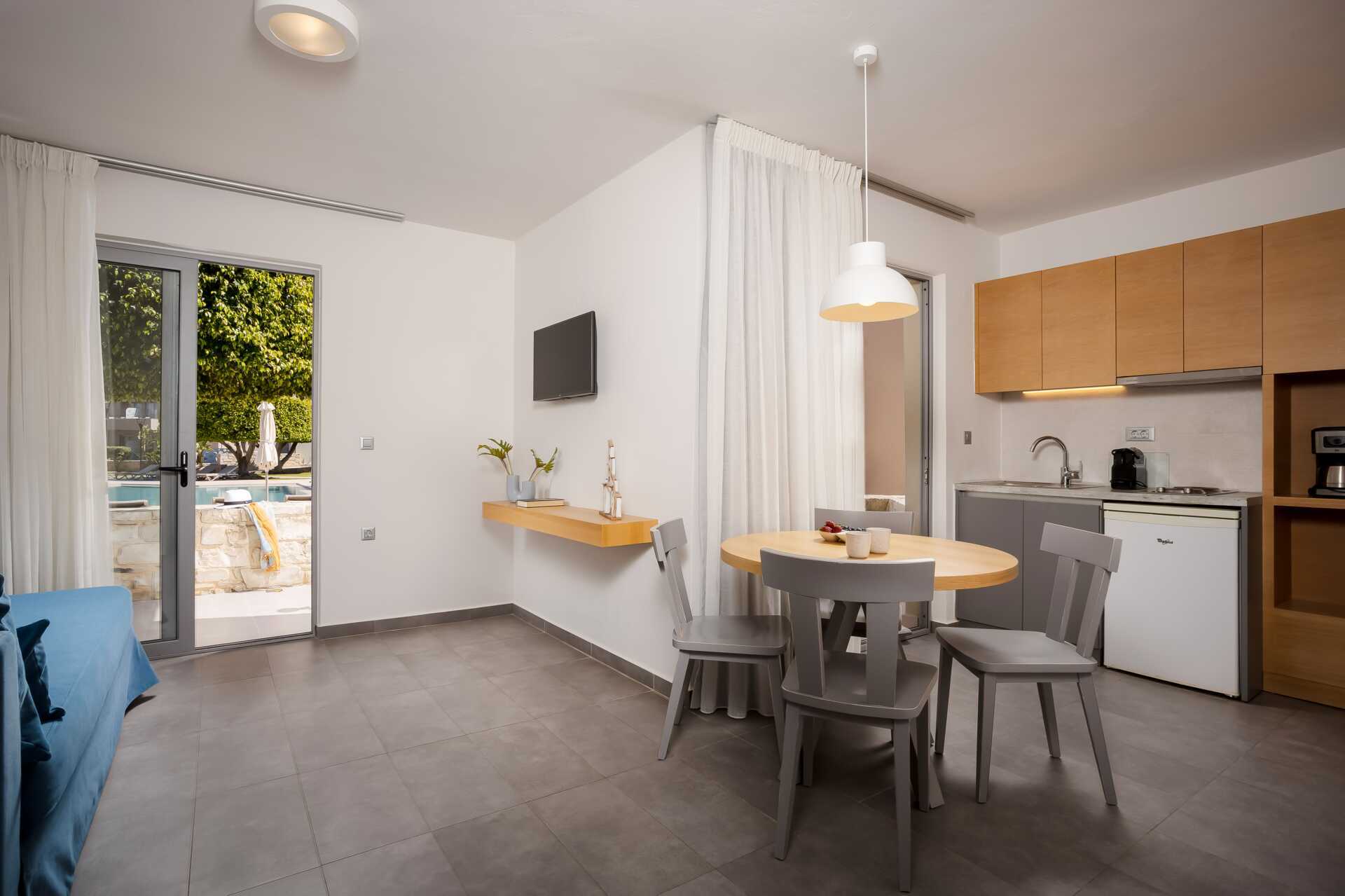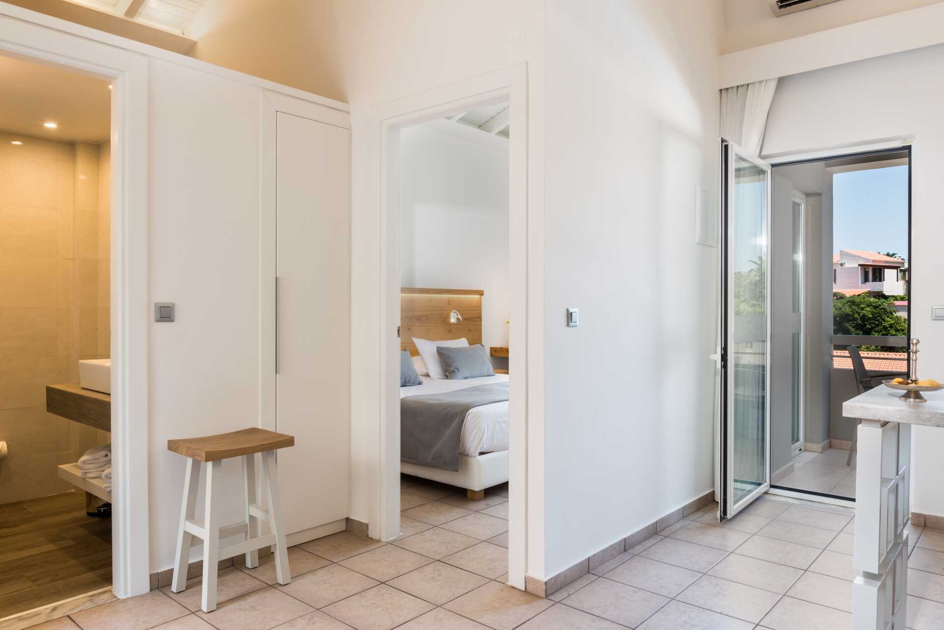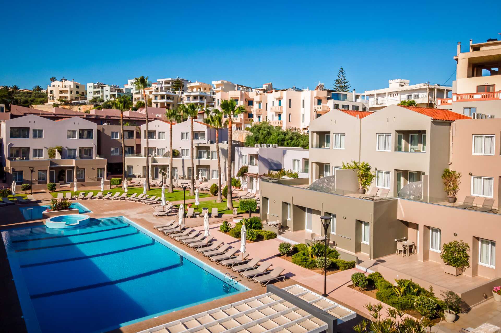 Kolmio parvekkeella allasnäköalalla tai suurella parvekkeella allasnäköalalla. Huoneistot sijaitsevat Village-osiossa. Kaksi makuuhuonetta ja yhdistetty olohuone sekä minikeittiö. Kaksi yhden hengen sänkyä molemmissa makuuhuoneissa. Minikeittiössä keittolevyt, jääkaappi, kahvinkeitin, vedenkeitin ja yksinkertainen keittiövarustus. Maksuton wifi, ilmastointi ja tallelokero. iImastointi on saatavilla jokaiseen huoneeseen. Tv kansainvälisillä kanavilla. Hiustenkuivain. Kylpyamme tai suihku ja wc. Siivous 6 krt/viikko.