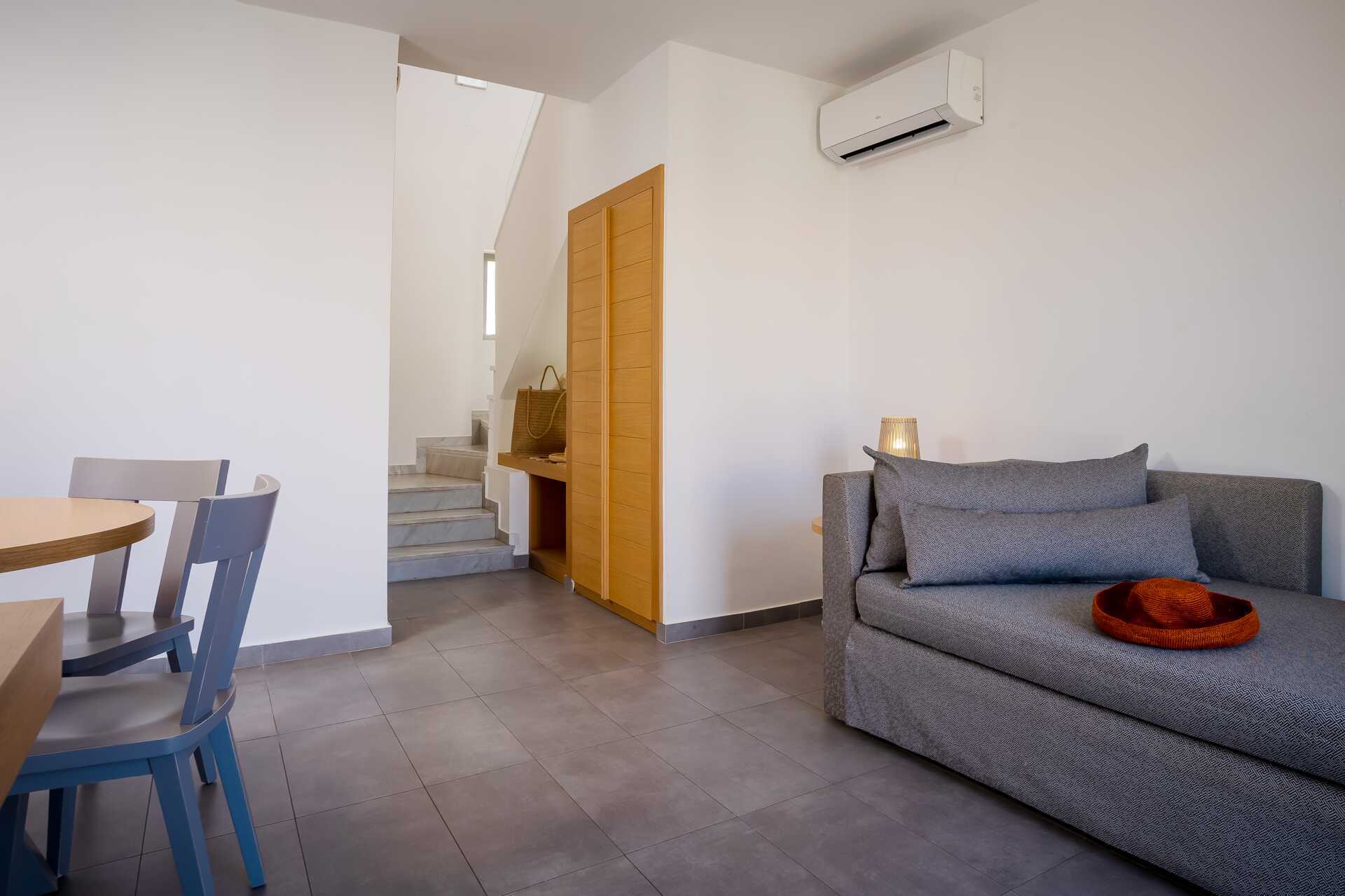 Kaksikerroksinen kaksio, parvekkeella, joista osassa on allasnäköalalla. Huoneistot sijaitsevat Elina-osassa. Sisääntulokerroksessa on yhdistetty olohuone ja minikeittiö, lisävuoteet vuodesohvasta, kylpyhuone suihkulla ja wc. Minikeittiössä keittolevyt, jääkaappi, kahvinkeitin, vedenkeitin ja yksinkertainen keittiövarustus. Yläkerrassa on makuuhuone, jossa kaksi erillistä vuodetta, parveke ja erillinen wc. Maksuton wifi, ilmastointi ja tallelokero. Tv kansainvälisillä kanavilla. Hiustenkuivain. Siivous 6 krt/viikko. Pinnasänky on saatavilla vain alemmassa kerroksessa (sisäänkäynnin kerros), joten emme suosittele pinnasängyn käyttöä tässä huoneistossa.
