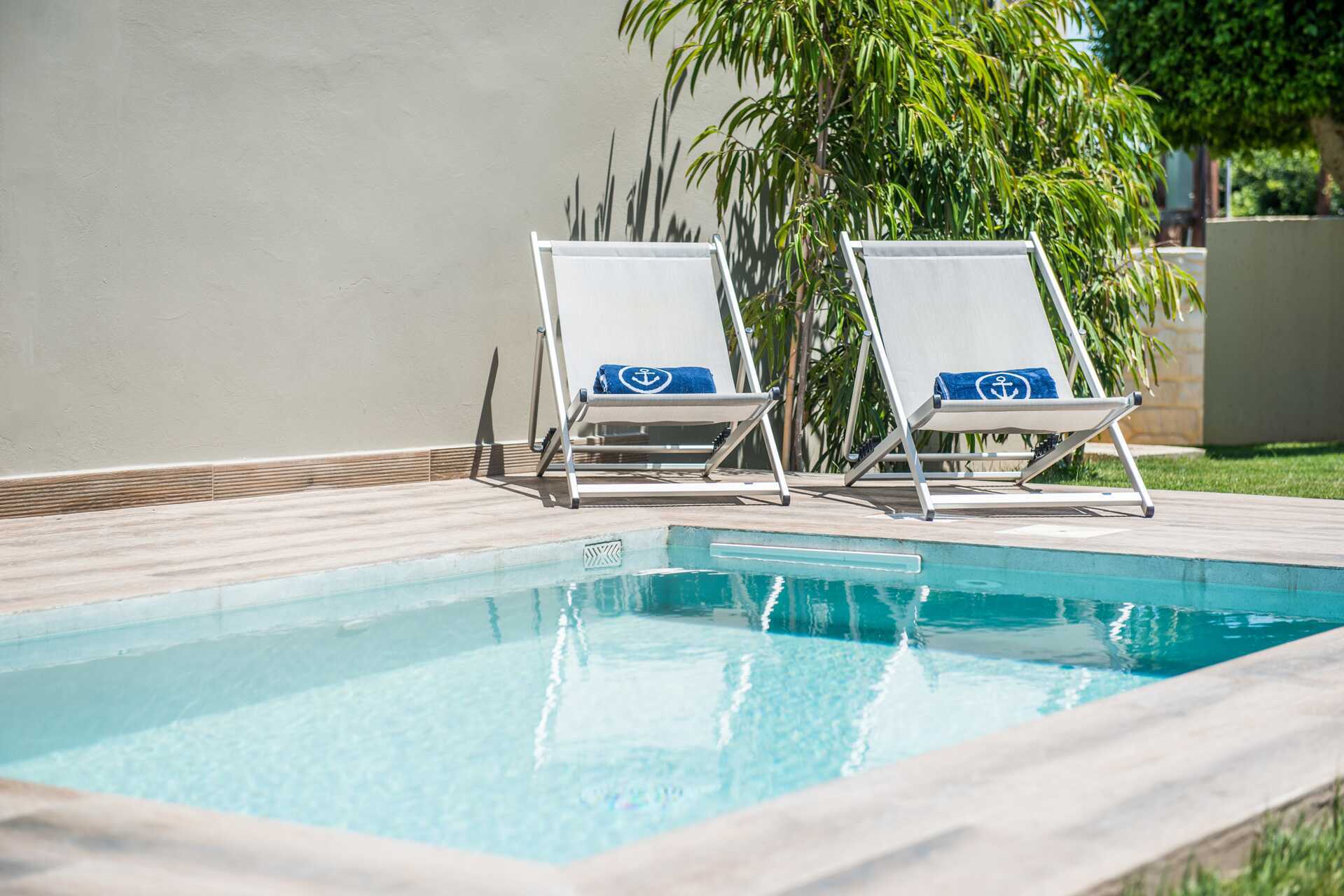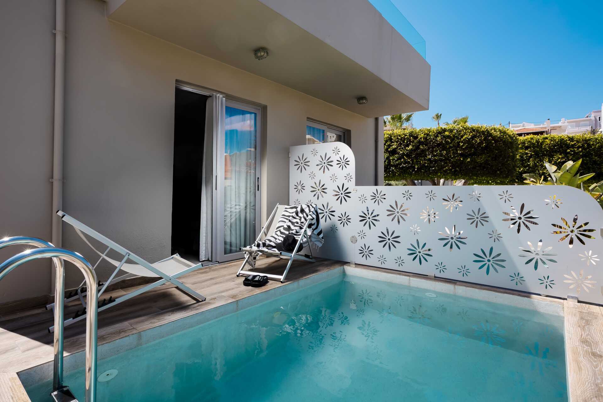 Kaksikerroksinen kaksio parvekkeella ja oma uima-allas. Huoneistot sijaitsevat Elina-osassa. Uima-altaan äärellä pöytä ja tuolit sekä aurinkotuolit. Portaat altaaseen. Sisääntulokerroksessa on yhdistetty olohuone ja minikeittiö ja mahdollisuus lisävuoteisiin vuodesohvasta, kylpyhuone suihkulla ja wc. Minikeittiössä keittolevyt, jääkaappi, kahvinkeitin, vedenkeitin ja yksinkertainen keittiövarustus. Yläkerrassa makuuhuone, wc ja parveke. Ovi huoneiden välissä. Maksuton wifi, ilmastointi ja tallelokero. Tv kansainvälisillä kanavilla. Hiustenkuivain. Siivous 6 krt/viikko. Pinnasänky on saatavilla vain alakerrassa, joten emme suosittele vauvansängyn käyttöä tässä huoneistossa.
