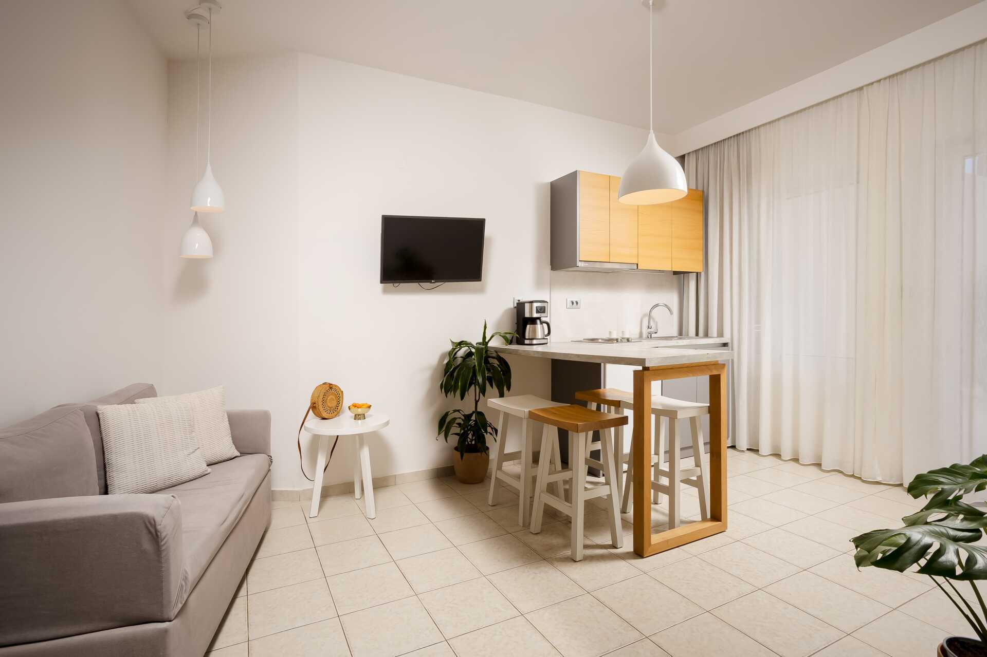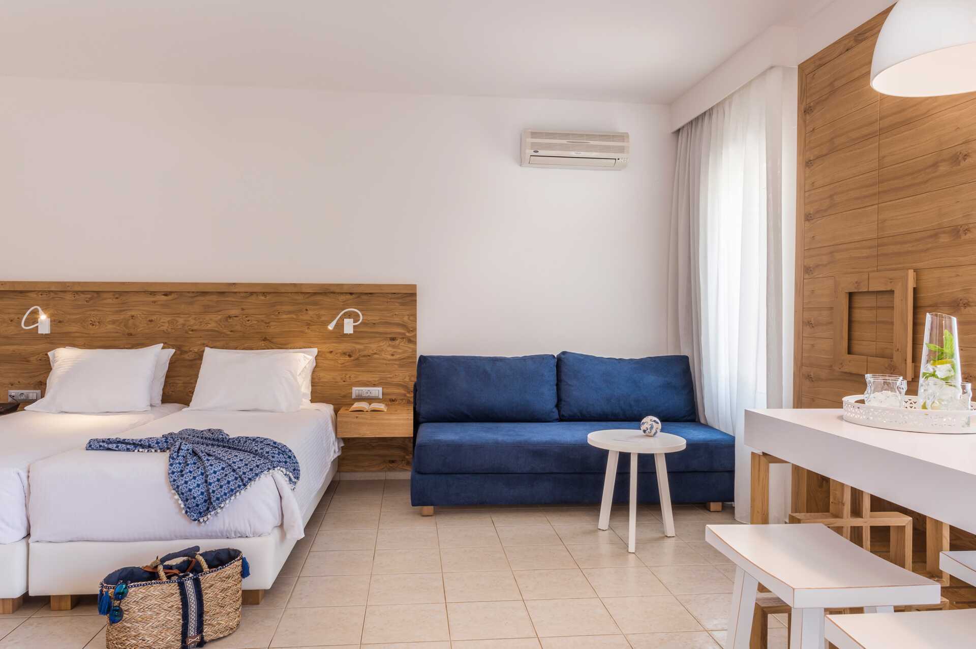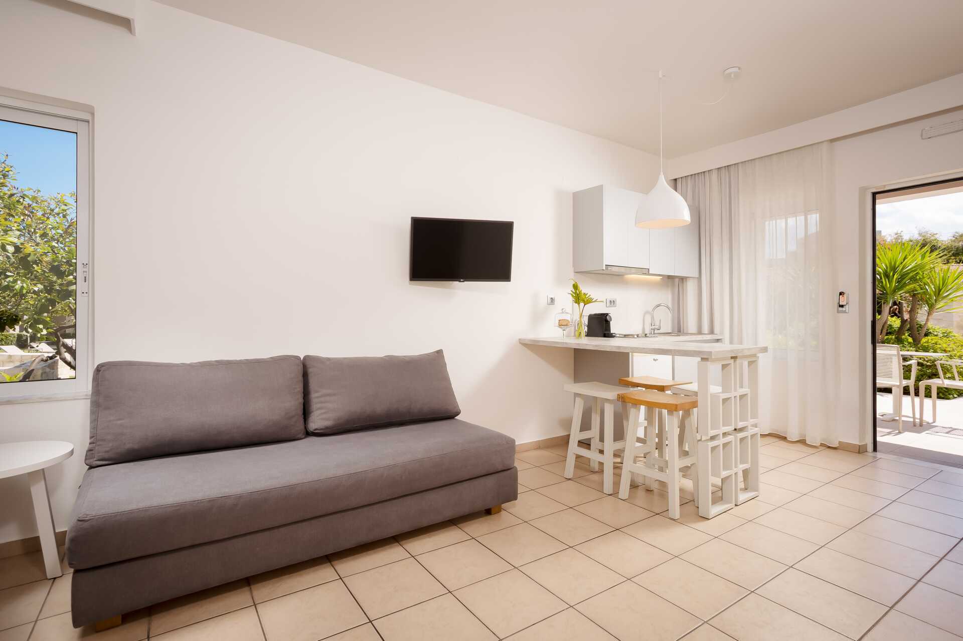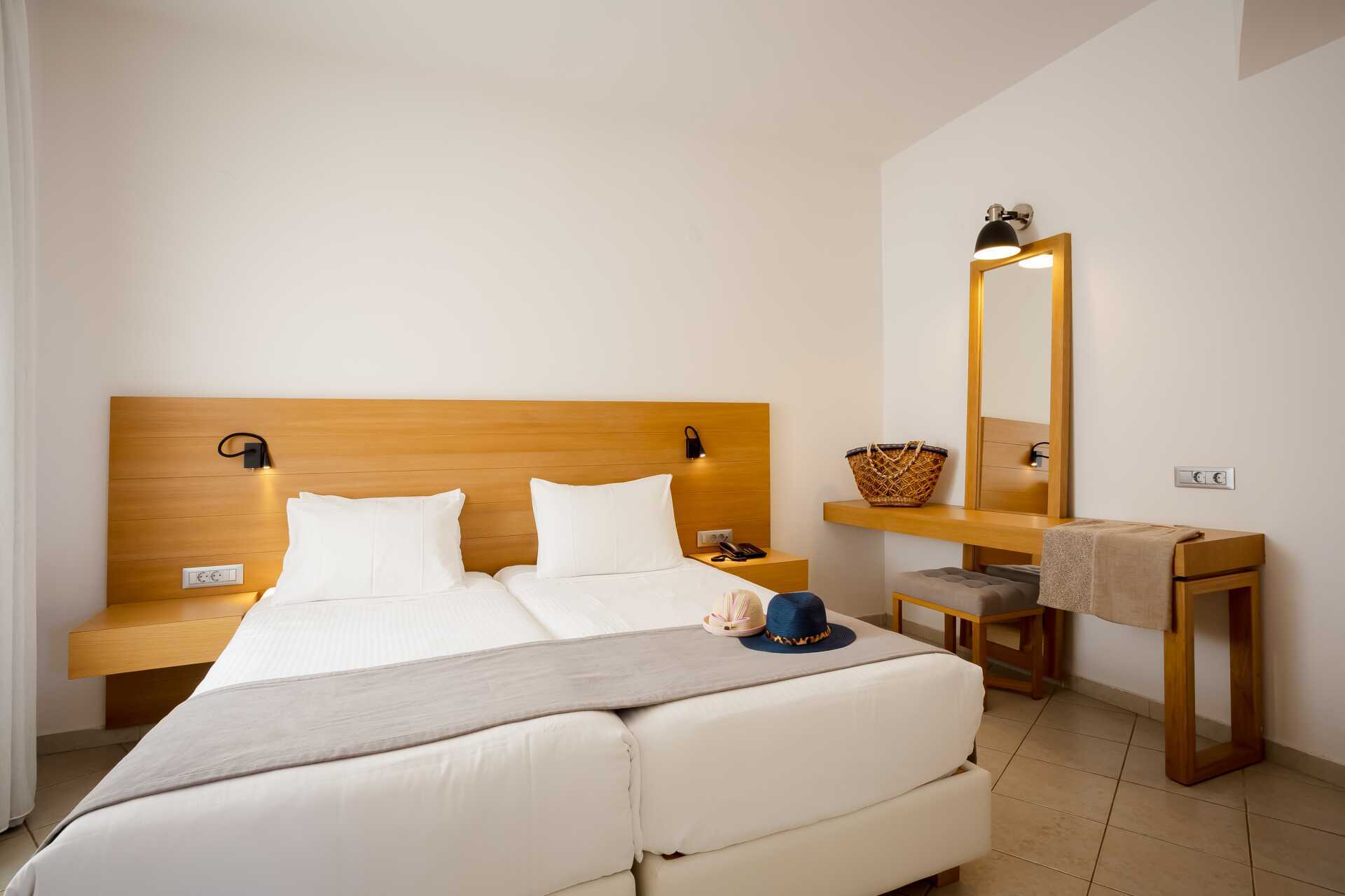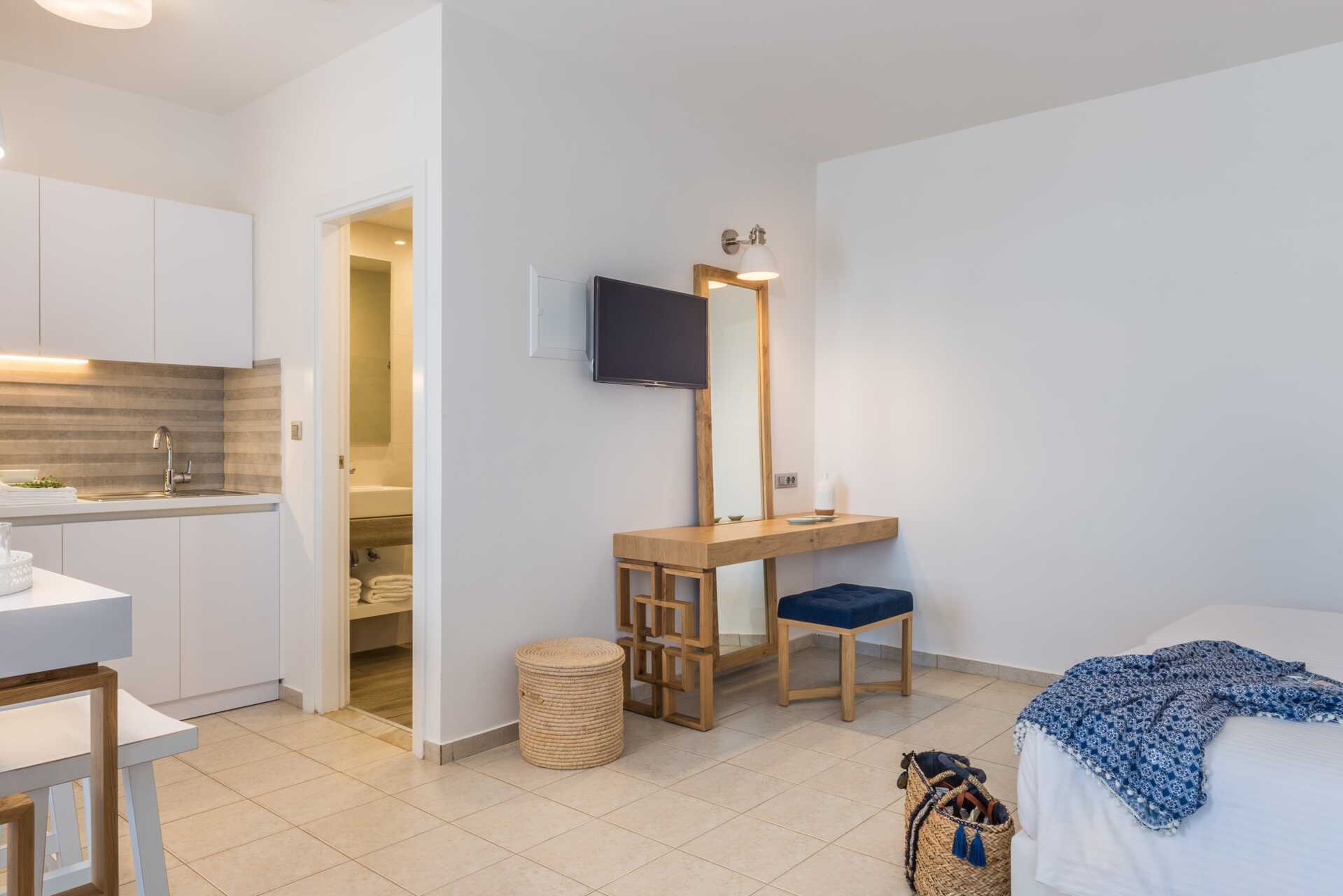Yksiö jossa parveke, maaterassi (johon pääsee portaita pitkin), maaparveke tai jaettu ulkotila, joissakin asunnoissa on näköala uima-altaalle. Yksiöt sijaitsevat kaikissa hotellin osissa. Yhdistetty makuuhuone ja minikeittiö. Kaksi yhden hengen sänkyä. Lisävuodemahdollisuus vuodesohvasta. Minikeittiössä keittolevyt, jääkaappi, kahvinkeitin, vedenkeitin ja yksinkertainen keittiövarustus. Maksuton wifi, ilmastointi ja tallelokero. Tv kansainvälisillä kanavilla. Kylpyamme tai suihku ja wc. Hiustenkuivain. Siivous 6 krt/viikko. Vauvansänkyä käytettäessä asunnosta tulee ahdas.