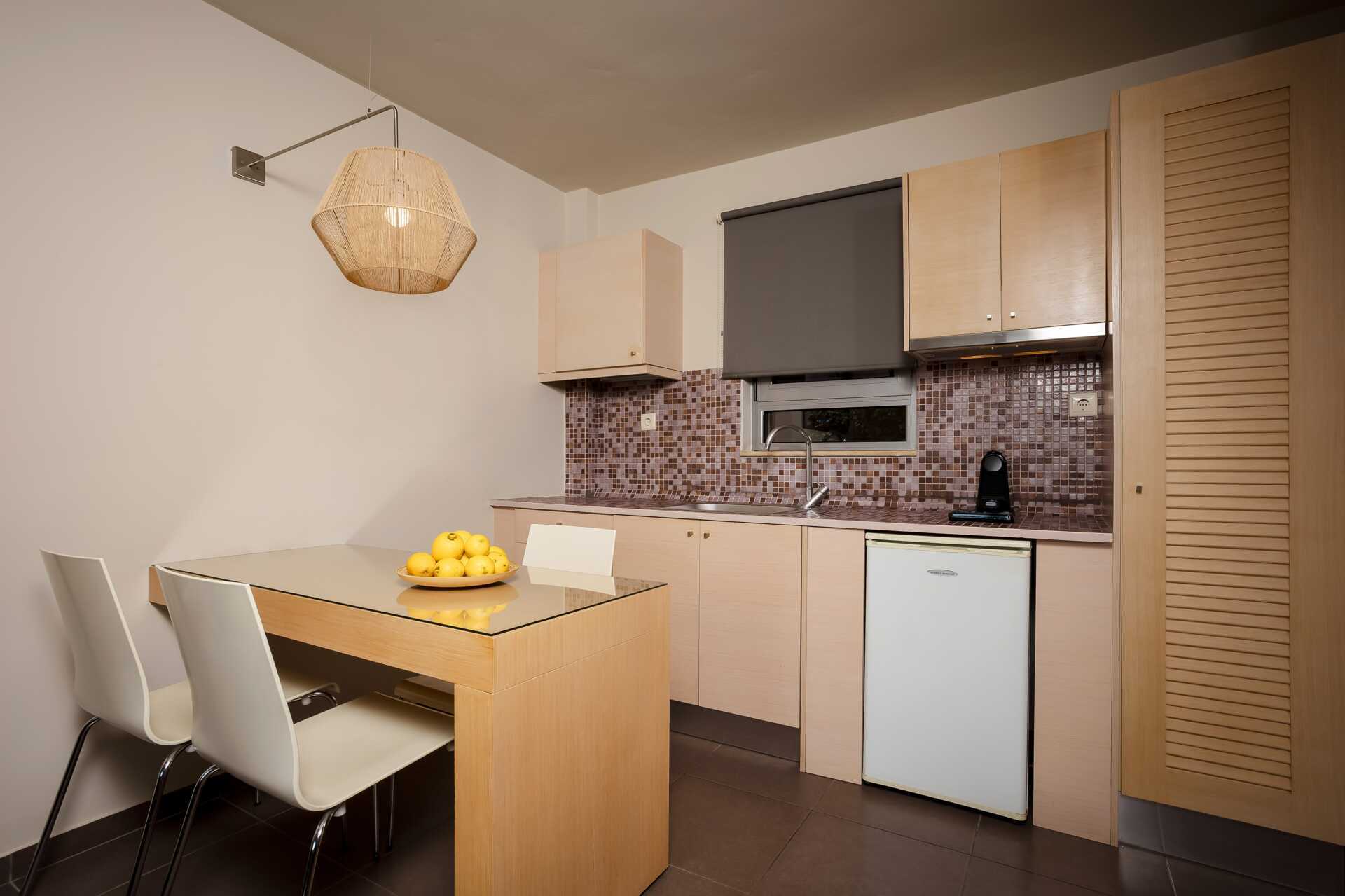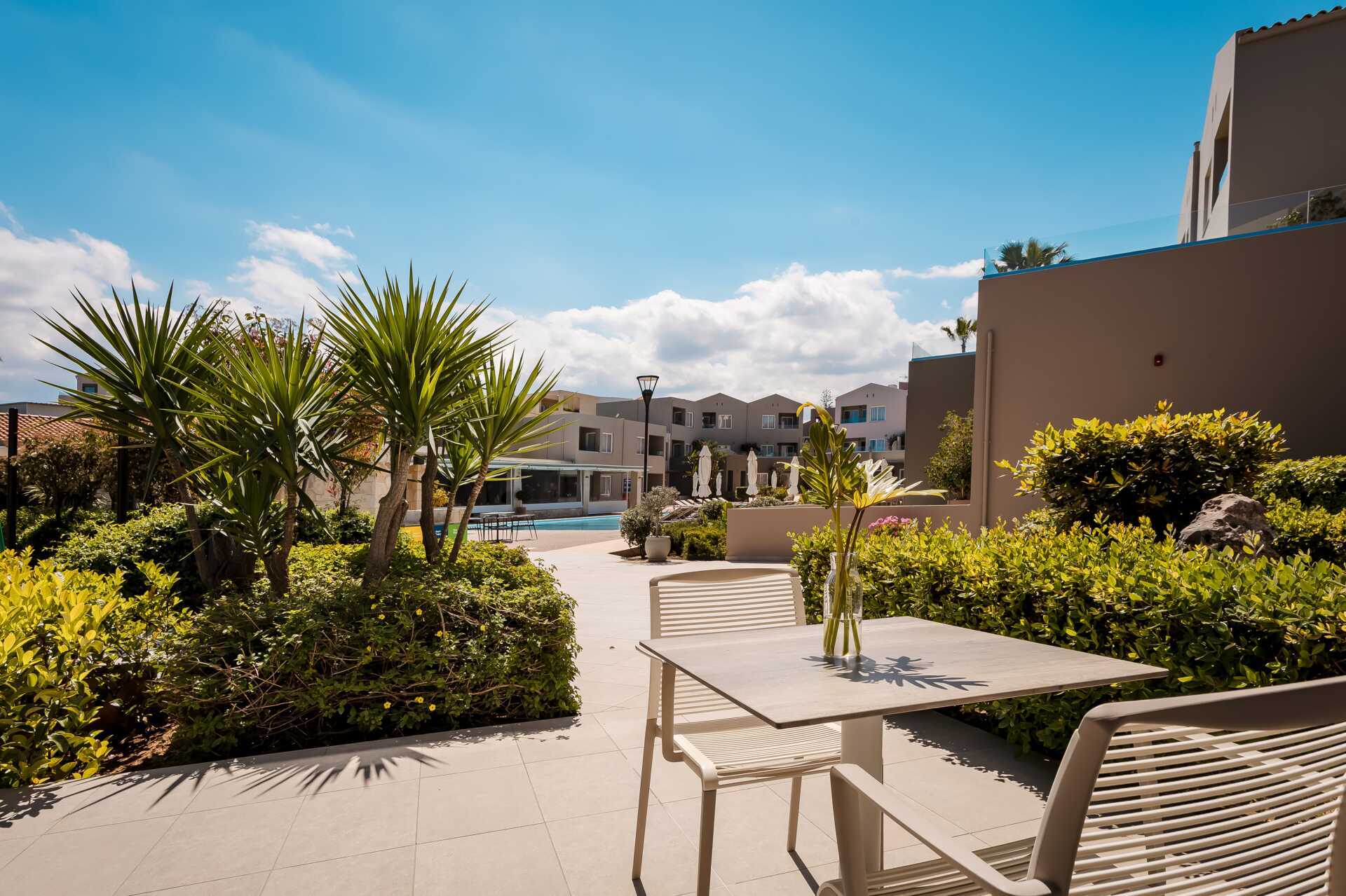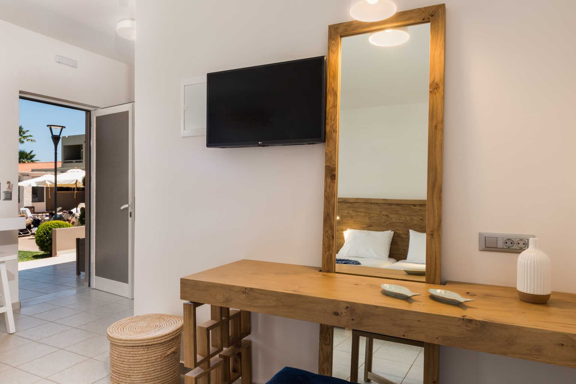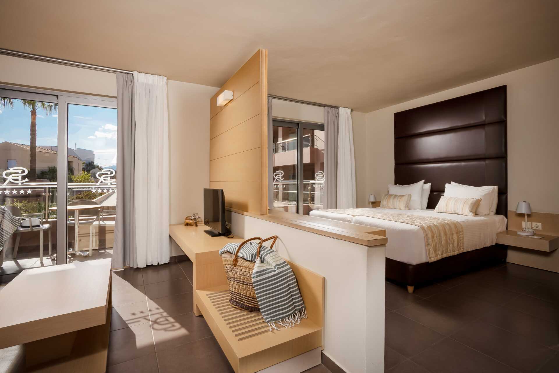 Yksiö jossa parveke, maaterassi (johon pääsee portaita pitkin), maaparveke tai jaettu ulkotila, joissakin asunnoissa on näköala uima-altaalle. Yksiöt sijaitsevat kaikissa hotellin osissa. Yhdistetty makuuhuone ja minikeittiö. Kaksi yhden hengen sänkyä. Lisävuodemahdollisuus vuodesohvasta. Minikeittiössä keittolevyt, jääkaappi, kahvinkeitin, vedenkeitin ja yksinkertainen keittiövarustus. Maksuton wifi, ilmastointi ja tallelokero. Tv kansainvälisillä kanavilla. Kylpyamme tai suihku ja wc. Hiustenkuivain. Siivous 6 krt/viikko. Vauvansänkyä käytettäessä asunnosta tulee ahdas.