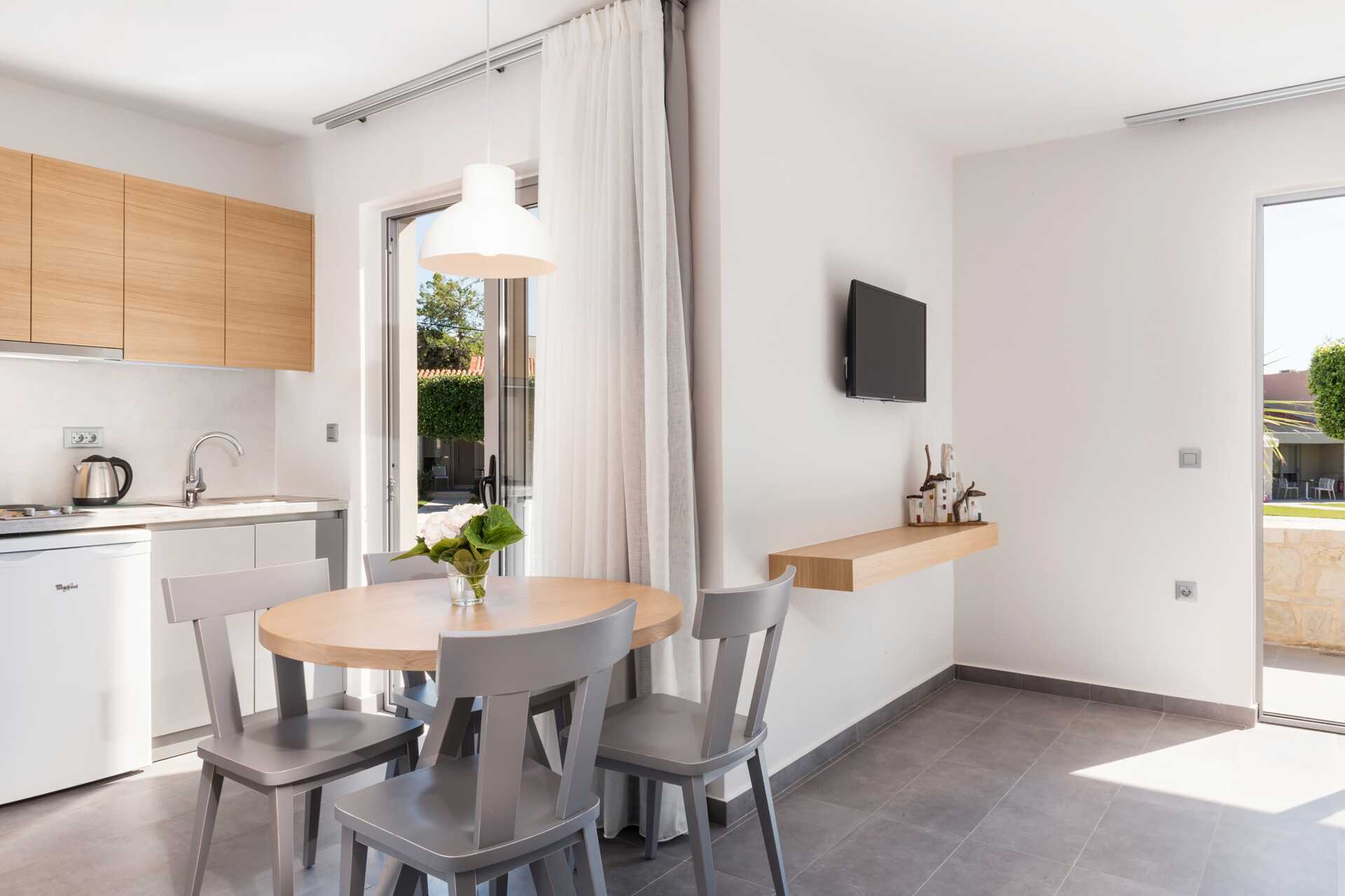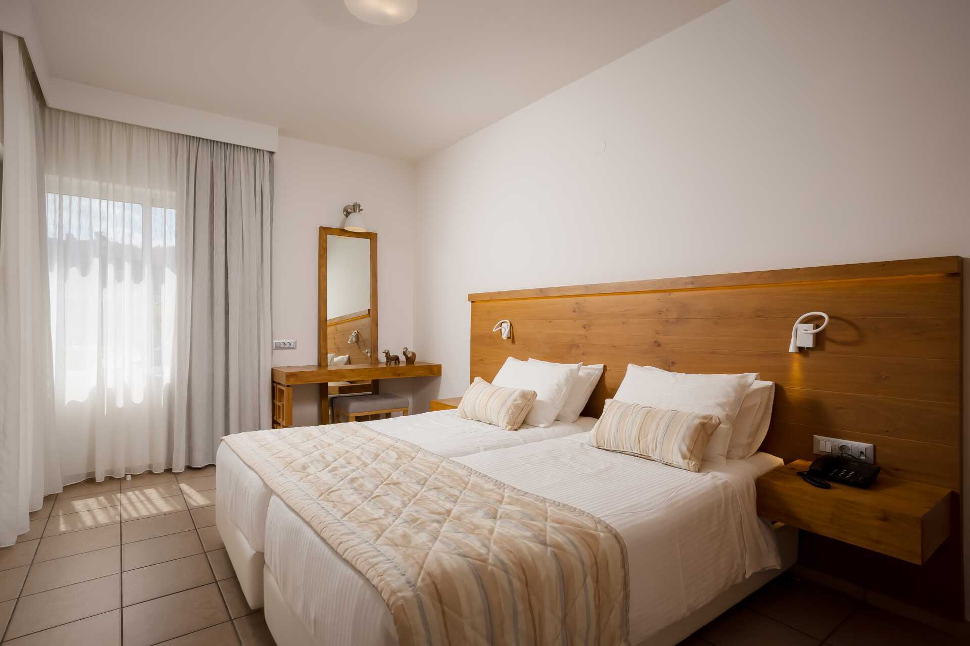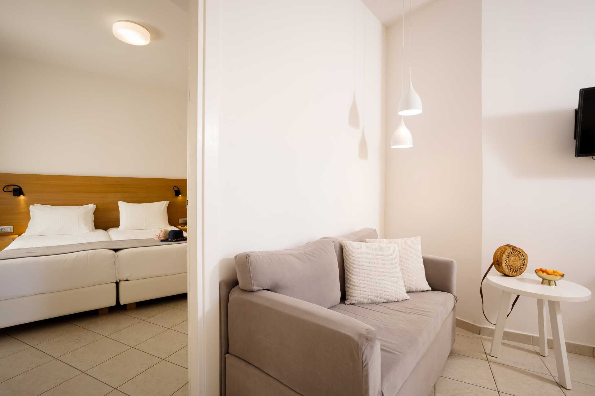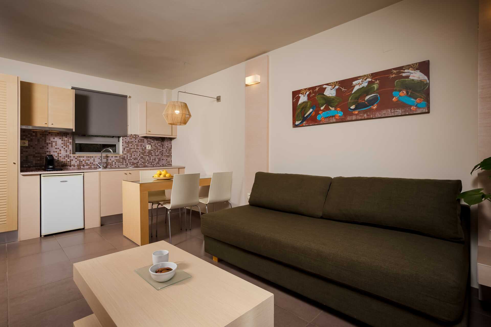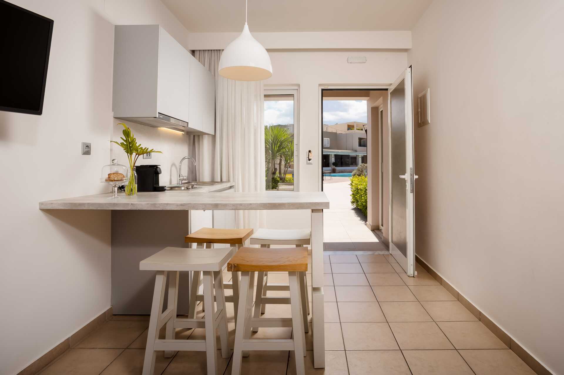 Yksiö jossa parveke, maaterassi (johon pääsee portaita pitkin), maaparveke tai jaettu ulkotila, joissakin asunnoissa on näköala uima-altaalle. Yksiöt sijaitsevat kaikissa hotellin osissa. Yhdistetty makuuhuone ja minikeittiö. Kaksi yhden hengen sänkyä. Lisävuodemahdollisuus vuodesohvasta. Minikeittiössä keittolevyt, jääkaappi, kahvinkeitin, vedenkeitin ja yksinkertainen keittiövarustus. Maksuton wifi, ilmastointi ja tallelokero. Tv kansainvälisillä kanavilla. Kylpyamme tai suihku ja wc. Hiustenkuivain. Siivous 6 krt/viikko. Vauvansänkyä käytettäessä asunnosta tulee ahdas.