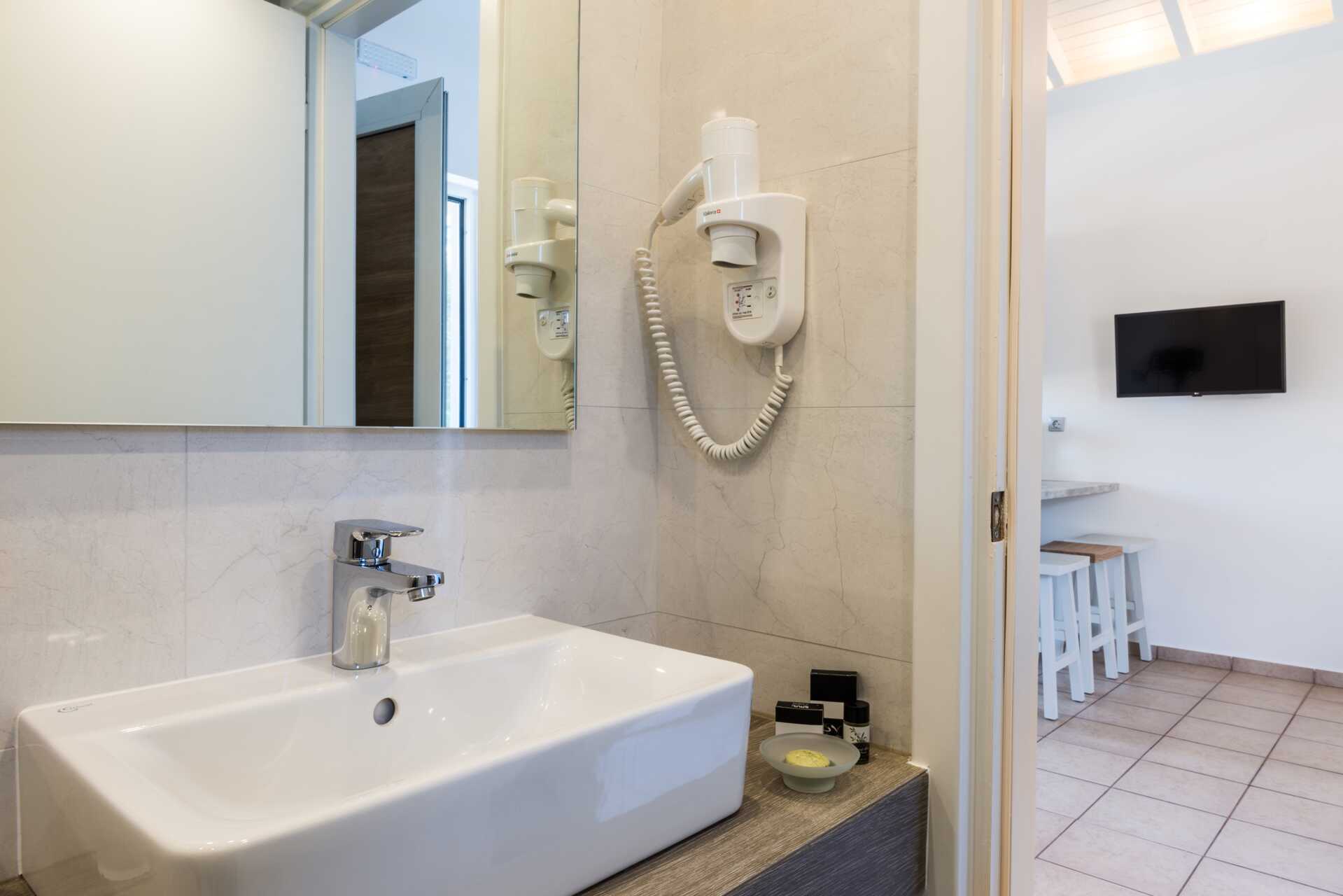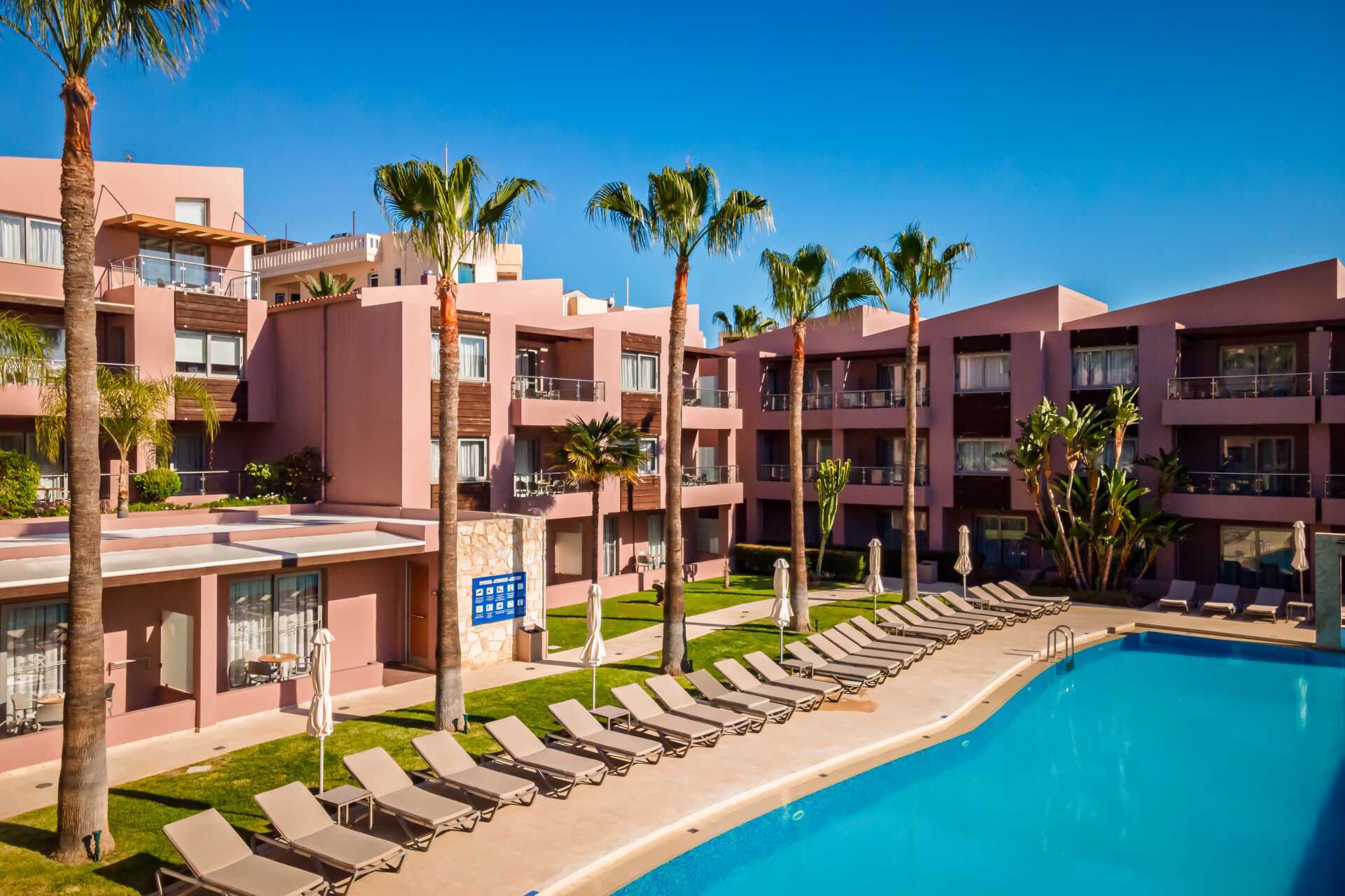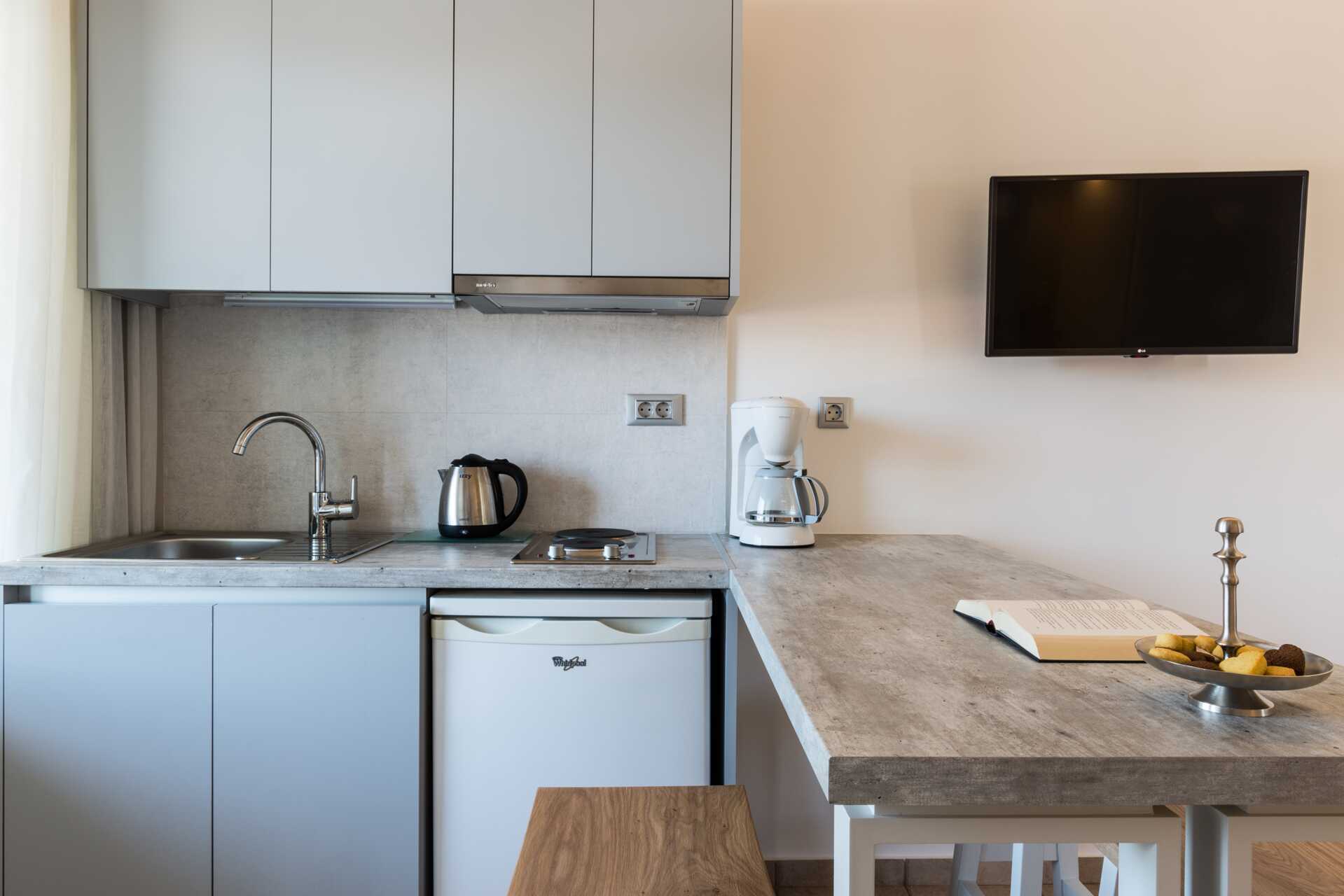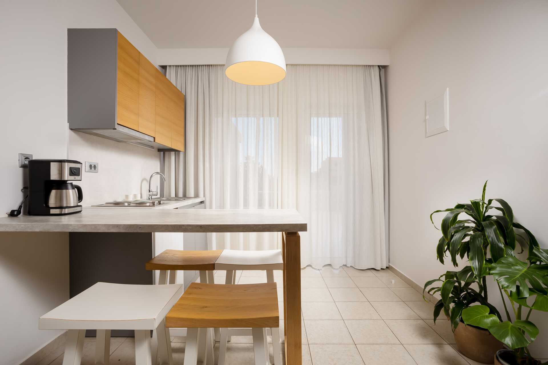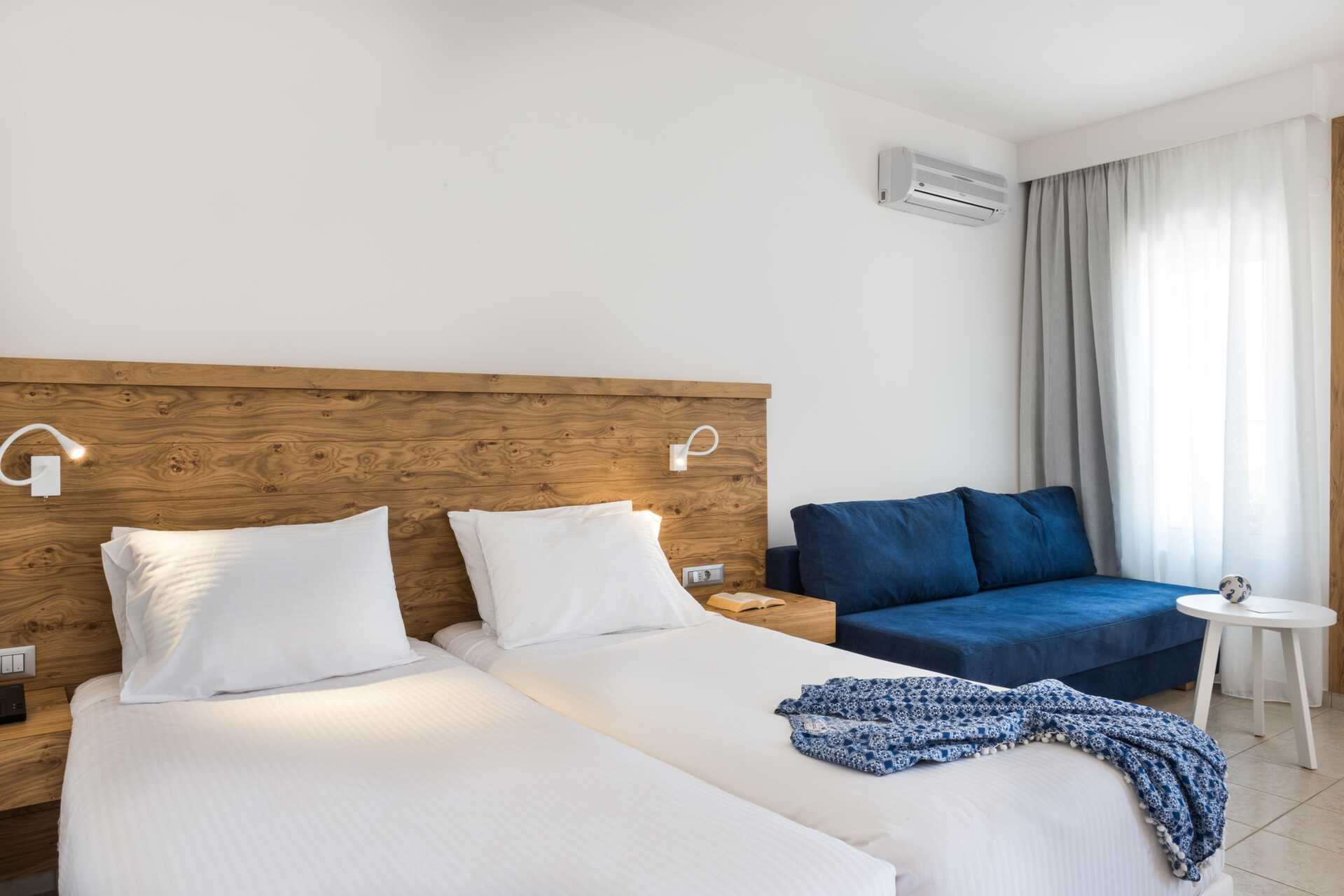Yksiö jossa parveke, maaterassi (johon pääsee portaita pitkin), maaparveke tai jaettu ulkotila, joissakin asunnoissa on näköala uima-altaalle. Yksiöt sijaitsevat kaikissa hotellin osissa. Yhdistetty makuuhuone ja minikeittiö. Kaksi yhden hengen sänkyä. Lisävuodemahdollisuus vuodesohvasta. Minikeittiössä keittolevyt, jääkaappi, kahvinkeitin, vedenkeitin ja yksinkertainen keittiövarustus. Maksuton wifi, ilmastointi ja tallelokero. Tv kansainvälisillä kanavilla. Kylpyamme tai suihku ja wc. Hiustenkuivain. Siivous 6 krt/viikko. Vauvansänkyä käytettäessä asunnosta tulee ahdas.