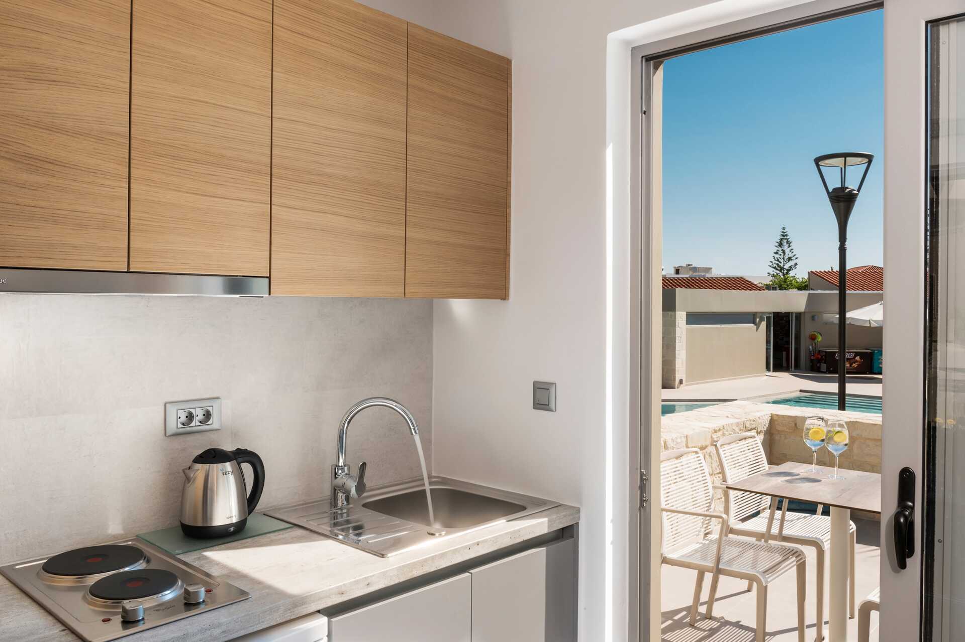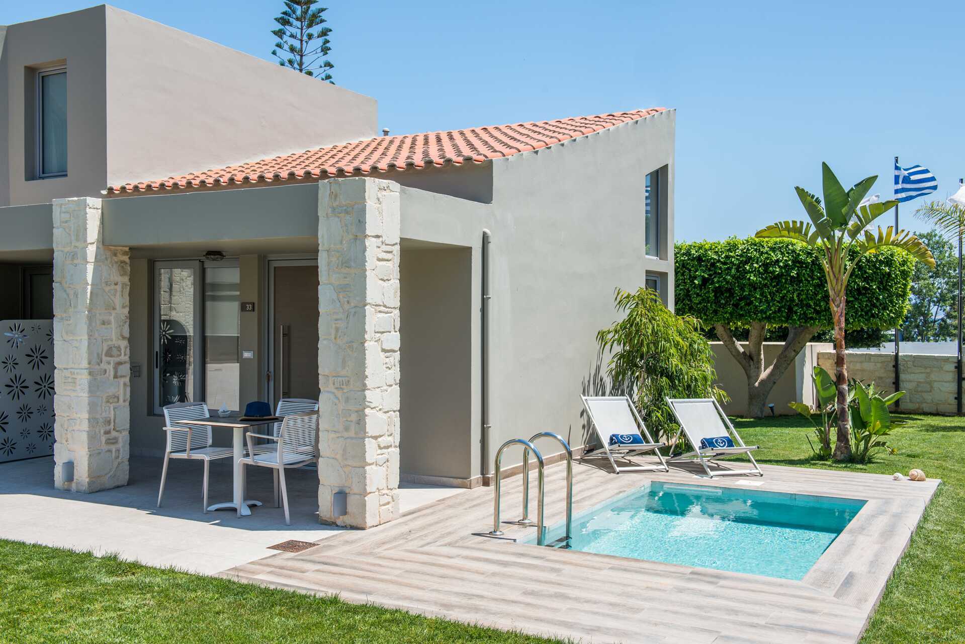 Yksiö maaterassilla ja oma uima-allas. Terassille pääsee portaita pitkin. Huoneistot sijaitsevat Elina-osassa. Terassilla on pöytä, tuoleja ja aurinkotuoleja. Yhdistetty makuuhuone ja minikeittiö. Kaksi yhden hengen sänkyä. Lisävuodemahdollisuus vuodesohvasta. Minikeittiössä keittolevyt, jääkaappi, kahvinkeitin, vedenkeitin ja yksinkertainen keittiövarustus. Maksuton wifi, ilmastointi ja tallelokero. Tv kansainvälisillä kanavilla. Hiustenkuivain. Kylpyhuoneessa suihku ja wc. Siivous 6 krt/viikko. Vauvansänkyä käytettäessä asunnosta tulee ahdas.