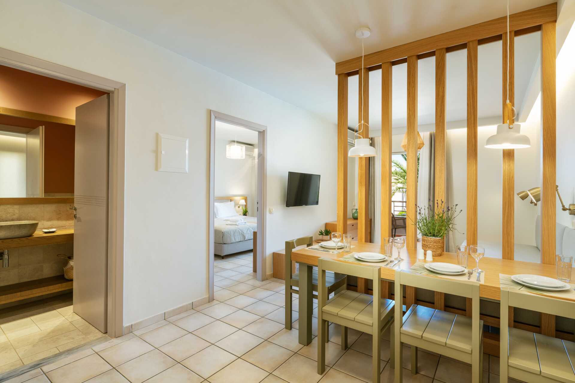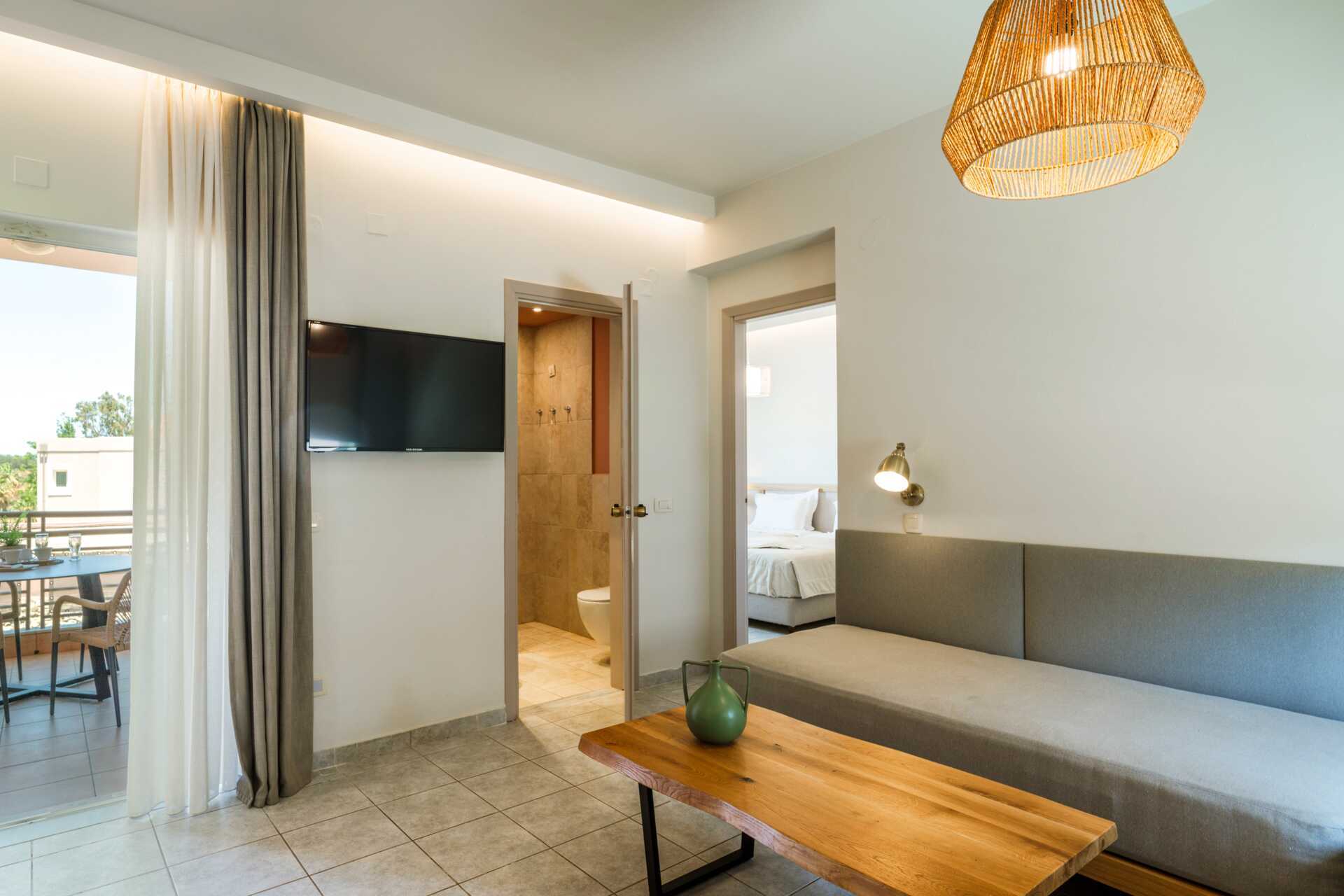 Kolmio parvekkeella. Kaksi makuuhuonetta, kaksi kylpyhuonetta ja yhdistetty olohuone minikeittiösaarekkeella. Parivuode tai kaksi erillistä vuodetta molemmissa makuuhuoneissa. Lisävuodemahdollisuus vuodesohvasta. Minikeittiössä keittolevyt, jääkaappi, kahvinkeitin, voileipägrilli ja yksinkeirtainen keittiövarustus. Maksuton wifi, ilmastointi ja tallelokero. Tv paikallisilla kanavilla. Hiustenkuivain. Suihku ja wc. Siivous 6 krt/viikko.