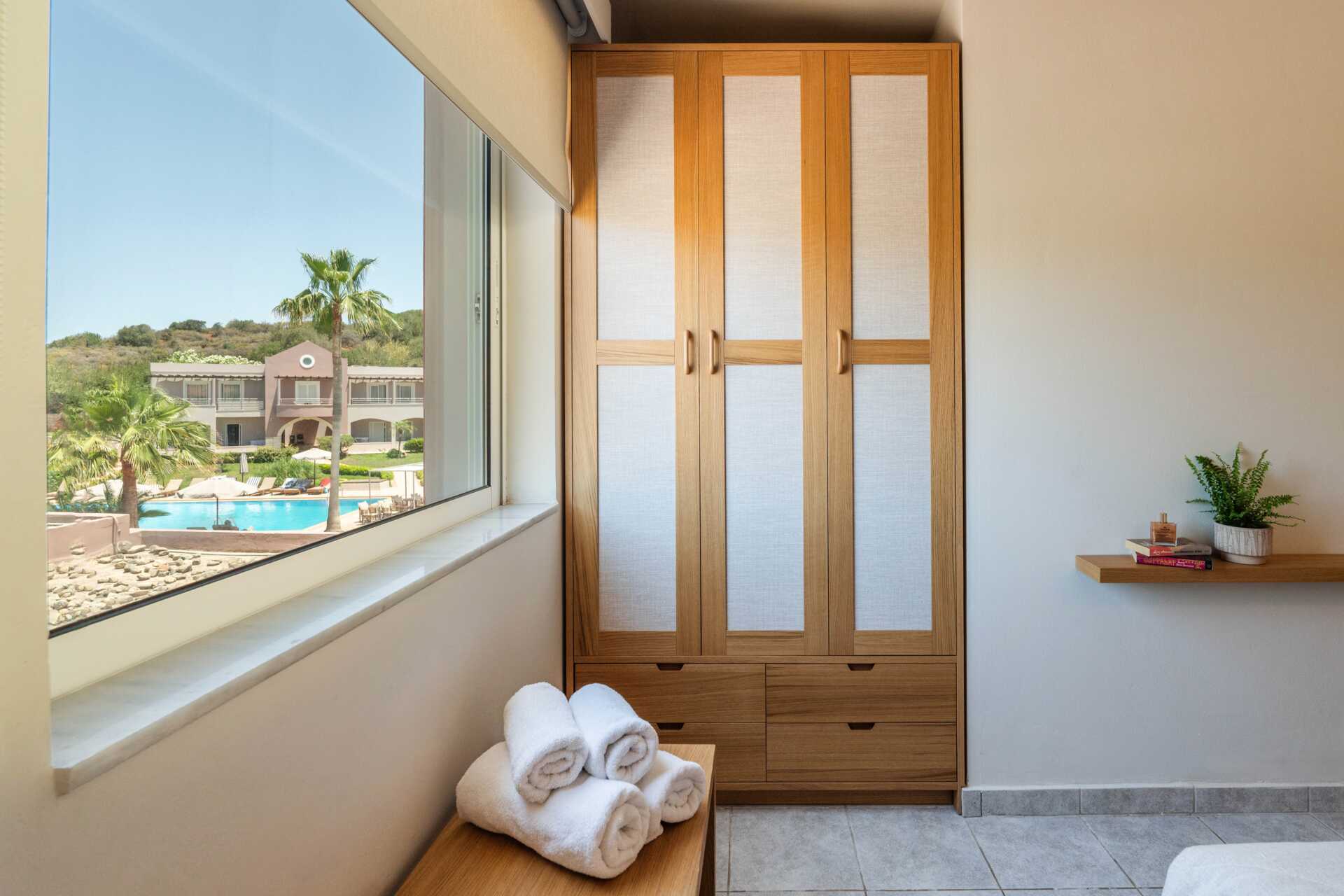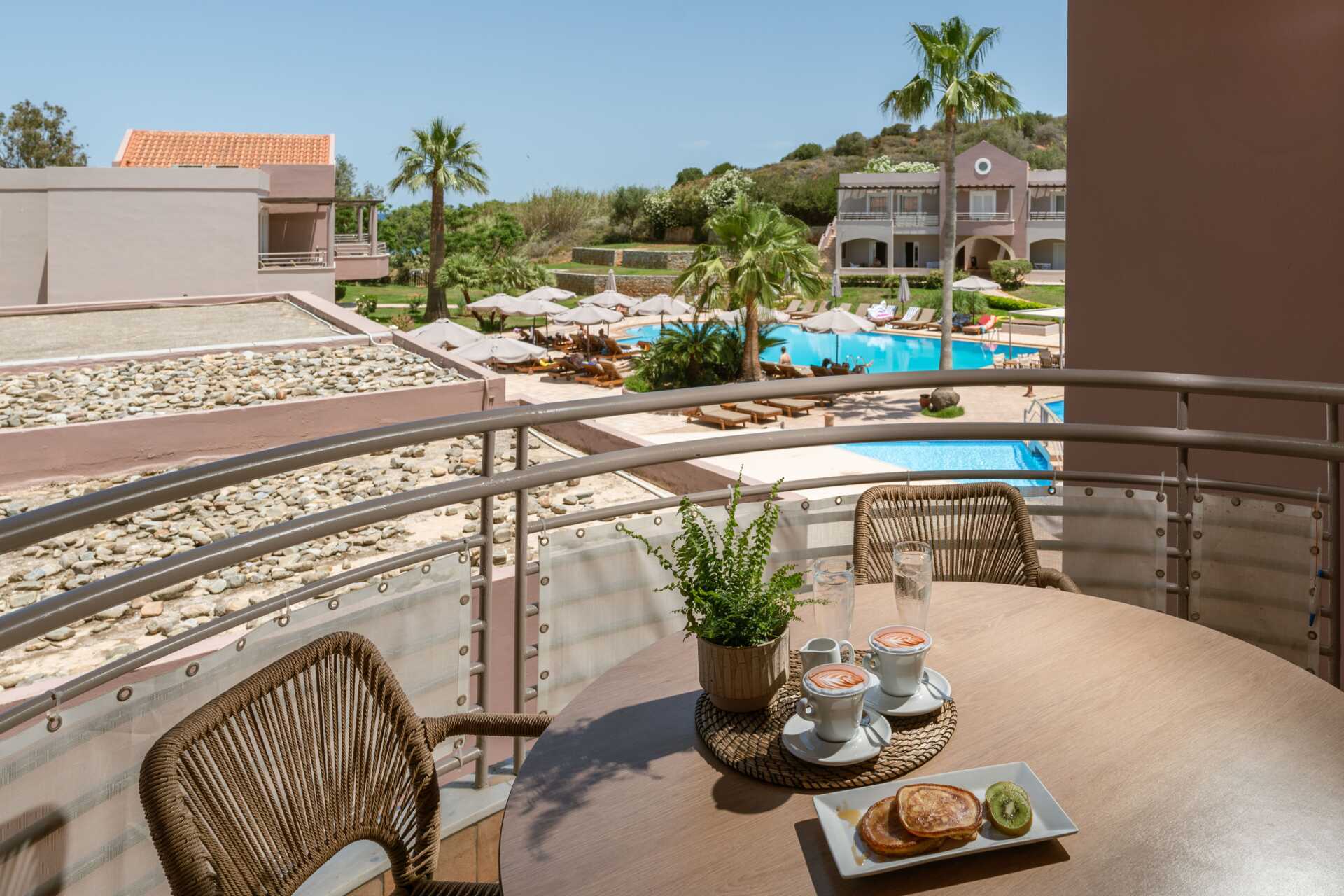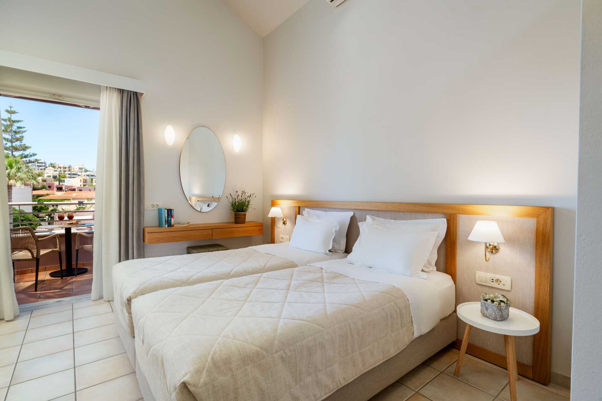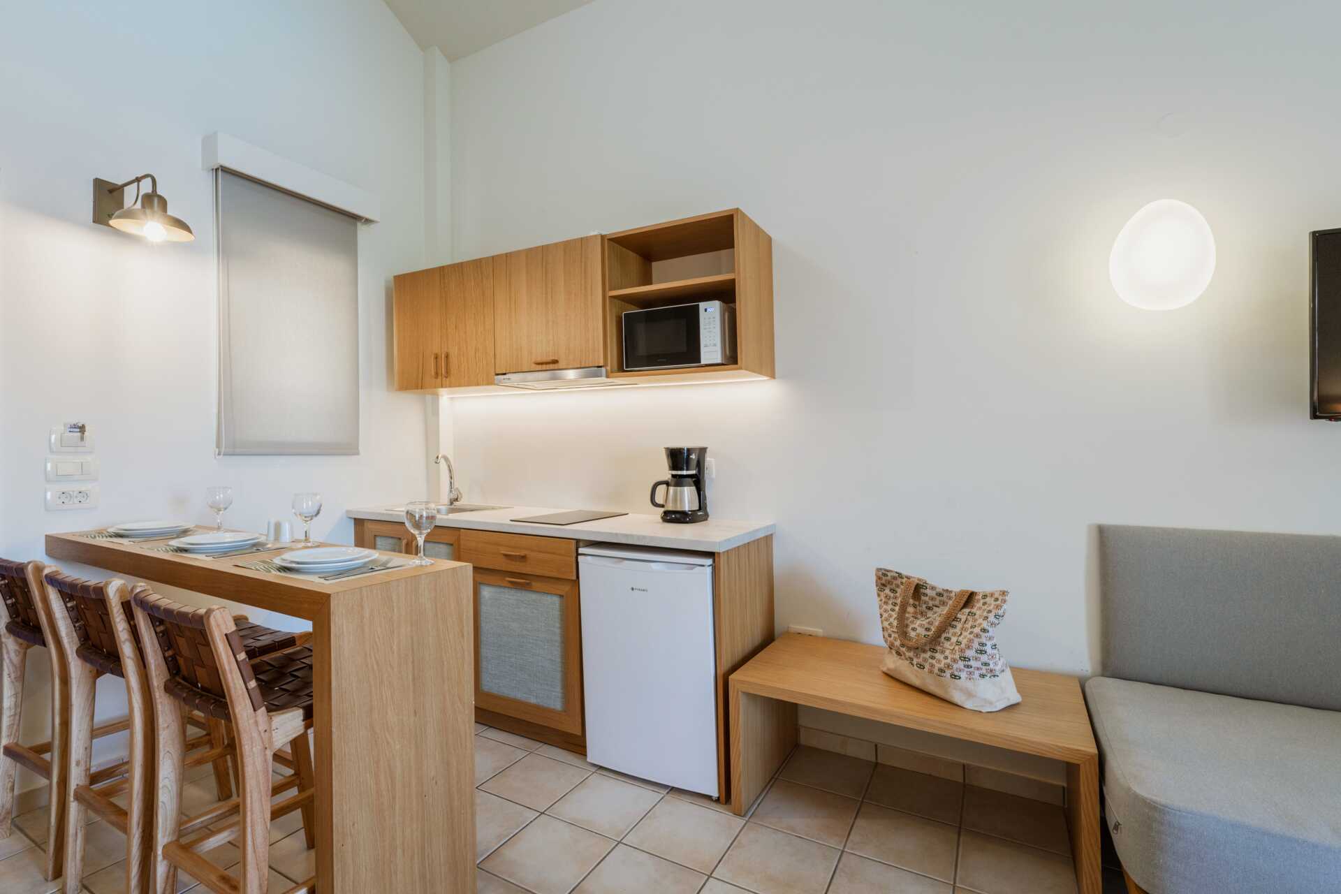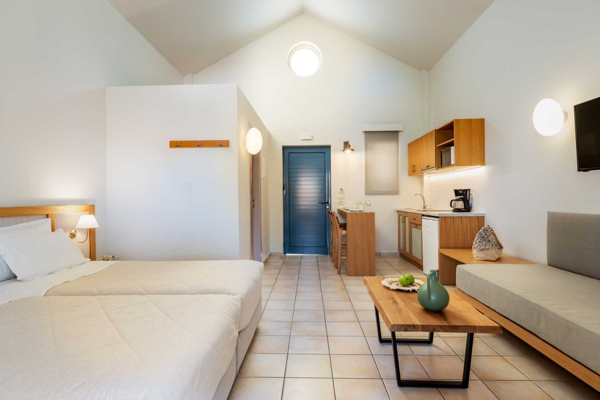 Yksiöitä parvekkeella tai maaparvekkeella, osasta parvekkeita näkymä altaalle. Huoneistoissa, joista on näkymä altaalle, kolmannen henkilön on oltava lapsi. Yhdistetty makuuhuone ja minikeittiö. Kaksi erillistä vuodetta. Mahdollisuus lisävuoteeseen vuodesohvasta. Minikeittiö, jossa keittolevyt, jääkaappi, kahvinkeitin, voileipägrilli ja yksinkertainen keittovarustus. Maksuton wifi, ilmastointi ja tallelokero. Tv paikallisilla kanavilla. Hiustenkuivain. Kylpyhuone suihkulla ja wc. Siivous 6 krt/viikko.
