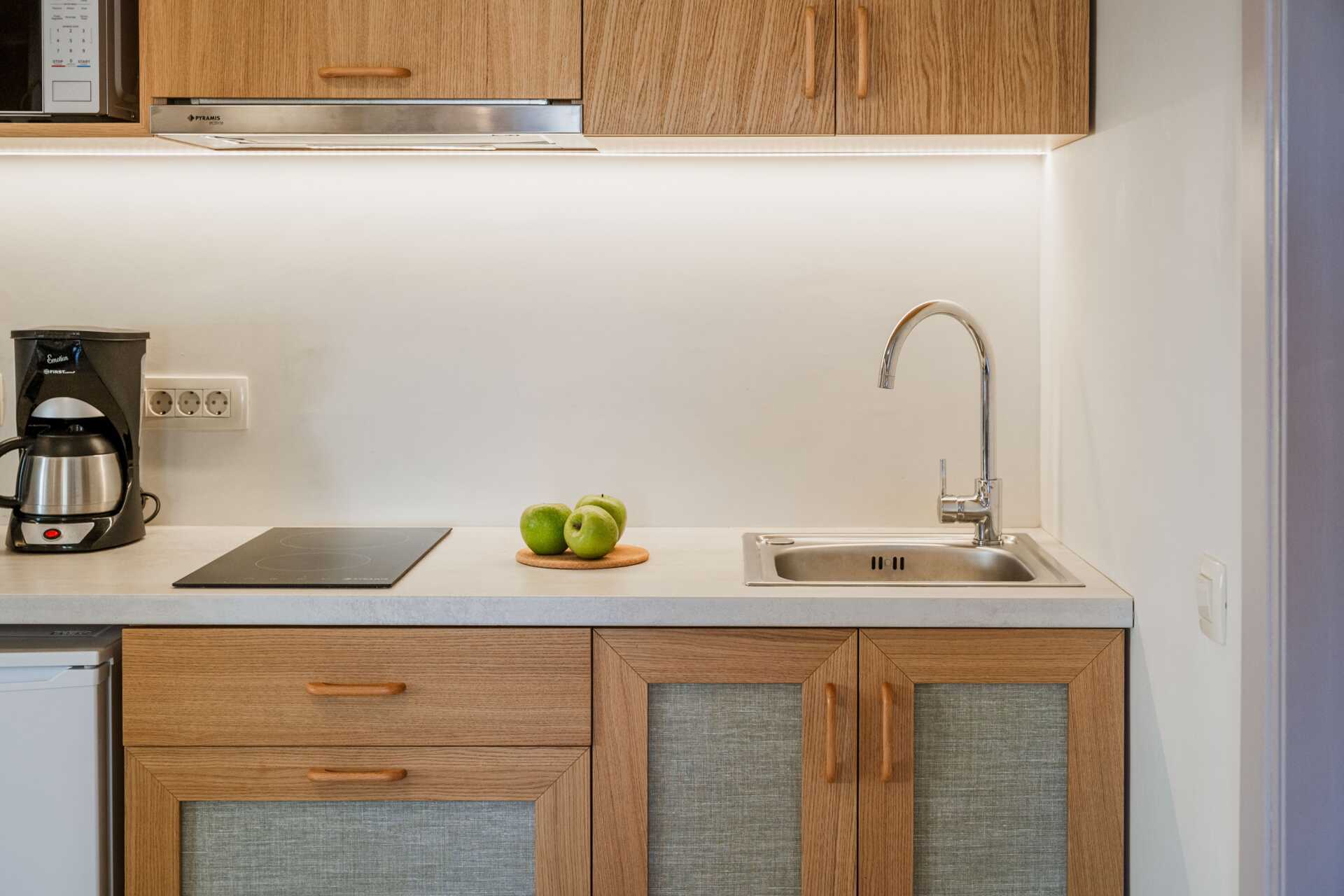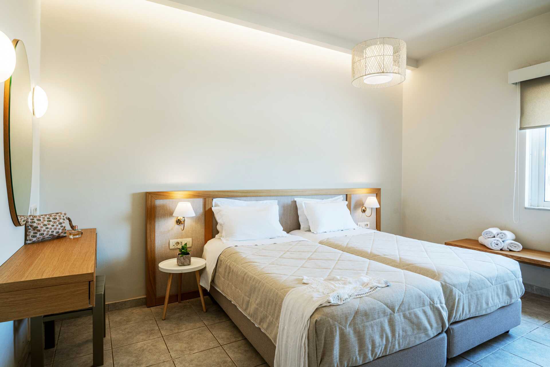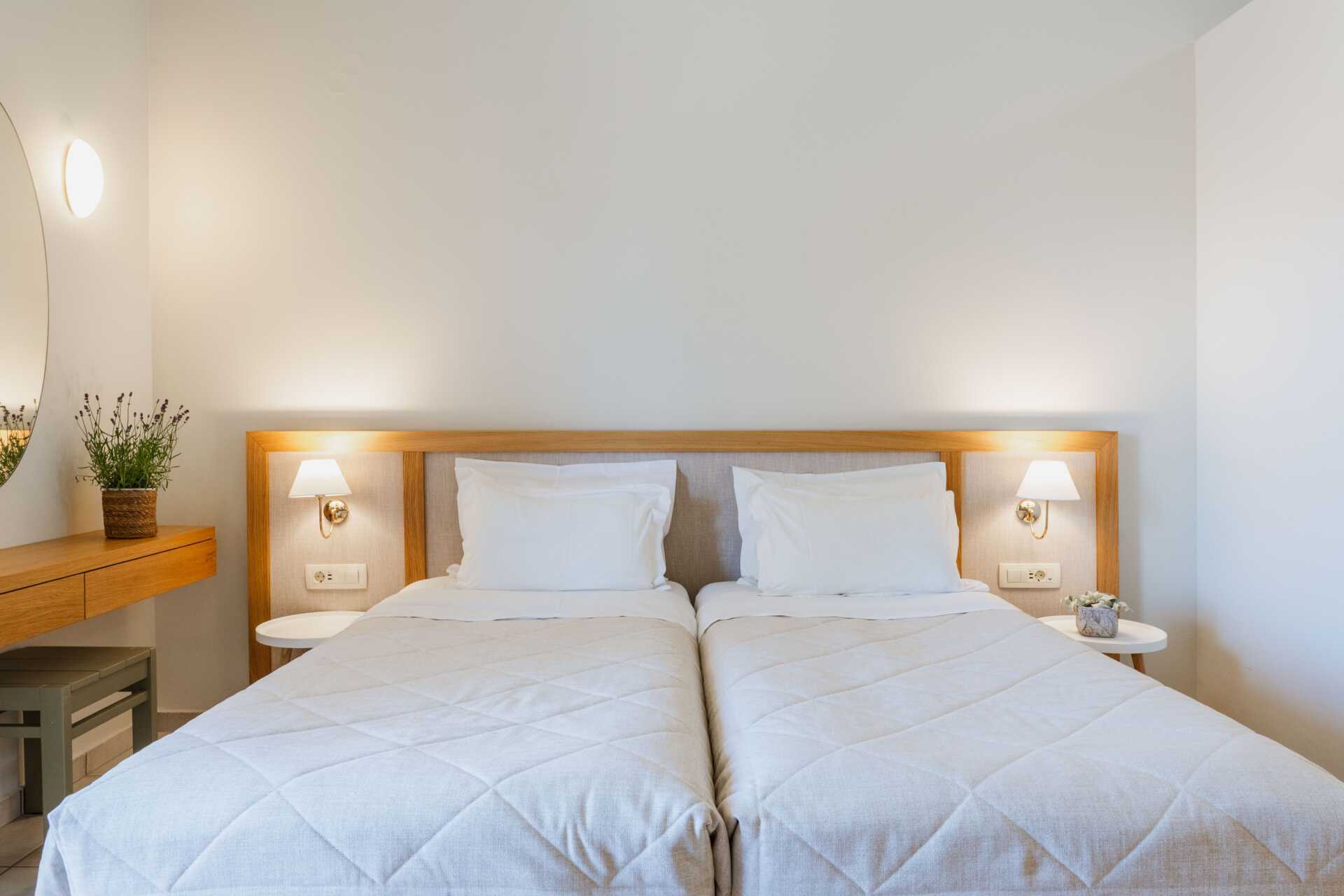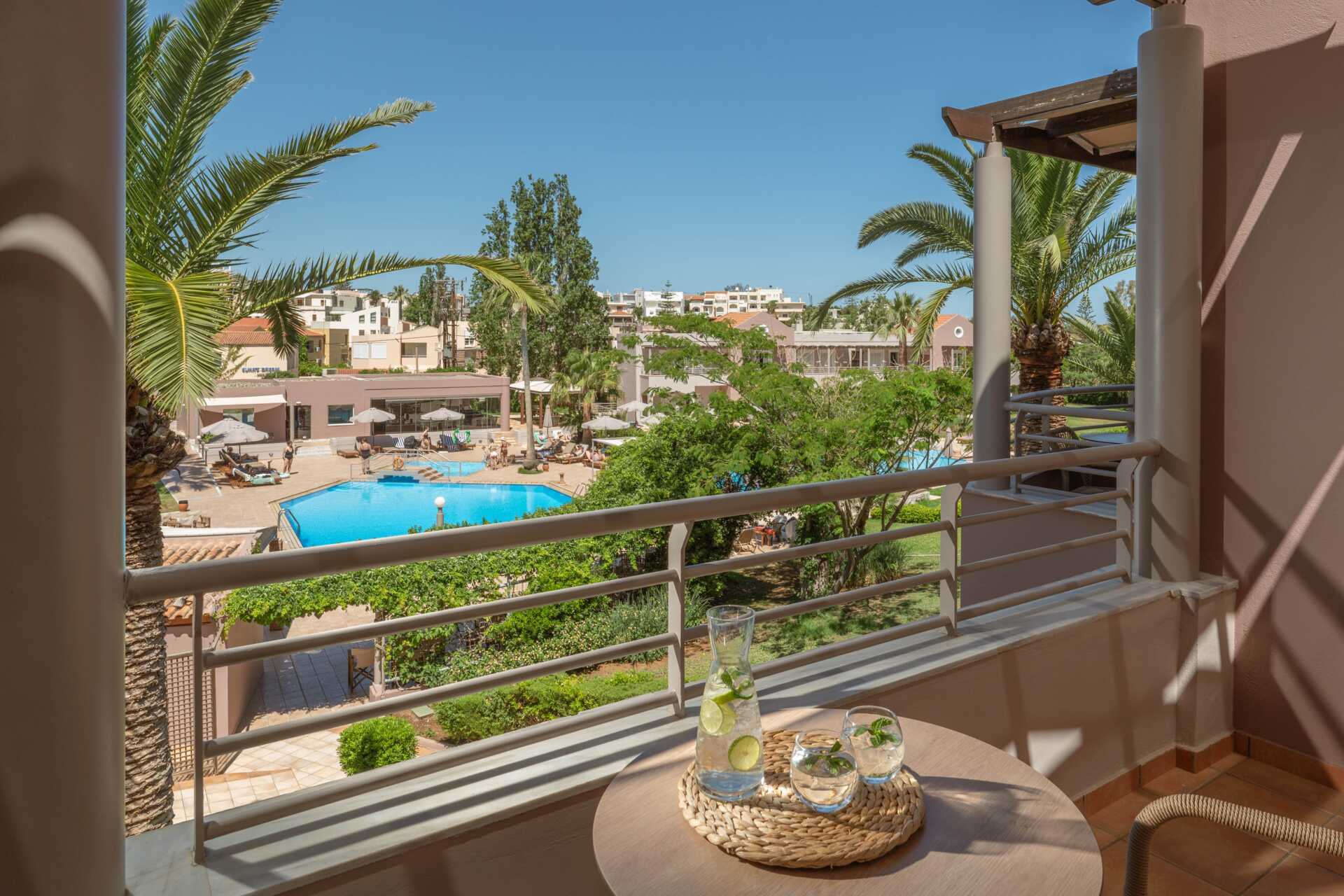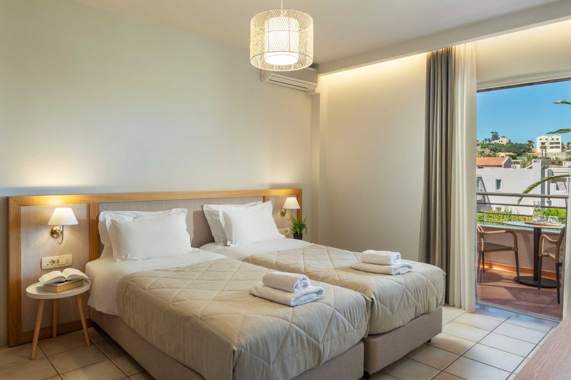 Yksiöitä parvekkeella tai maaparvekkeella, osasta parvekkeita näkymä altaalle. Huoneistoissa, joista on näkymä altaalle, kolmannen henkilön on oltava lapsi. Yhdistetty makuuhuone ja minikeittiö. Kaksi erillistä vuodetta. Mahdollisuus lisävuoteeseen vuodesohvasta. Minikeittiö, jossa keittolevyt, jääkaappi, kahvinkeitin, voileipägrilli ja yksinkertainen keittovarustus. Maksuton wifi, ilmastointi ja tallelokero. Tv paikallisilla kanavilla. Hiustenkuivain. Kylpyhuone suihkulla ja wc. Siivous 6 krt/viikko.