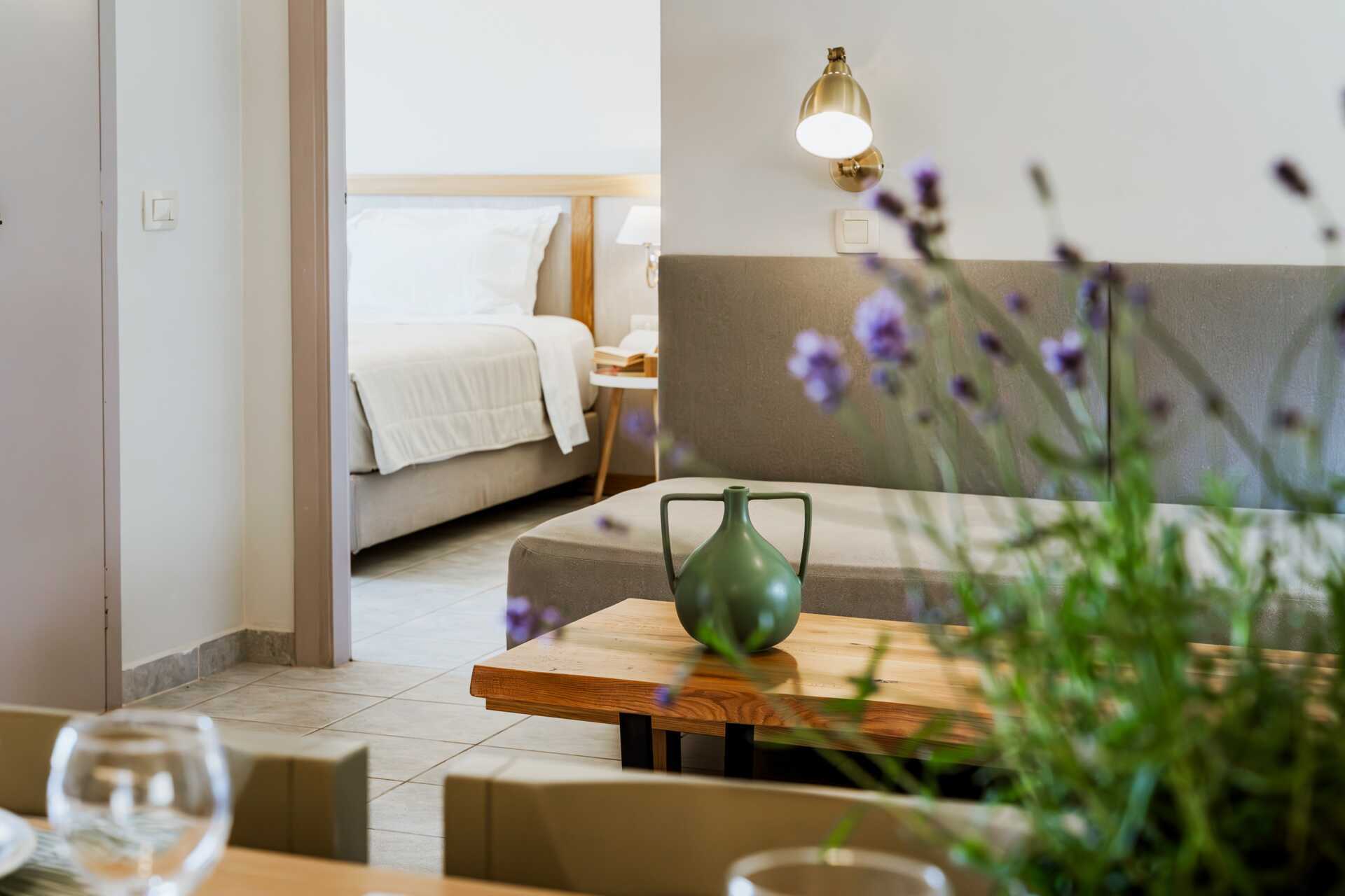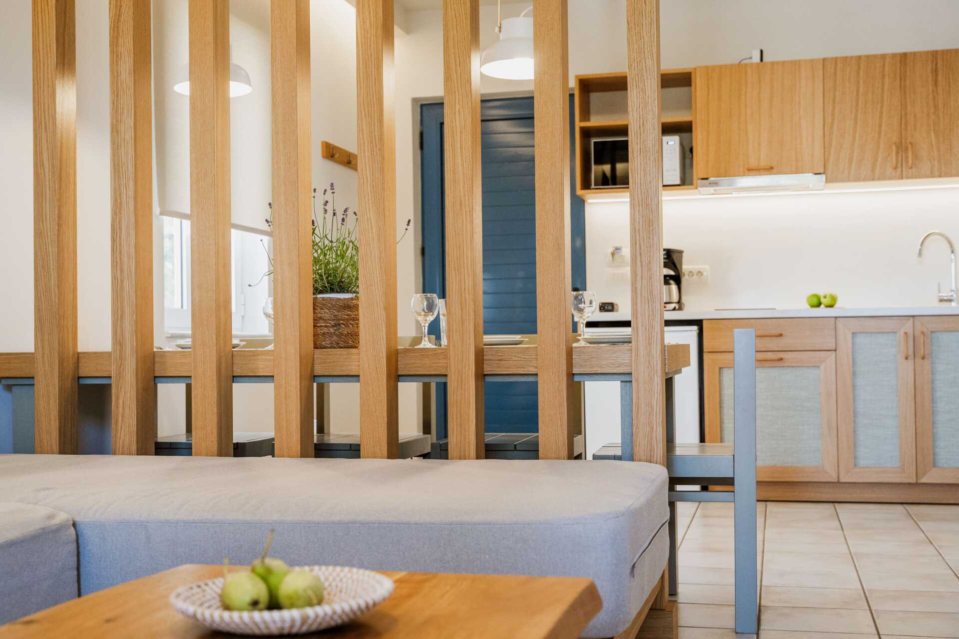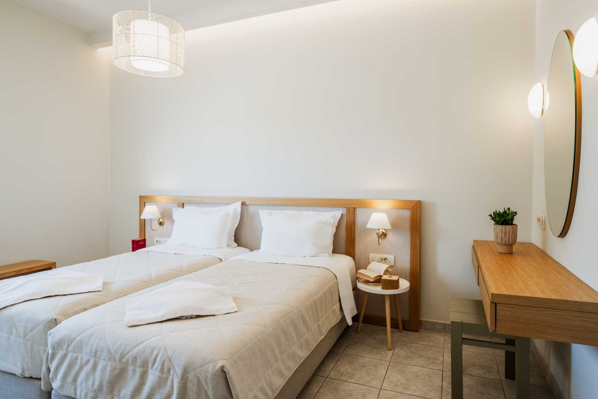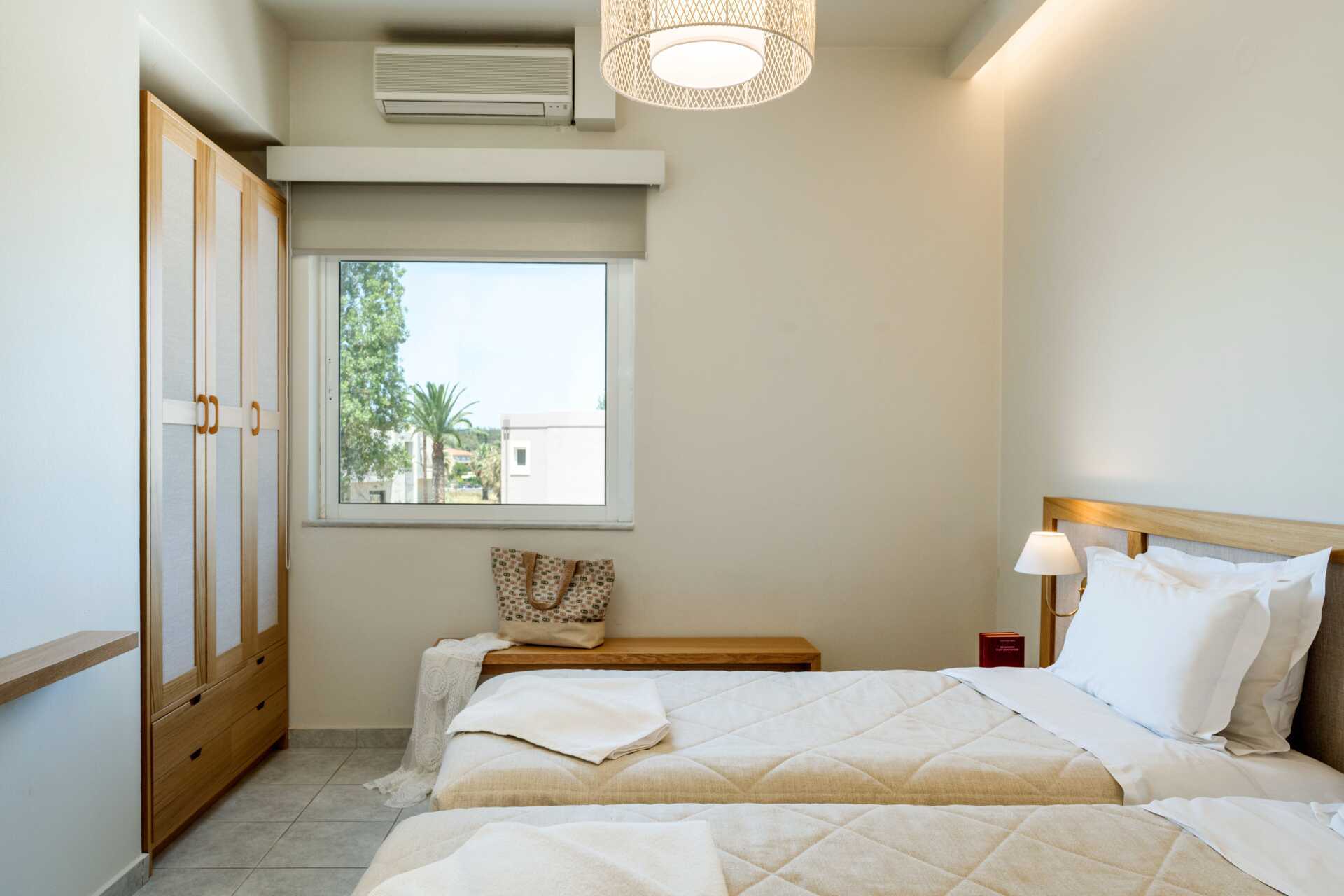 Kaksio parvekkeella tai maaparvekkeella, osassa näköala altaalle. Makuuhuone sekä yhdistetty olohuone ja minikeittiö. Parivuode tai kaksi yhden hengen sänkyä. Lisävuodemahdollisuus vuodesohvasta. Minikeittiössä keittolevyt, jääkaappi, kahvinkeitin, vedenkeitin, voileipägrilli ja yksinkertainen keittiövarustus. Maksuton wifi, ilmastointi ja tallelokero. Tv paikallisilla kanavilla. Hiustenkuivain. Suihku ja wc. Siivous 6 krt/viikko.